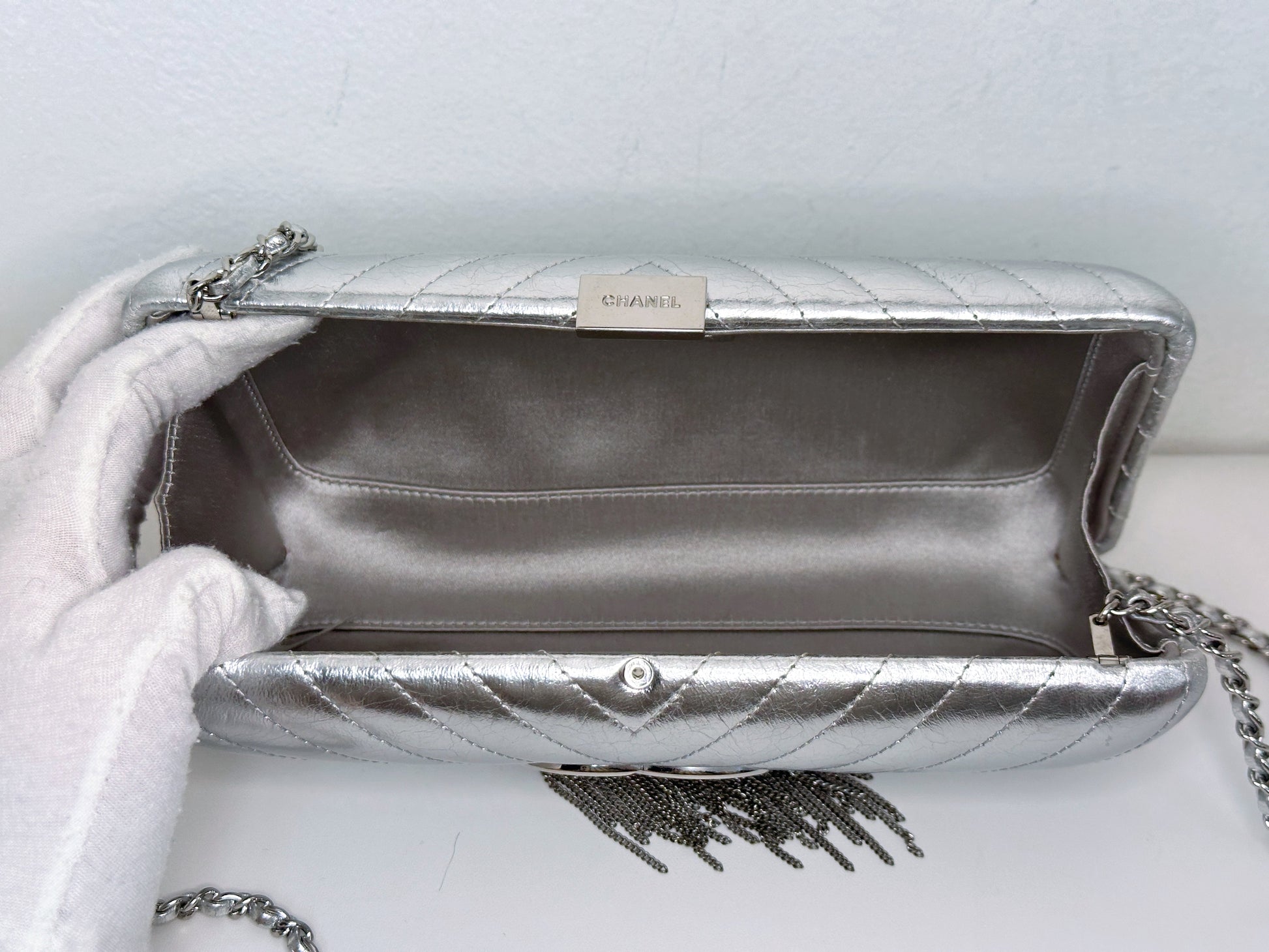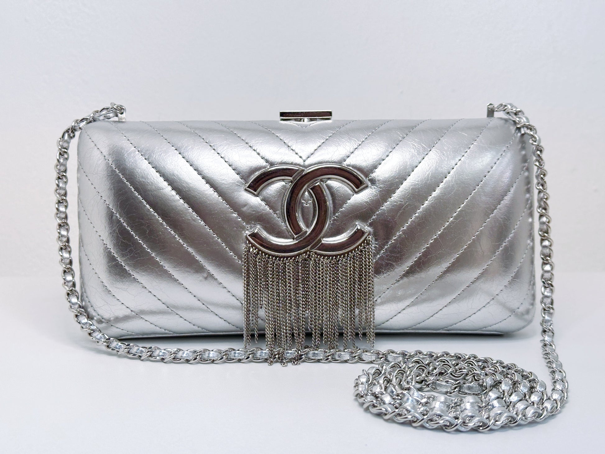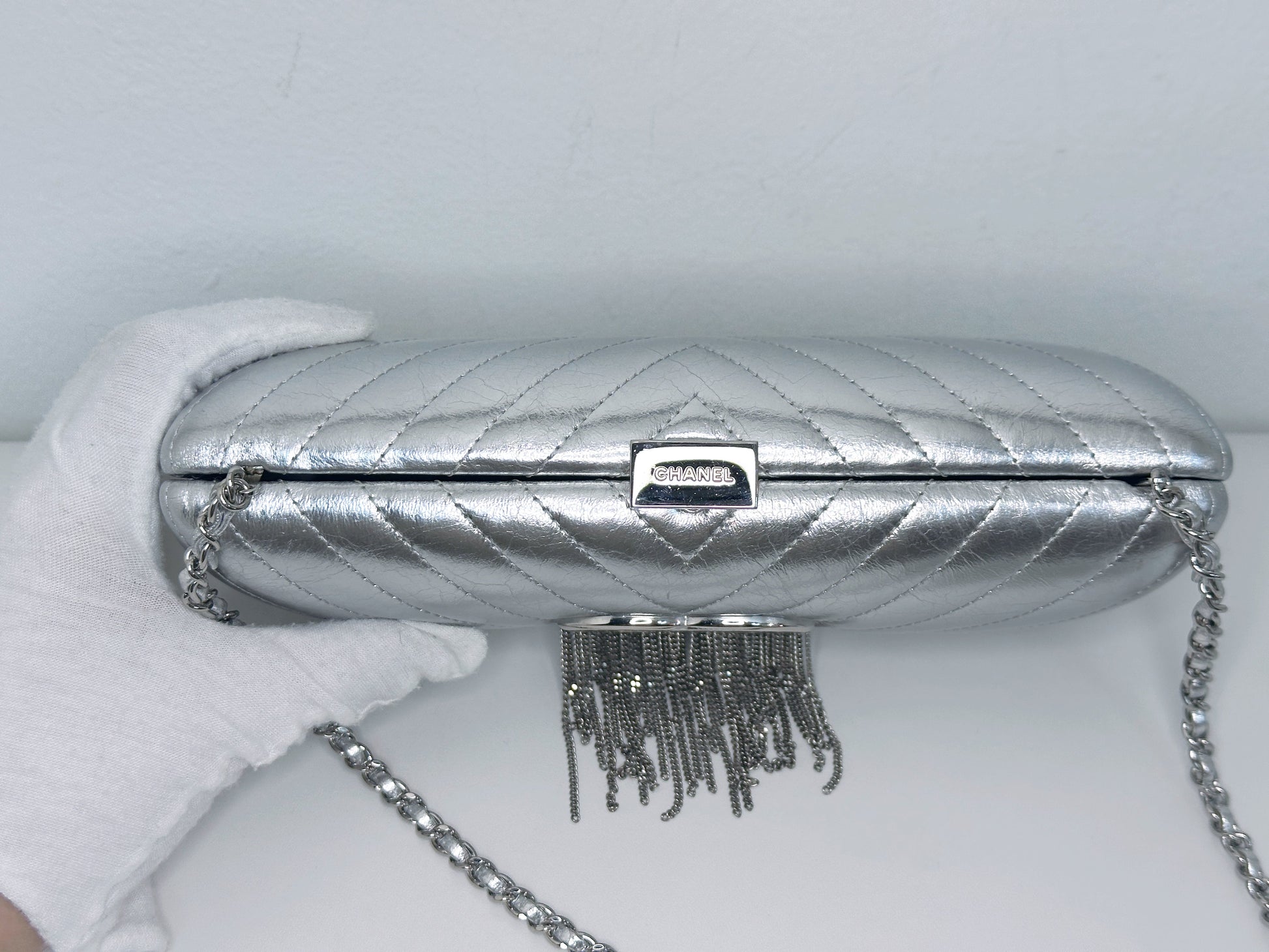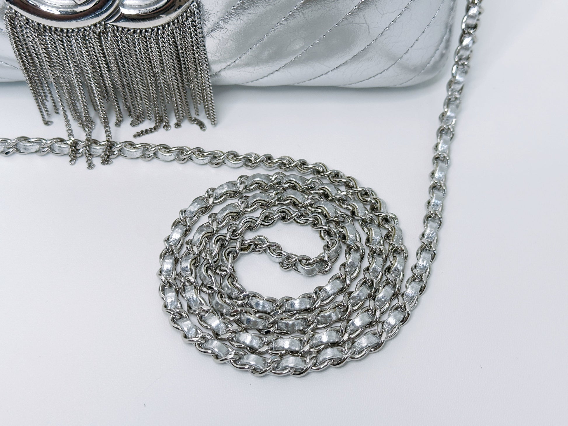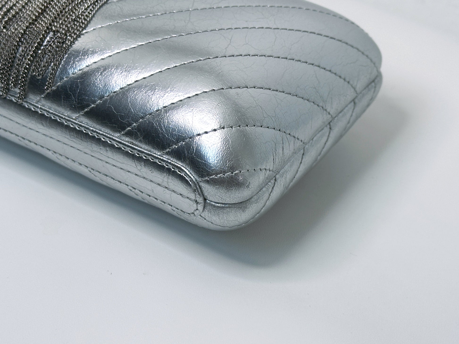 Chanel Silver Chain Fringe Leather Clutch Bag Silvery 2572 holo