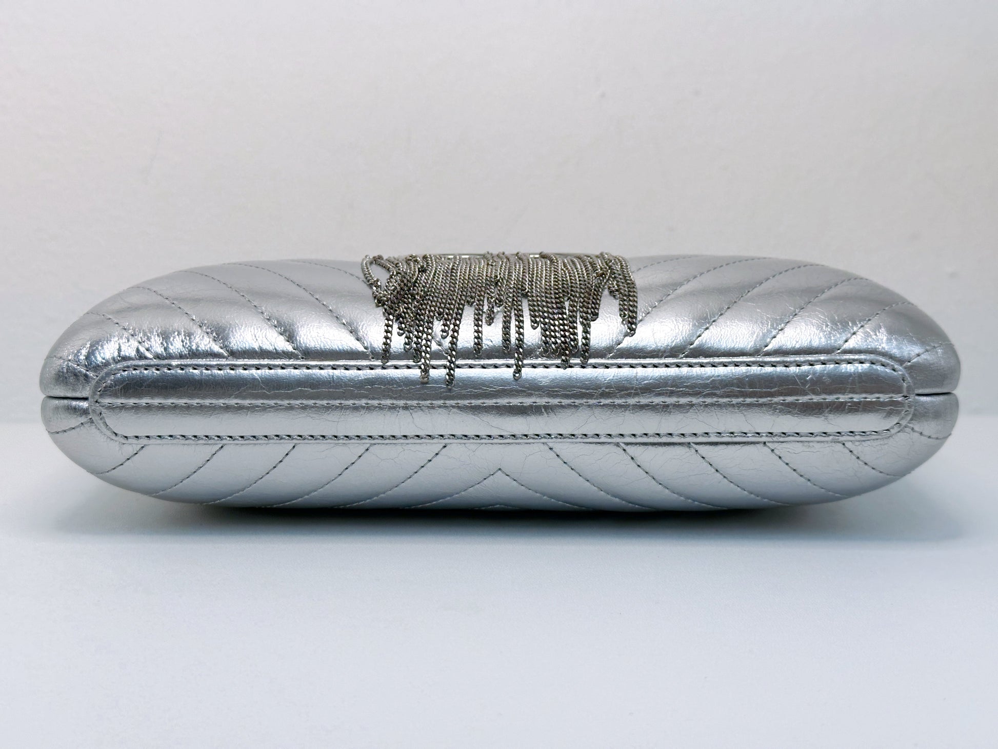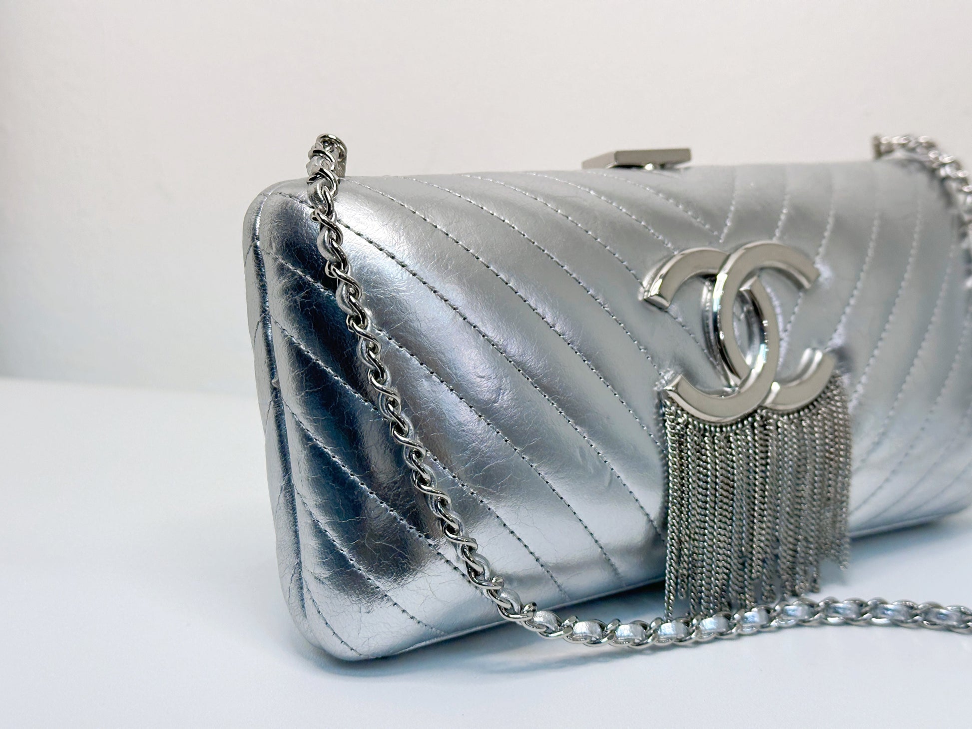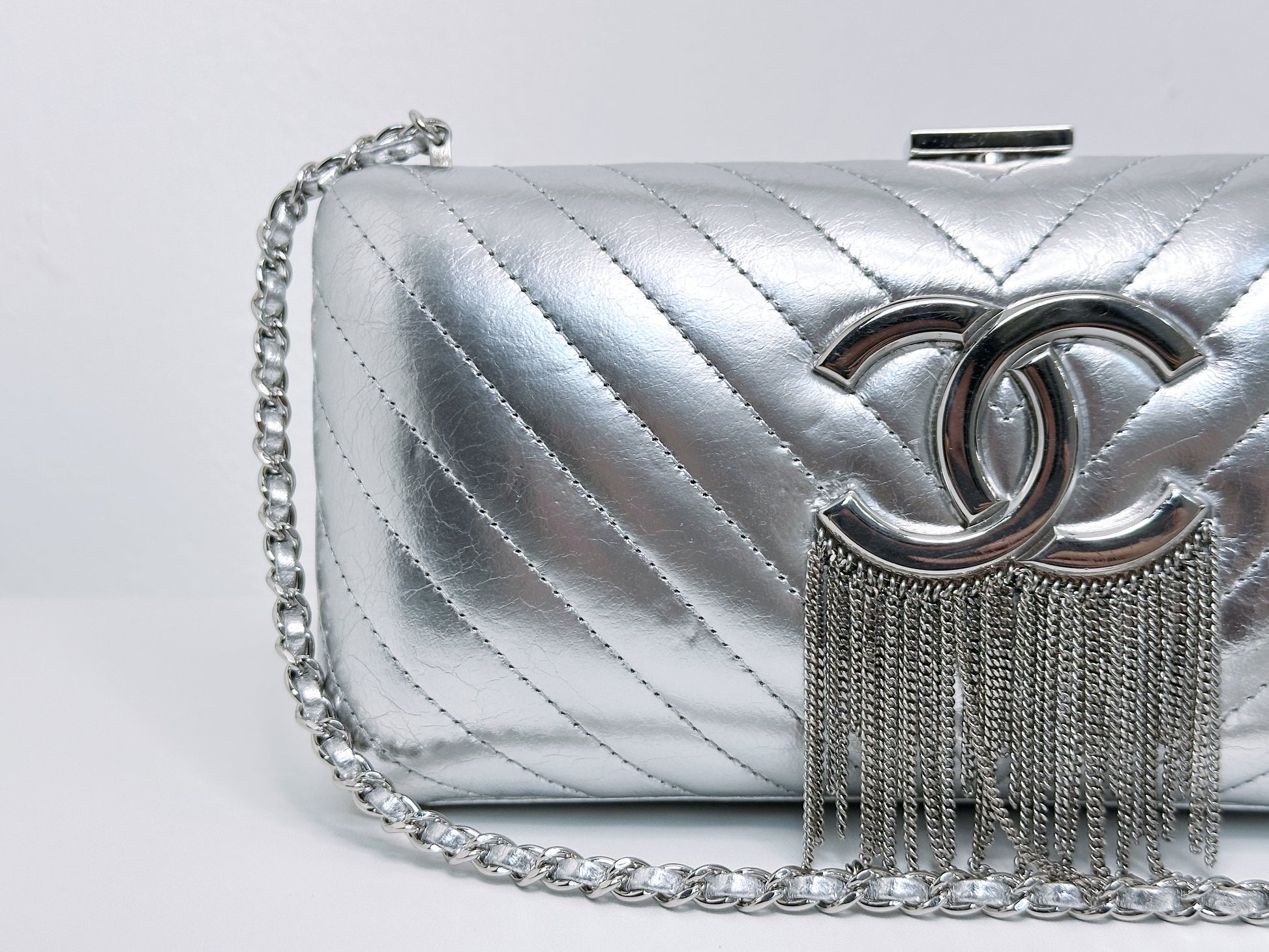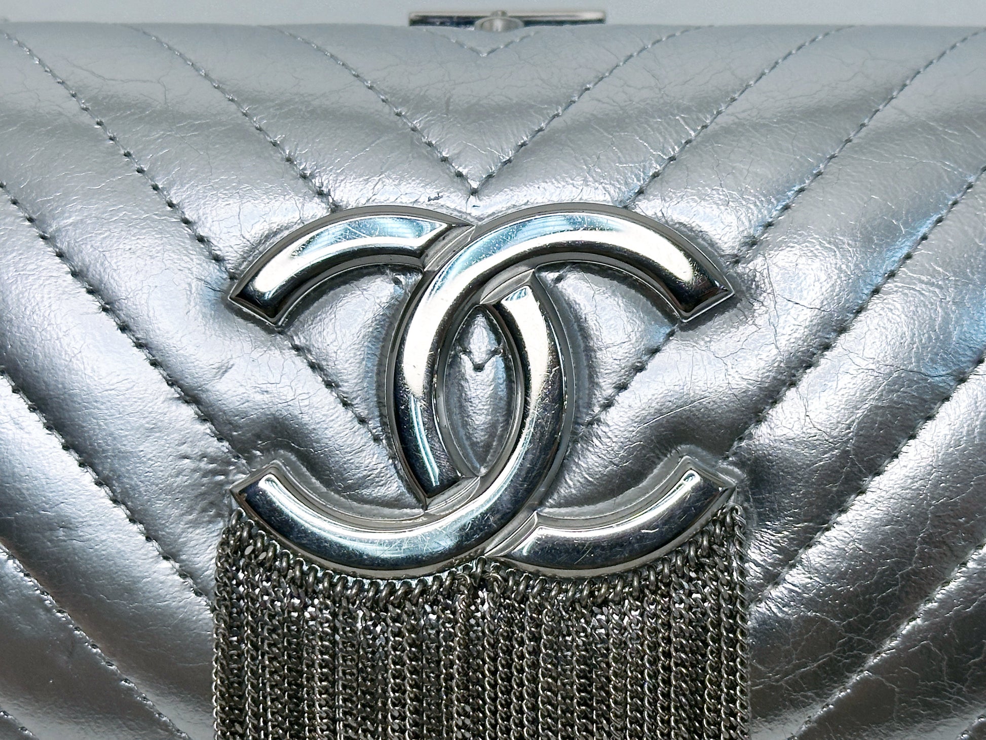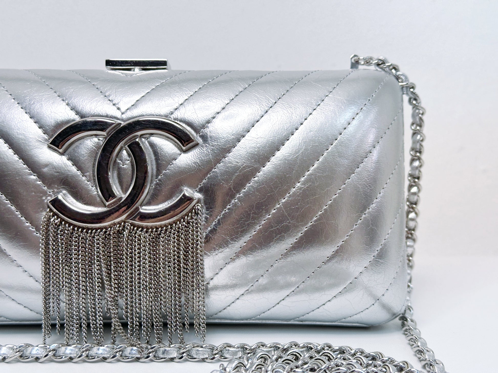 Chanel Silver Chain Fringe Leather Clutch Bag Silvery 2572 holo
