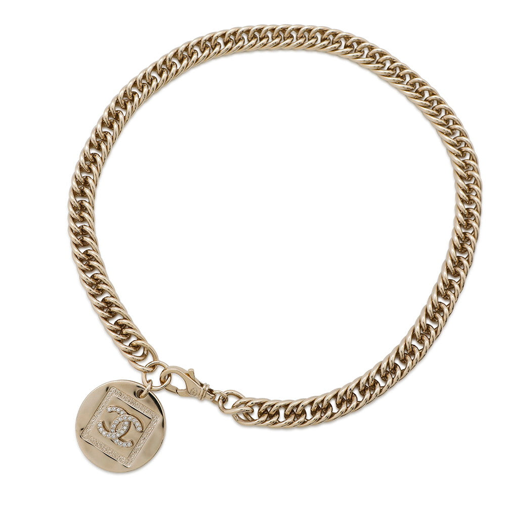 CHANEL Choker Necklace CC Logo Round Plate Gold Metal Rhinestone