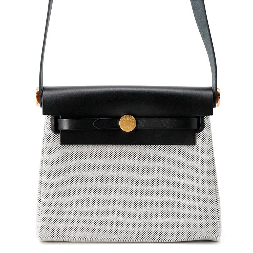 HERMES Herbag zip Ecru/Black Toile Military Vache Hunter Leather Size Mini