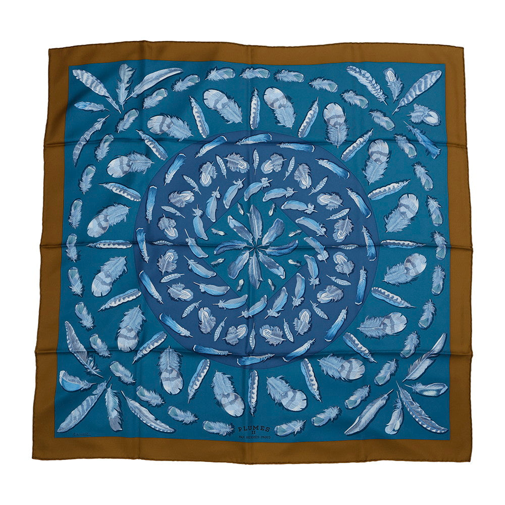 HERMES Carre Plumes II Feather Size 90 Brown/Blue Silk100%