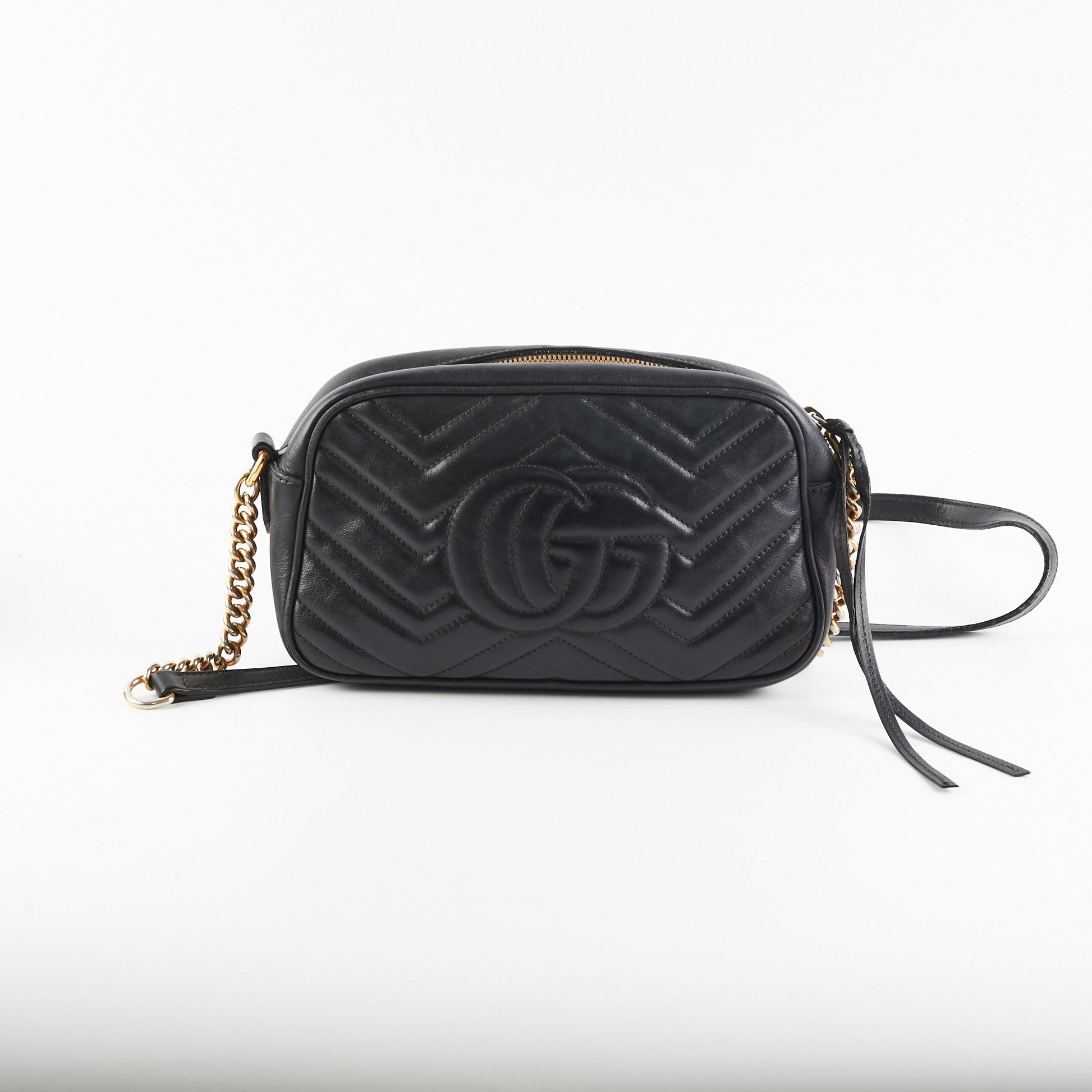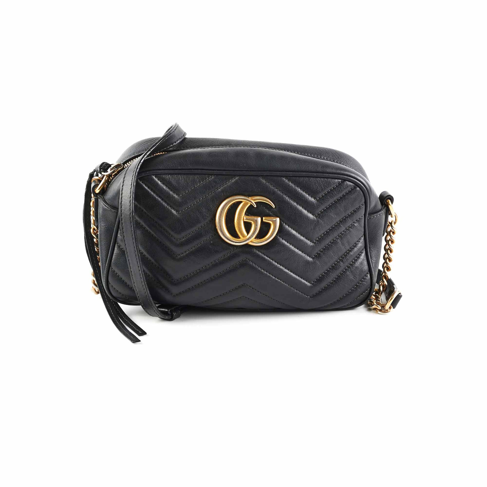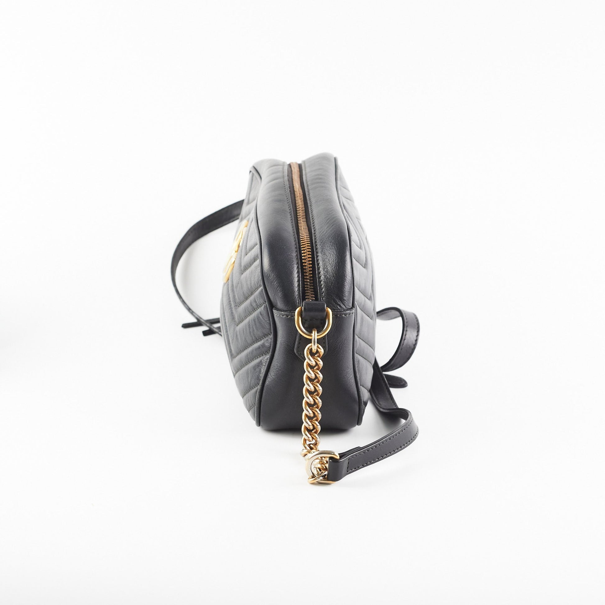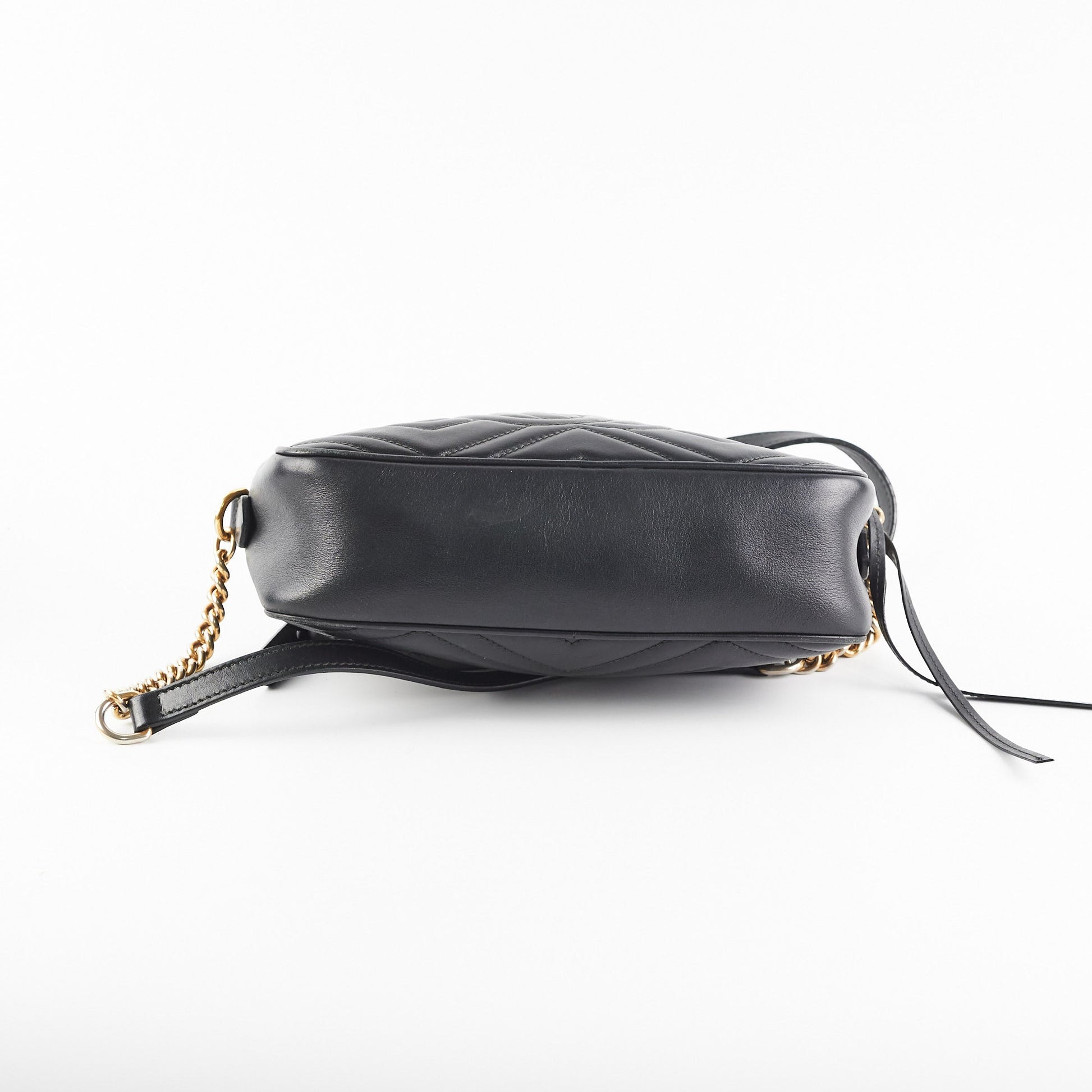 Condition: 8/10 Good Condition - Tarnishing on GG, wrinkles on leather throughout, stains inside, lose thread on the strap
