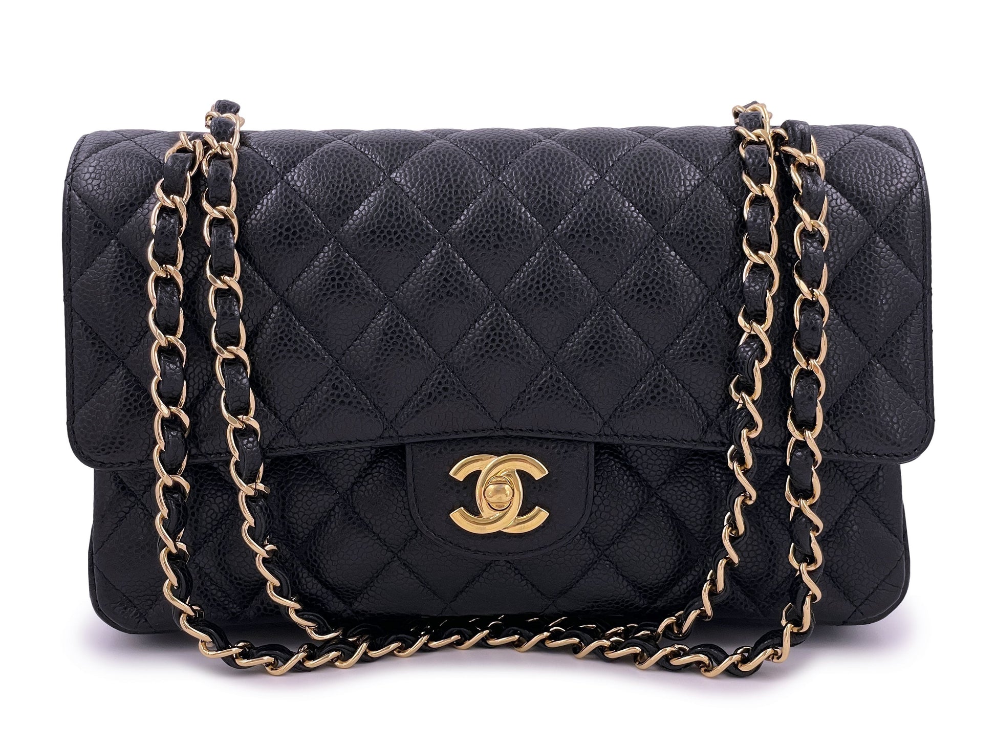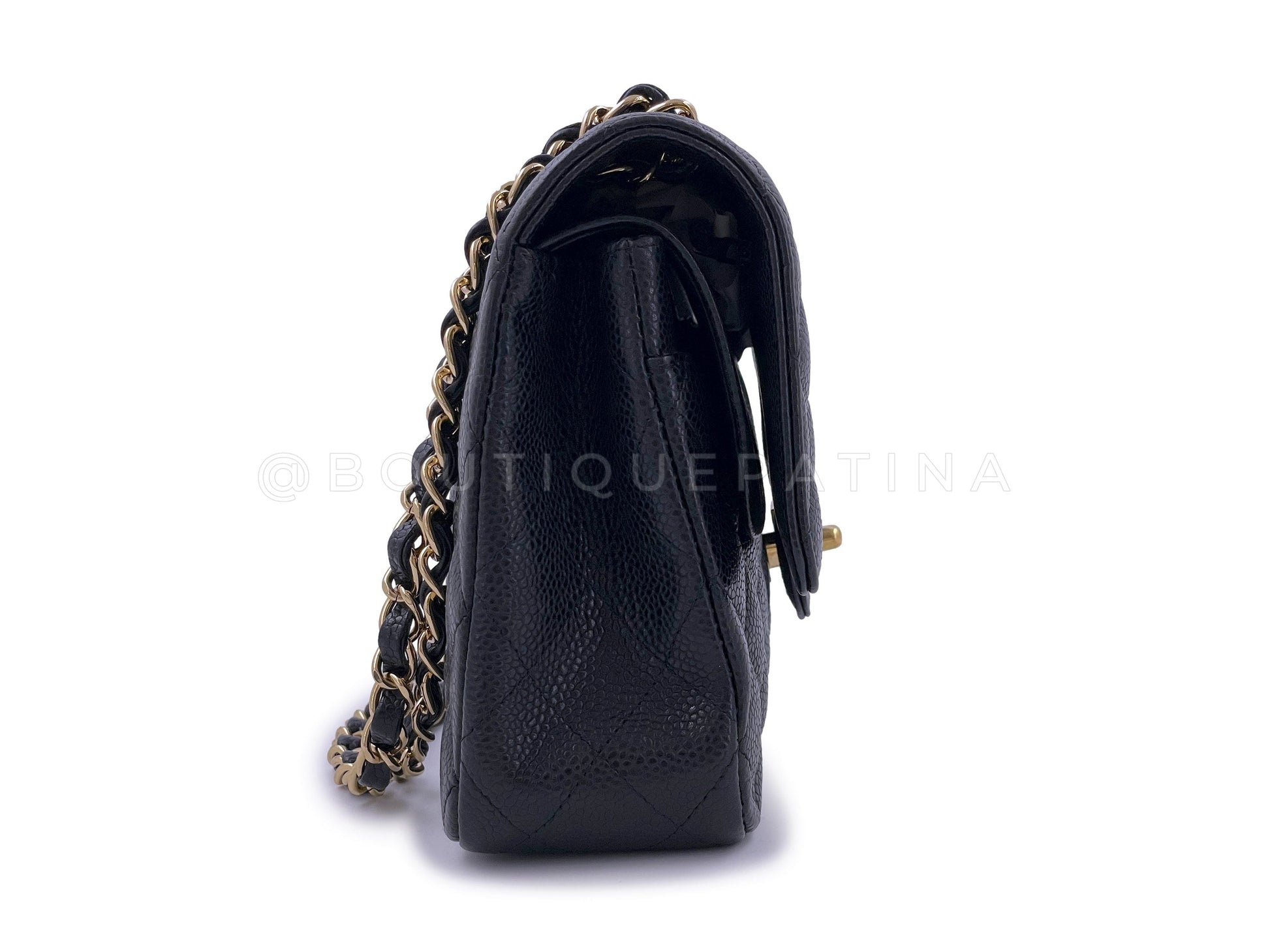 In caviar leather and gold hardware. In caviar leather, the classic flap is durable with the pebbled grain nodes of calfskin leather. Boutique Patina specializes in sourcing and curating the best condition preowned vintage Chanel leather treasures by searching closets around the world.