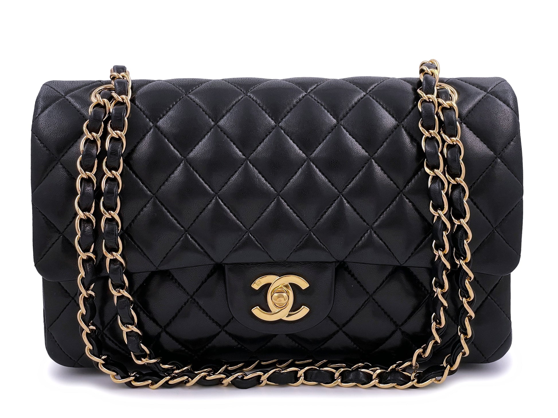 In Black lambskin leather and 24k gold plated hardware. In lambskin leather, the original classic flap in all its glory with its petal soft quilts, true luxury. Boutique Patina specializes in sourcing and curating the best condition preowned vintage Chanel leather treasures by searching closets around the world.