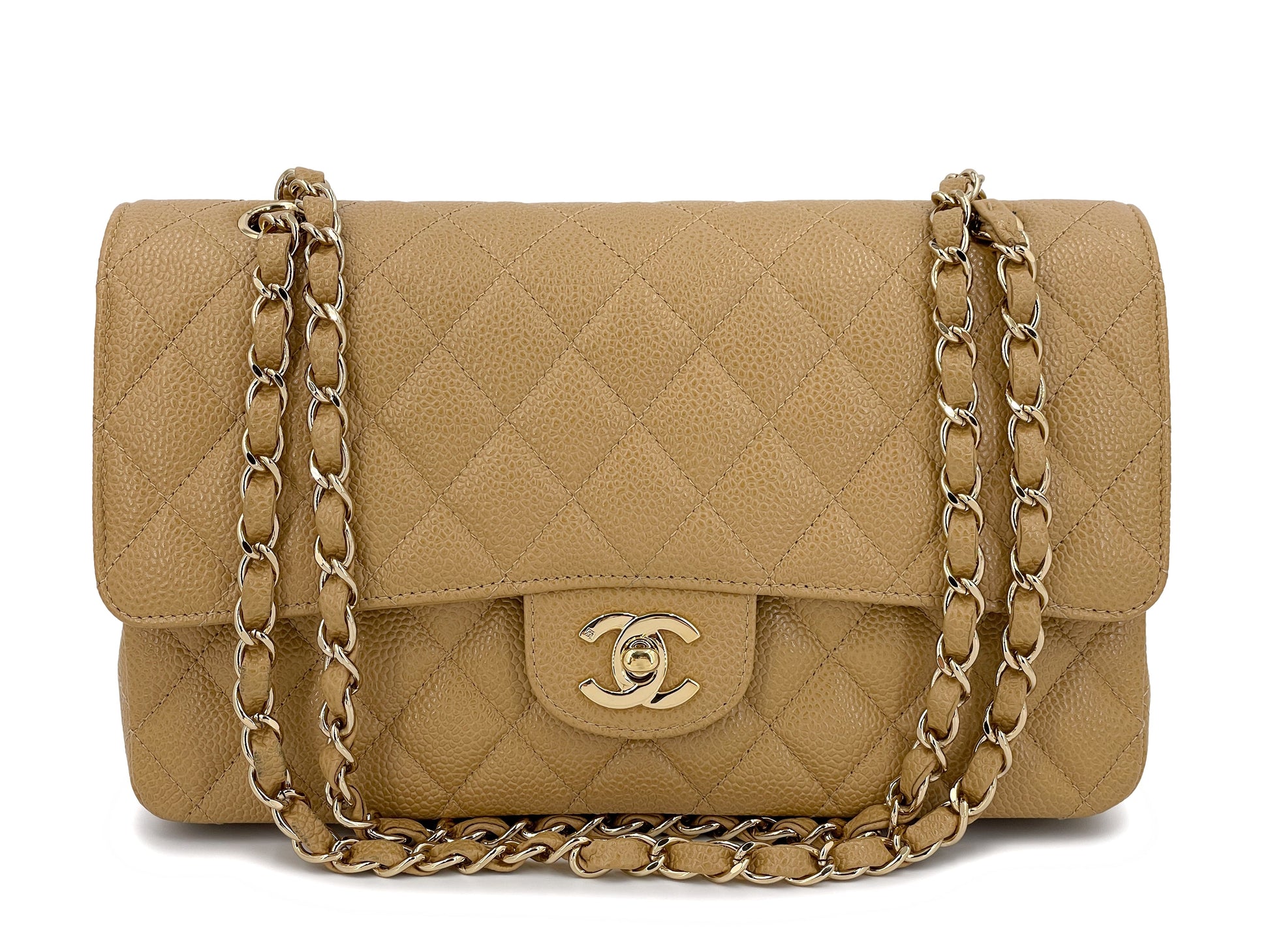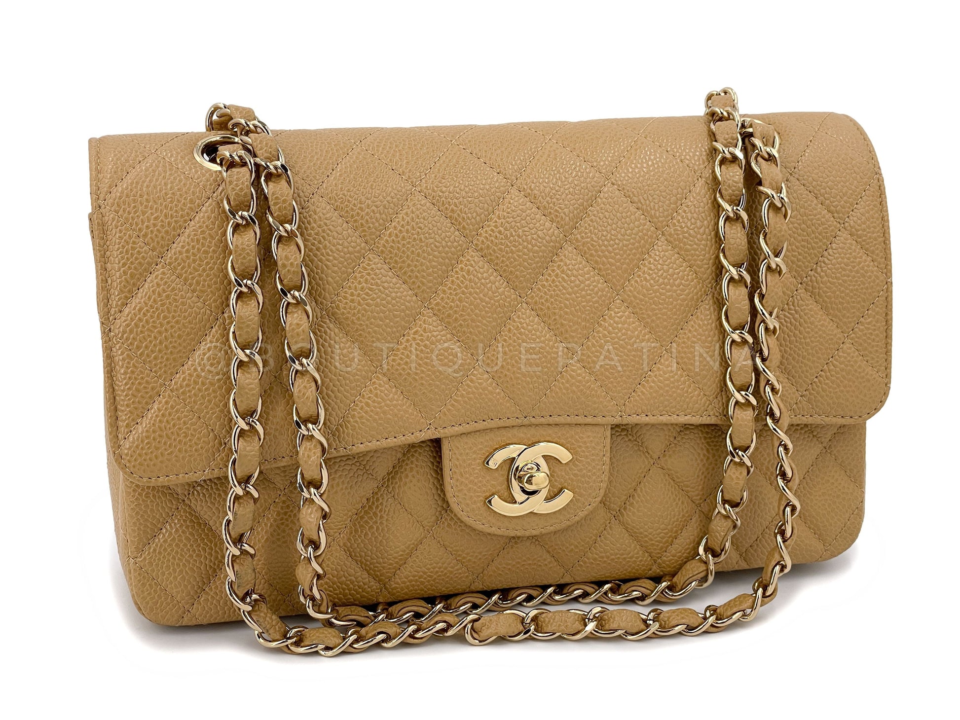In Caramel Beige caviar leather and 24k gold plated hardware. In caviar leather, the classic flap is durable with the pebbled grain nodes of calfskin leather.