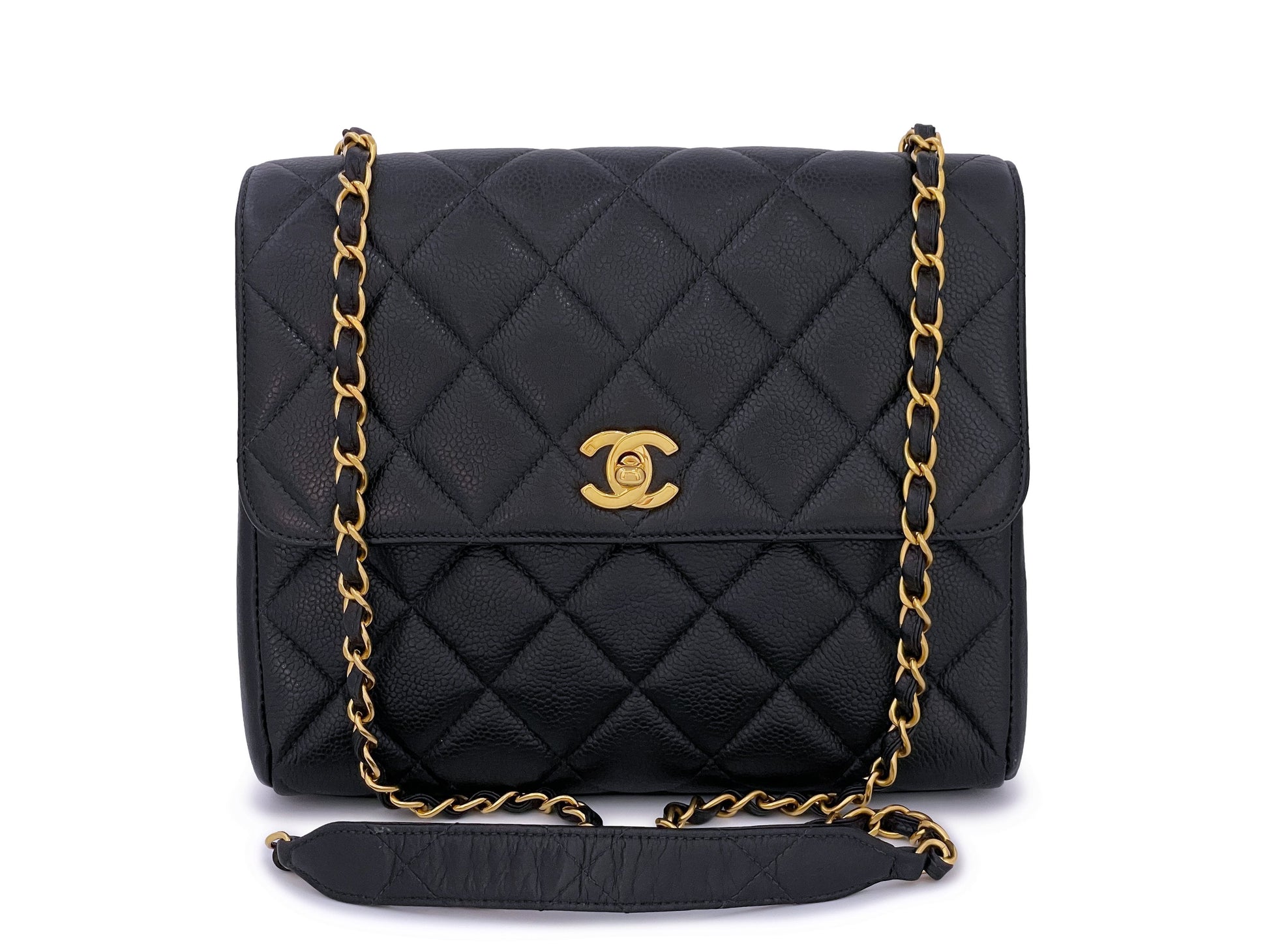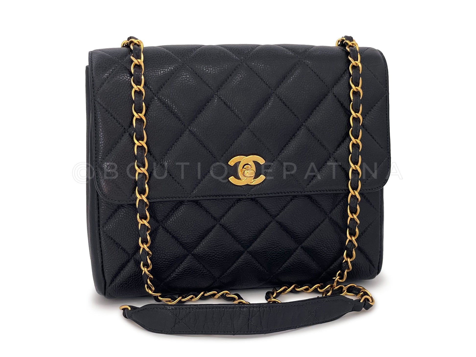 In Black caviar leather and 24k gold plated hardware. Boutique Patina specializes in sourcing and curating the best condition preowned vintage Chanel leather treasures by searching closets around the world.
