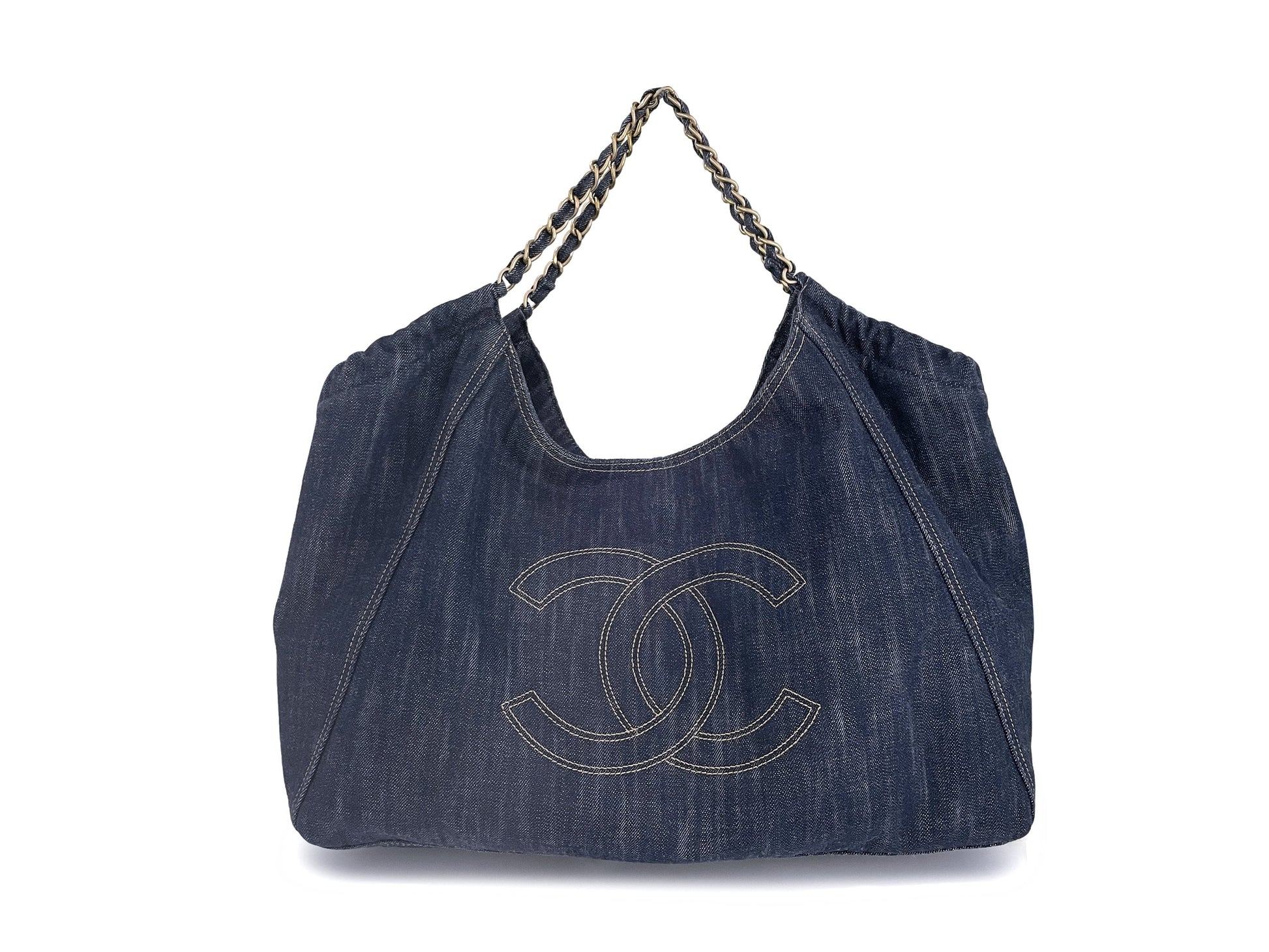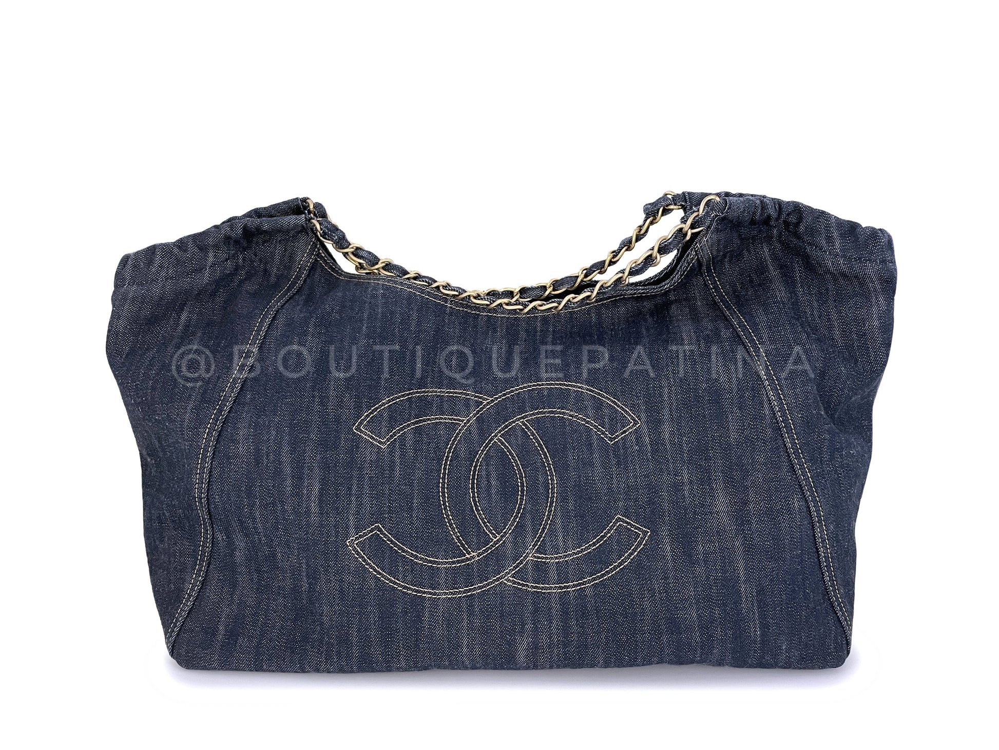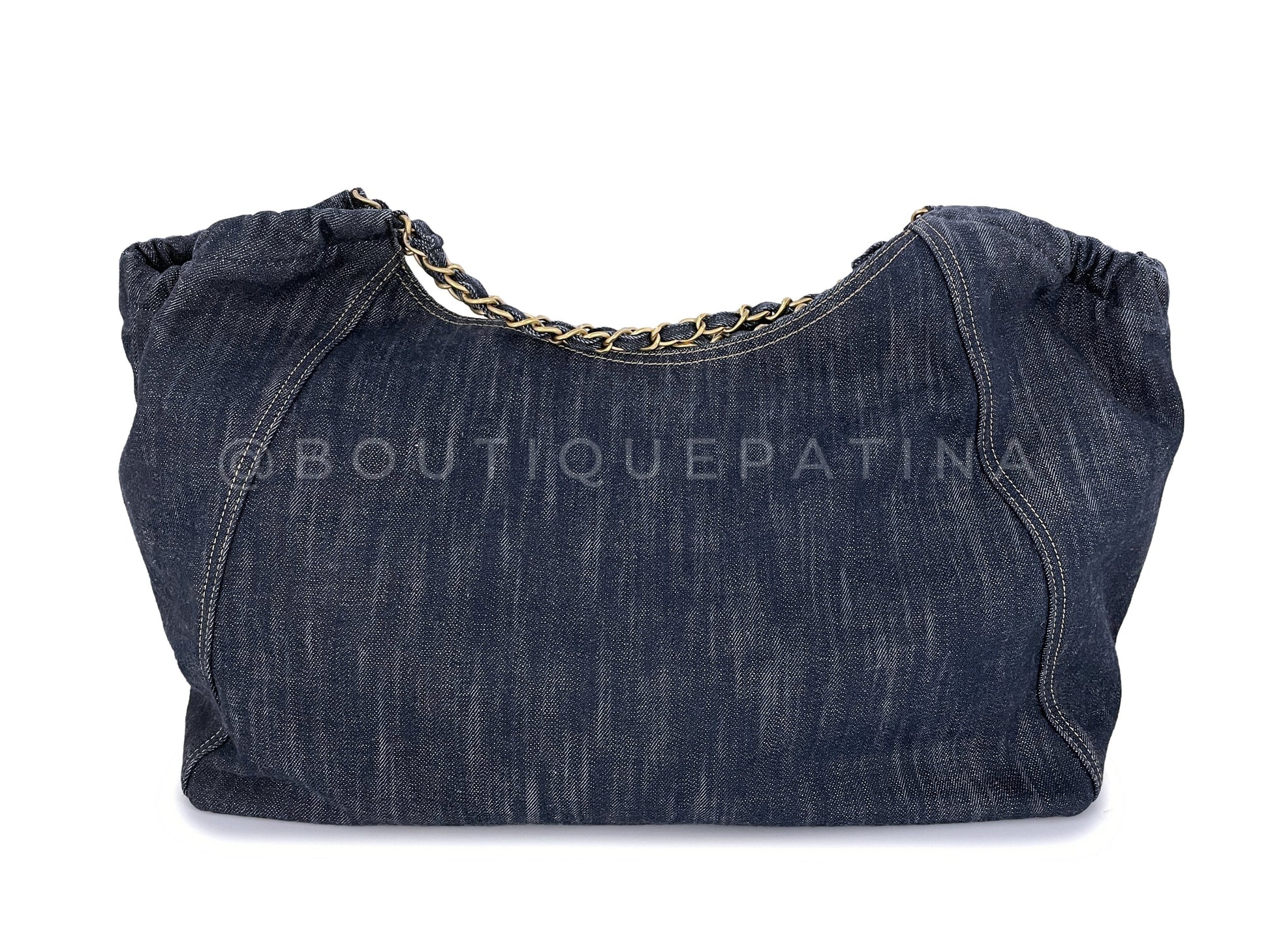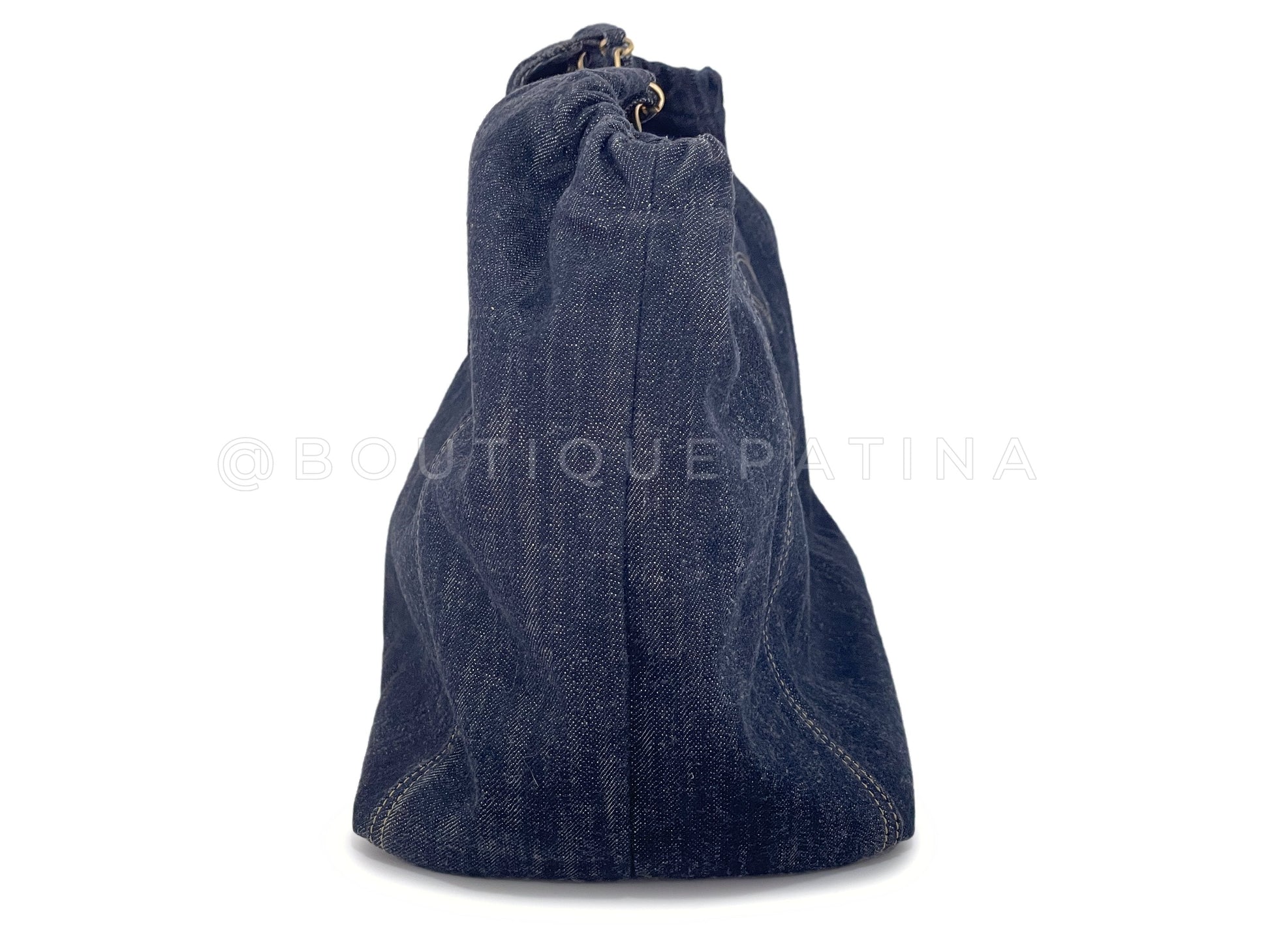 In dark blue denim denim canvas and brushed gold hardware. Boutique Patina specializes in sourcing and curating the best condition preowned vintage Chanel leather treasures by searching closets around the world.
