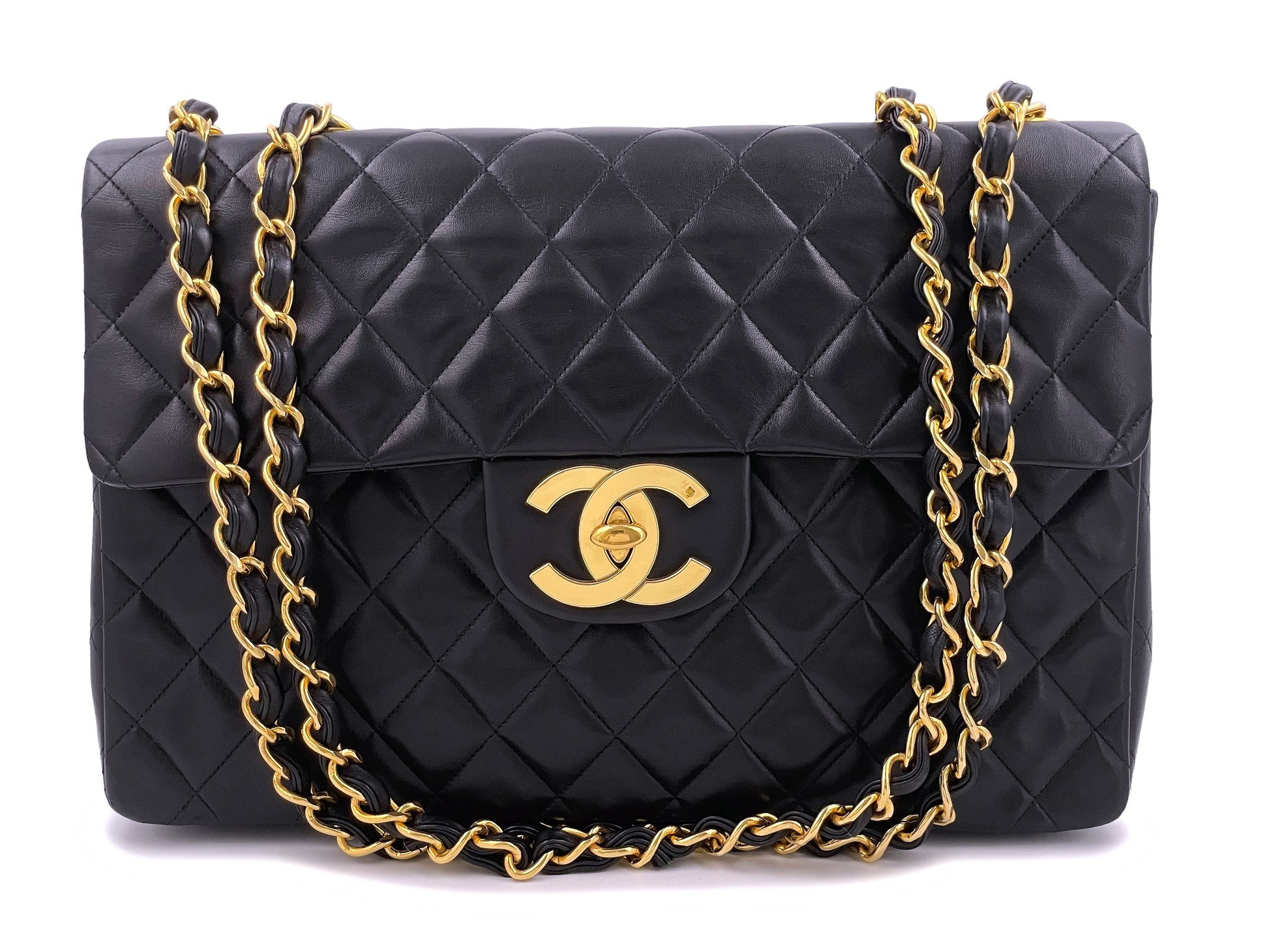 This is the maxi-sized (13 inch) model of the bag -- this bag comes in lambskin in both the 12 and 13 inch sizes. Also called the "Jumbo XL." Boutique Patina specializes in sourcing and curating the best condition preowned vintage Chanel leather treasures by searching closets around the world.