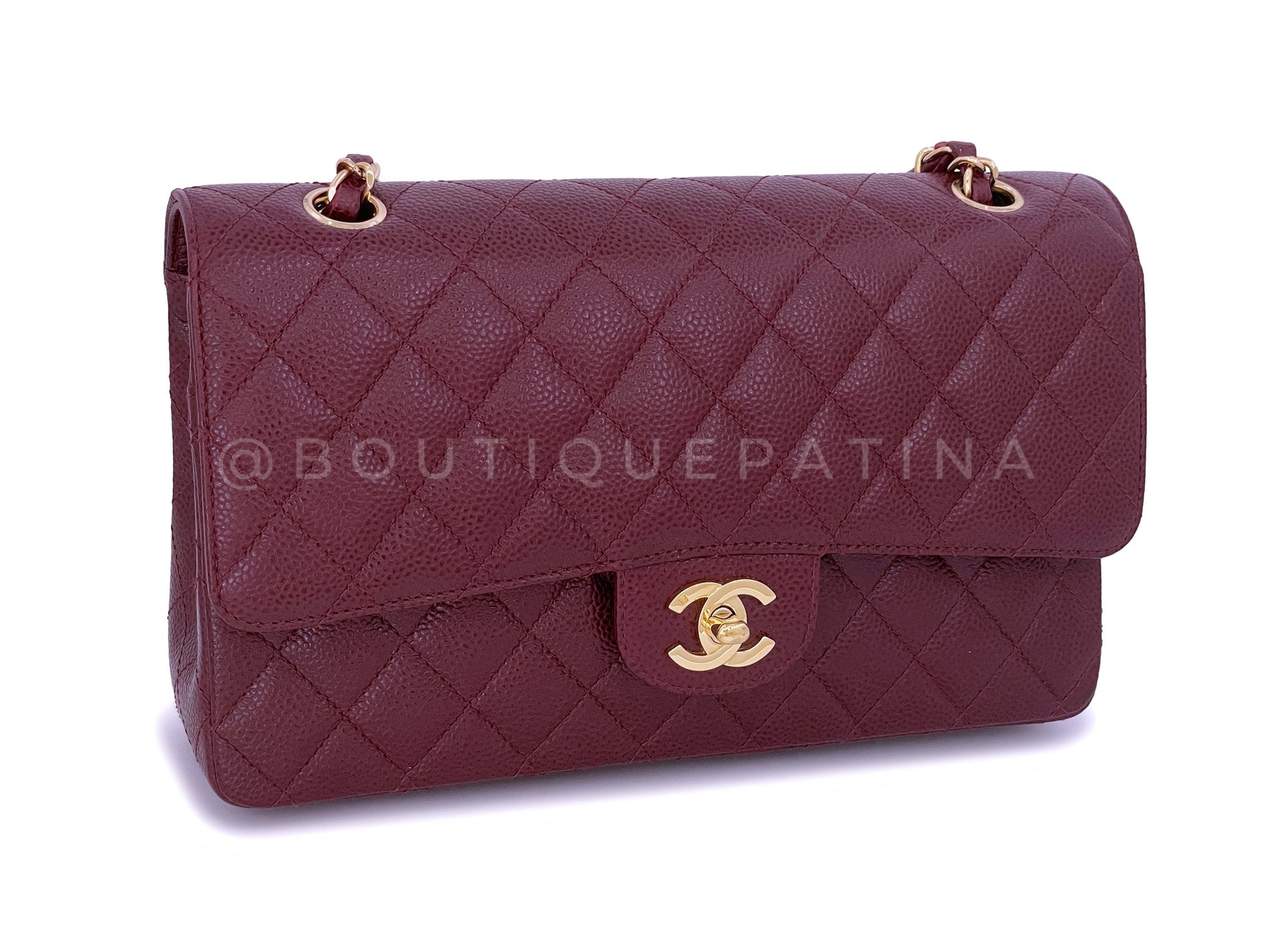 In burgundy wine red caviar leather and 24k gold plated hardware. In caviar leather, the classic flap is durable with the pebbled grain nodes of calfskin leather. Boutique Patina specializes in sourcing and curating the best condition preowned vintage Chanel leather treasures by searching closets around the world.