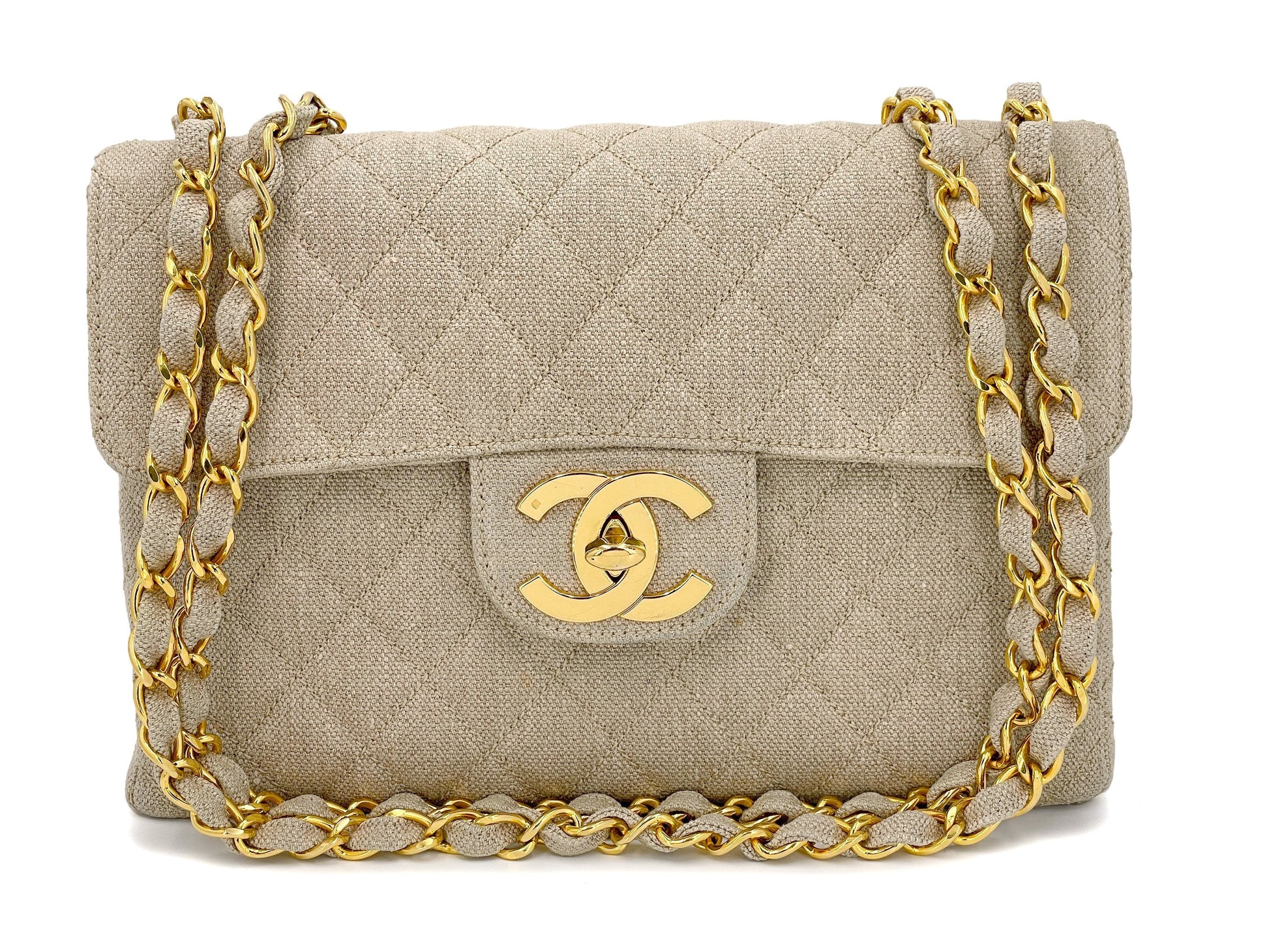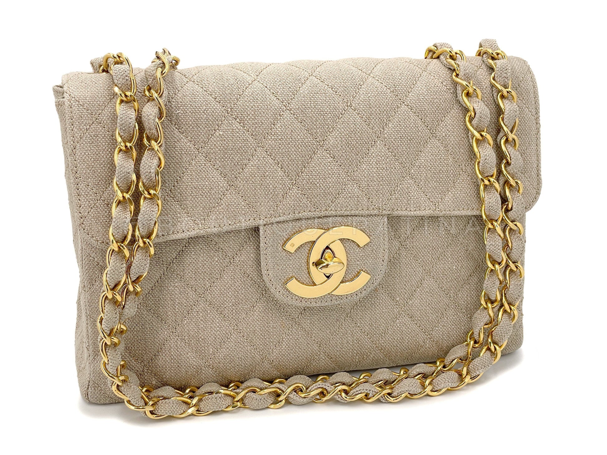 Chanel 1994 Vintage Beige Linen Canvas Classic Jumbo Flap Bag 24k GHW