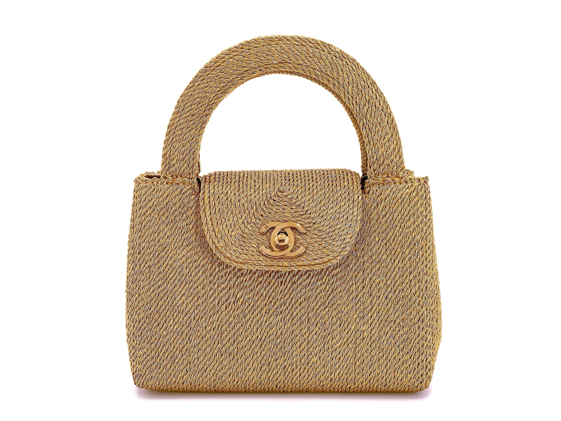 In Gold gold-spun raffia and 24k gold plated hardware. Boutique Patina specializes in sourcing and curating the best condition preowned vintage Chanel leather treasures by searching closets around the world.