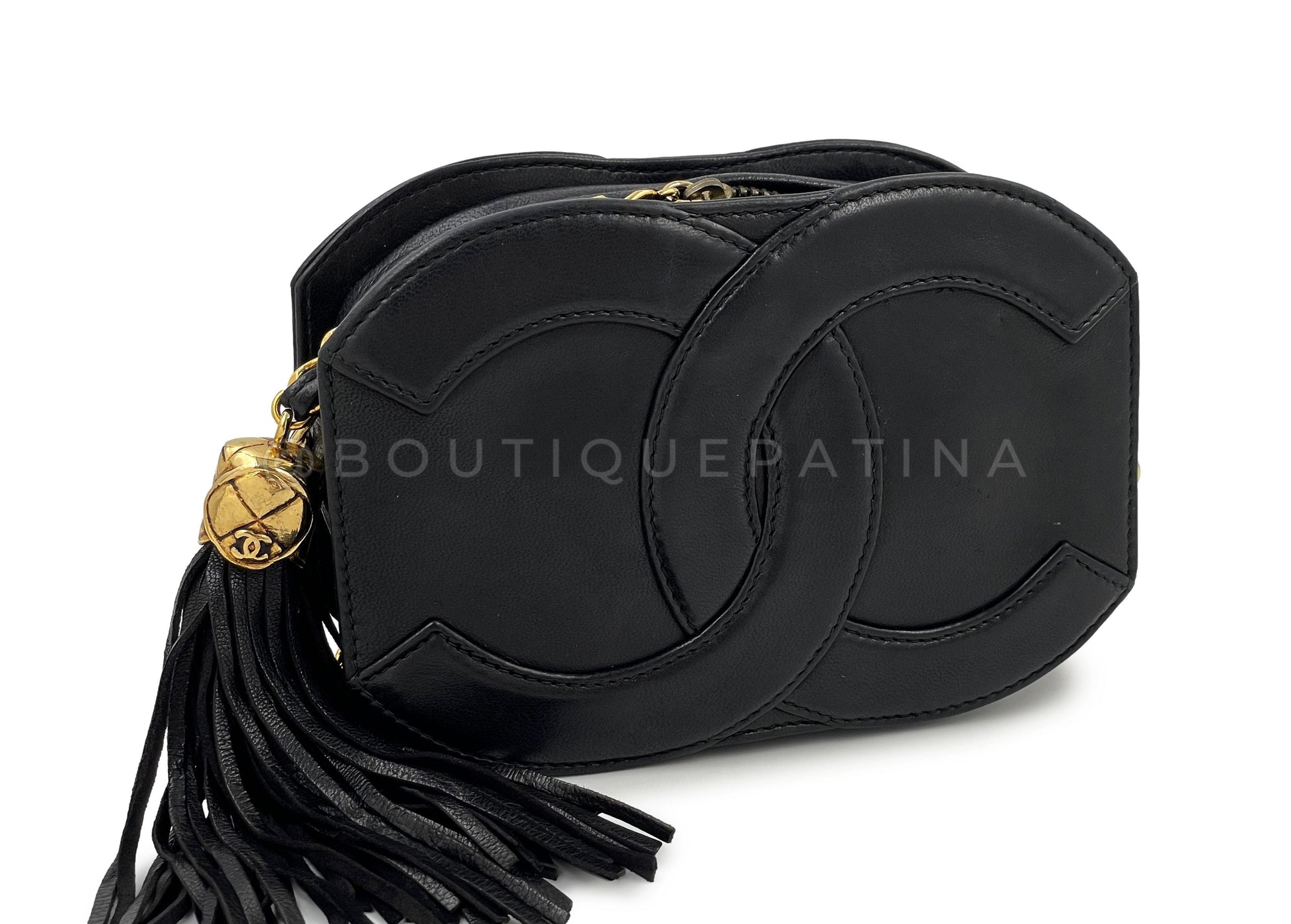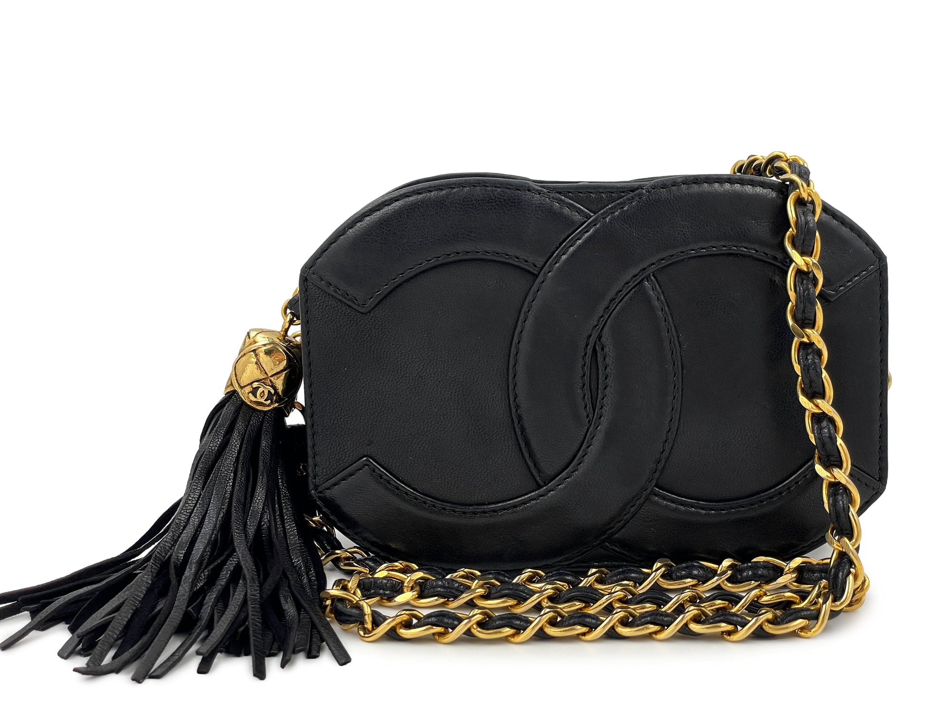 Identical oversized CC frame on front and back panel, dangling tassel charm zipper pull, top zipper and interior lined in leather, this bag's woven chain straps are removable and can be converted into an evening clutch.