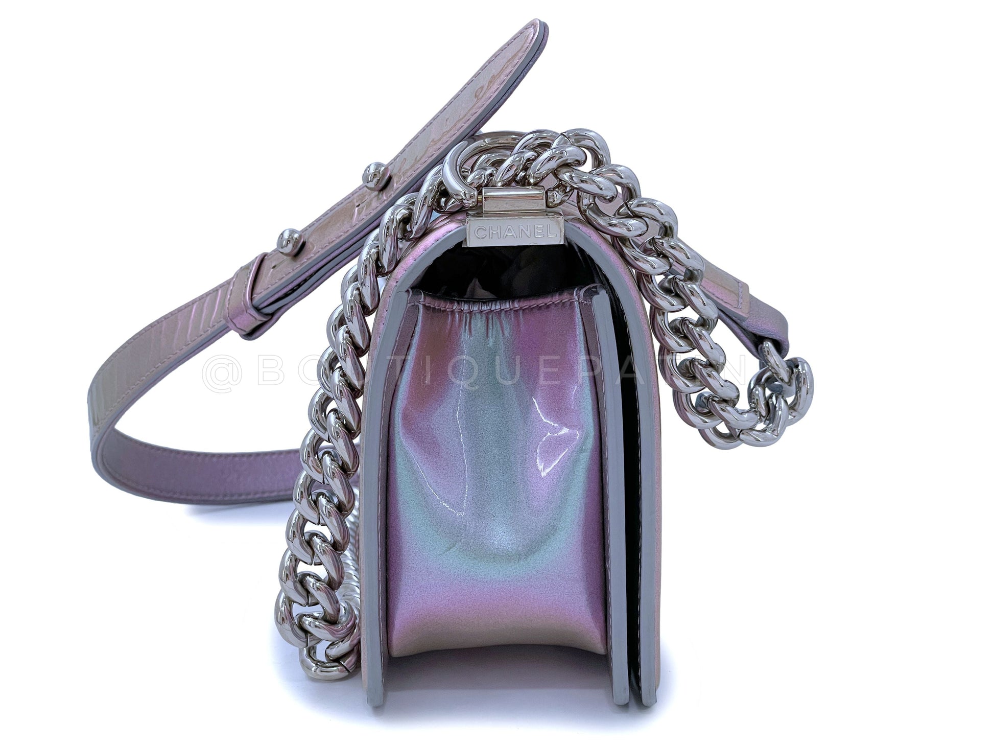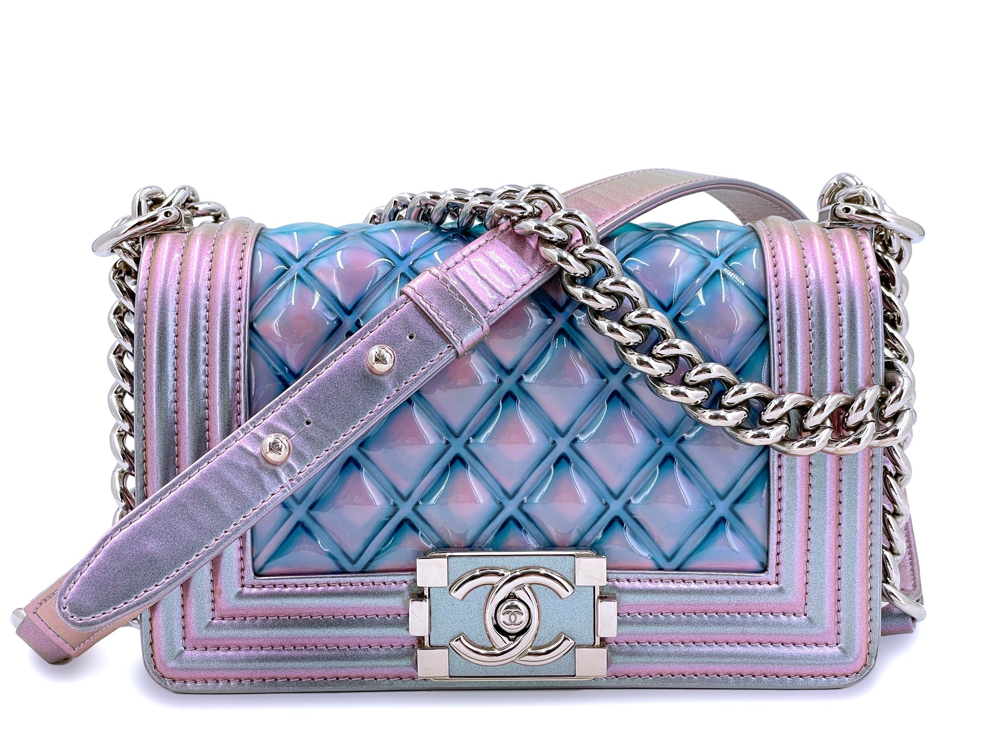 For collectors, one of the most sought-after models within the house of Chanel is this 18S Chanel Purple Patent Mermaid Rainbow Classic Small Boy Flap Bag.