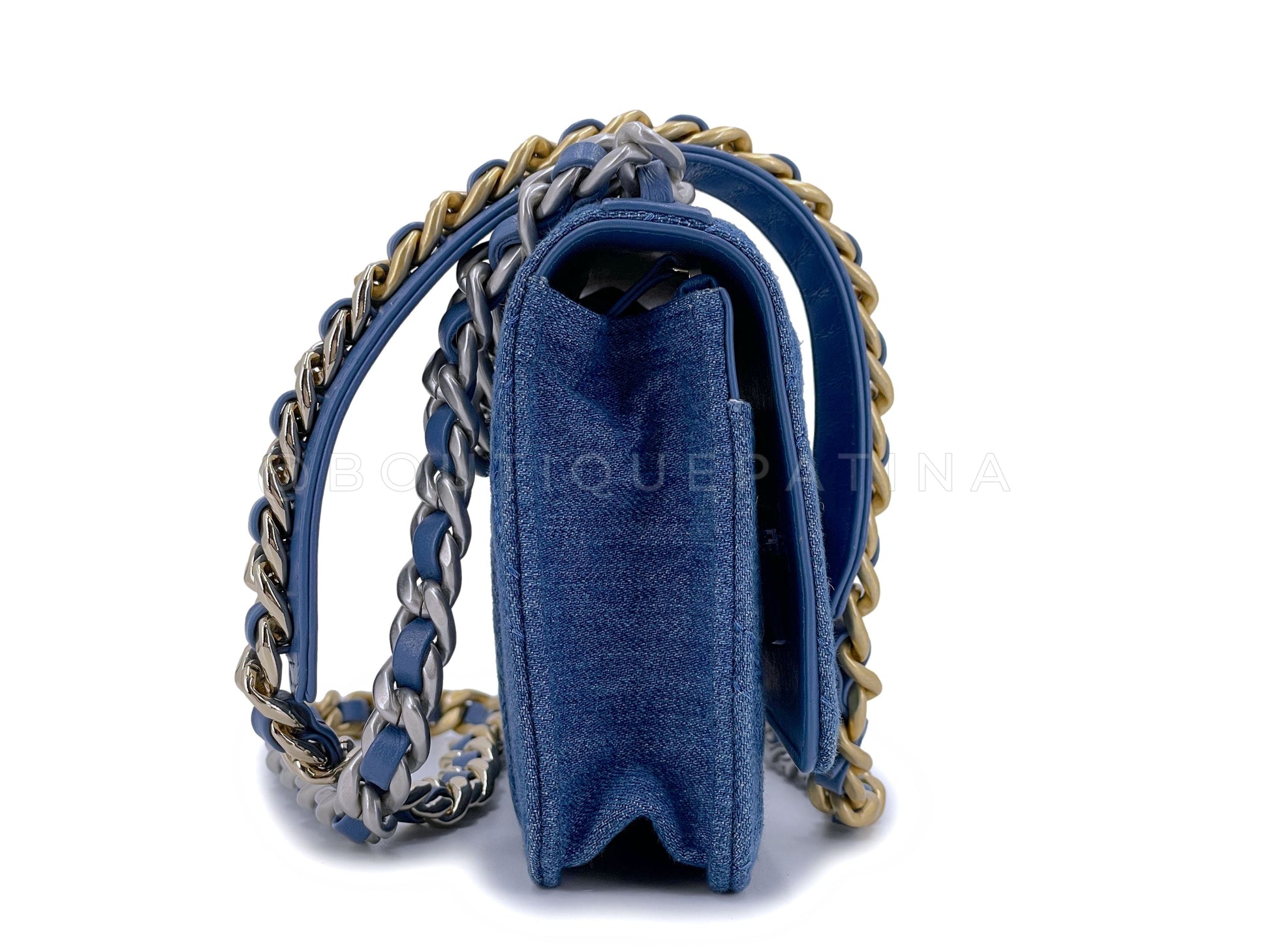 From the Chanel 19 collection, the recent ligne released by Chanel that became popular overnight for its woven chain "CC" logo, thick chunky woven chain in three different hardware metals and the extra chain handle. In a coveted blue jean denim.