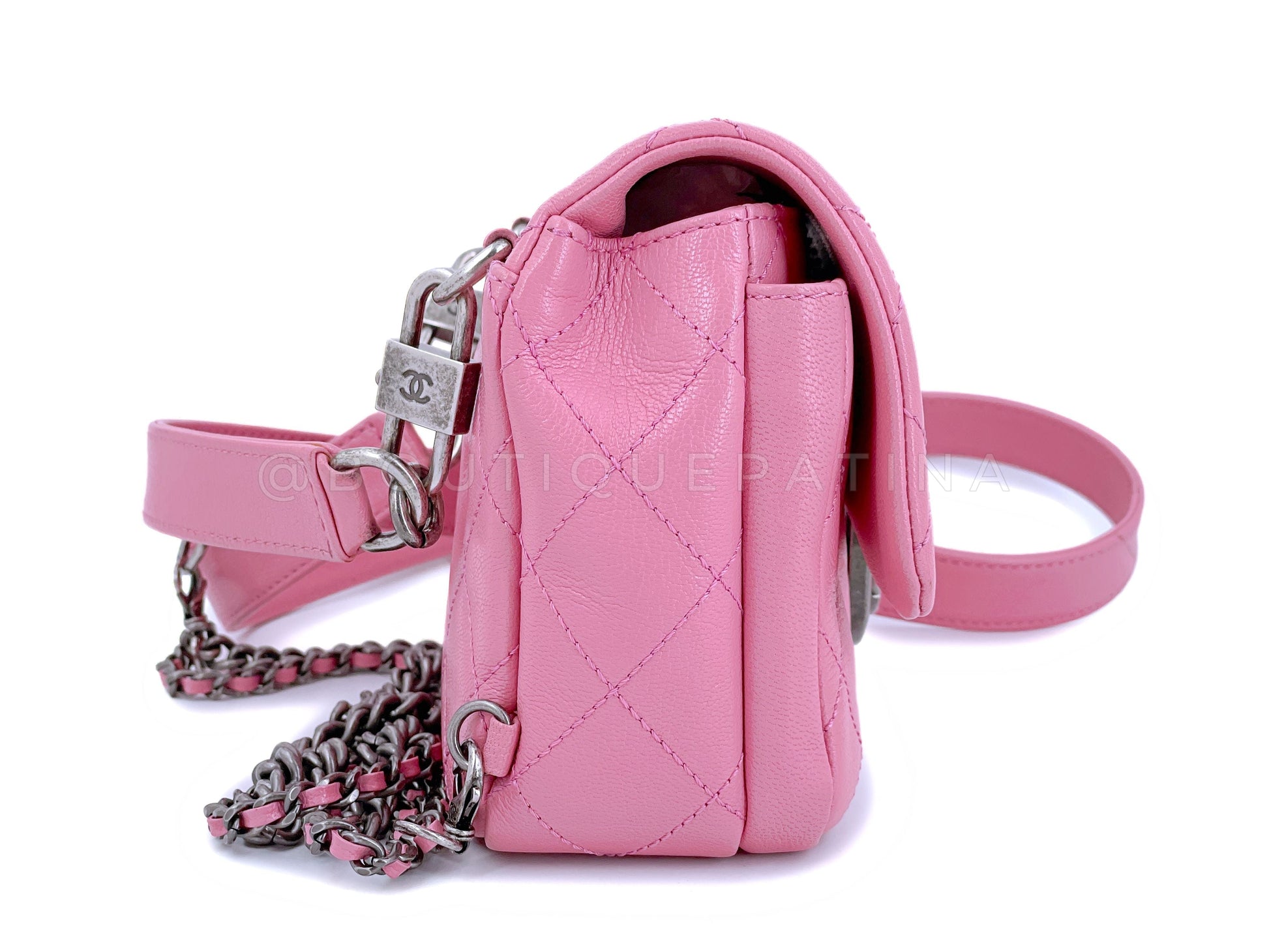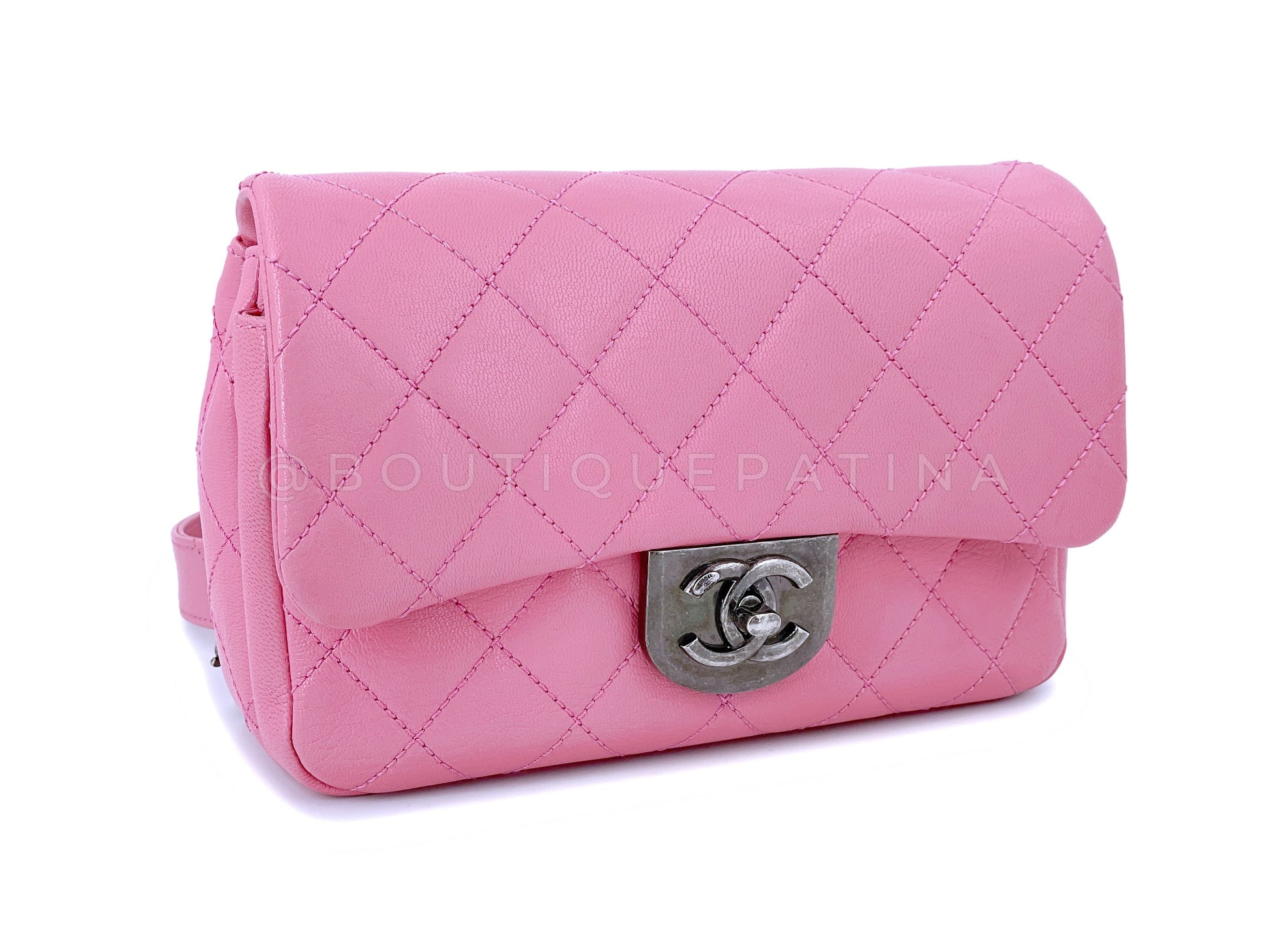 In bubble gum pink goatskin leather and aged ruthenium hardware. Boutique Patina specializes in sourcing and curating the best condition preowned vintage Chanel leather treasures by searching closets around the world.