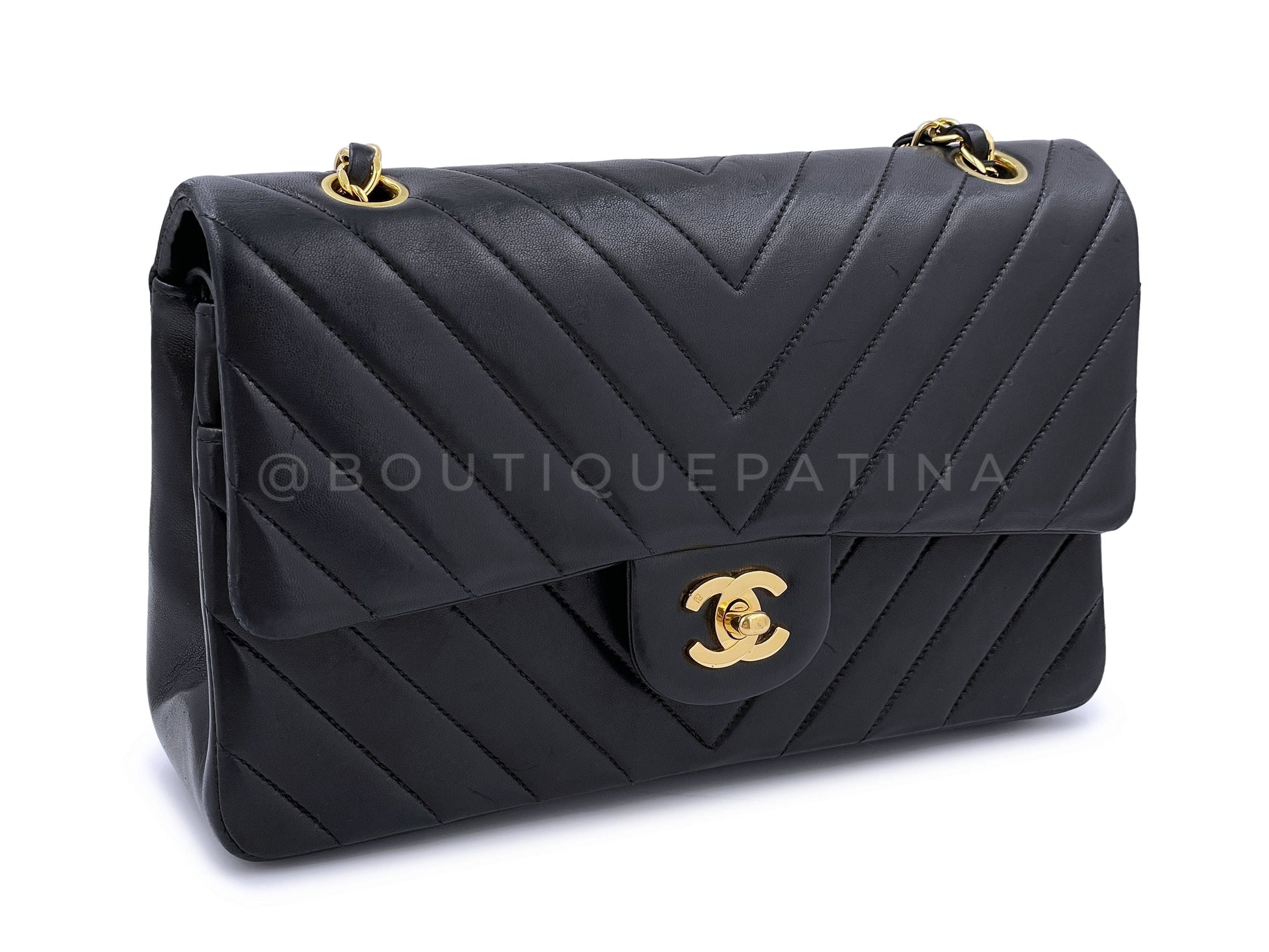 In Black lambskin leather and 24k gold plated hardware. In lambskin leather, the original classic flap in all its glory with its petal soft quilts, true luxury. Boutique Patina specializes in sourcing and curating the best condition preowned vintage Chanel leather treasures by searching closets around the world.