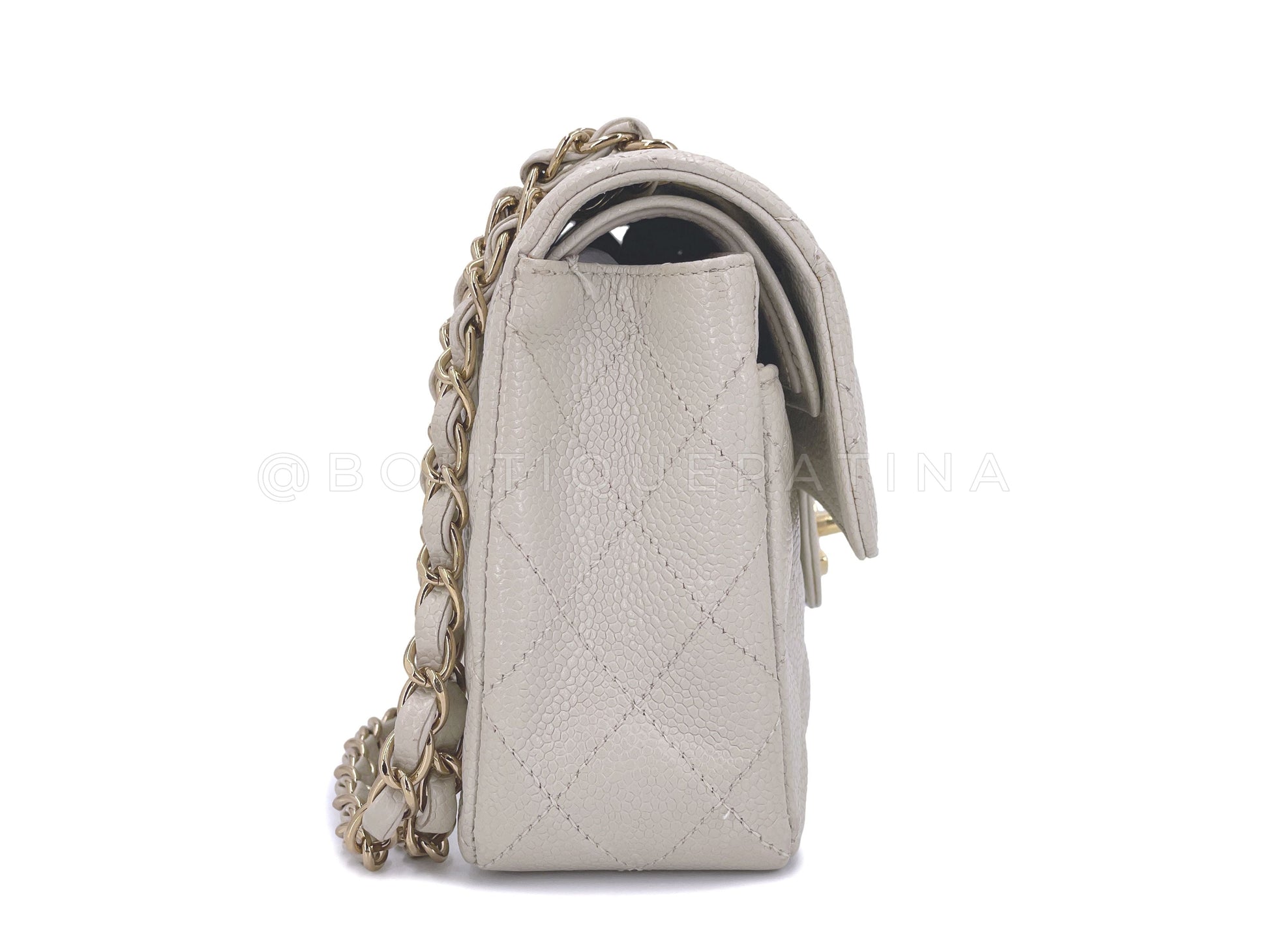 In gray-beige caviar leather and 24k gold plated hardware. The color is like a turtle dove beige-gray, rare from 2005. In caviar leather, the classic flap is durable with the pebbled grain nodes of calfskin leather.