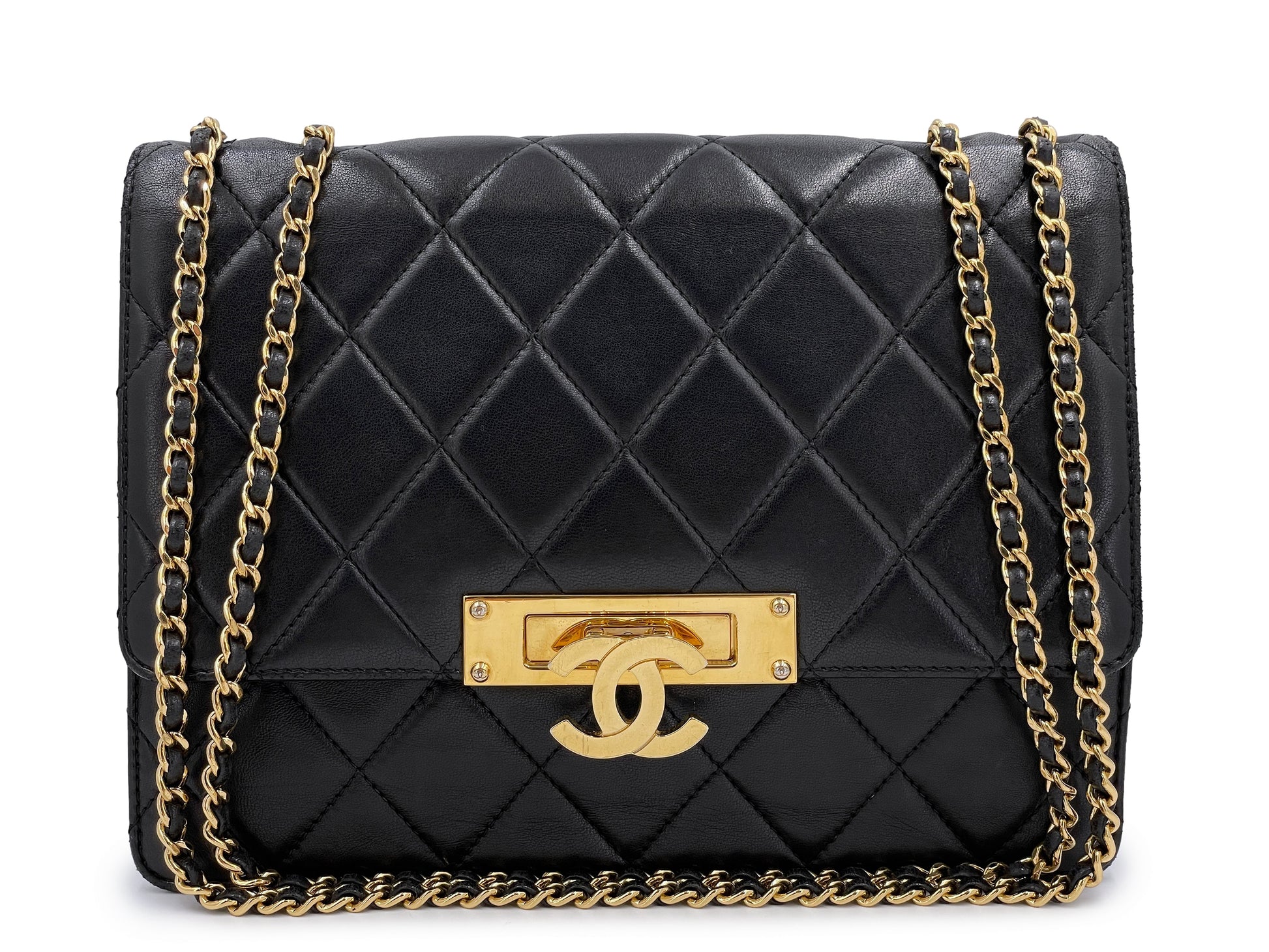 In Black lambskin leather and gold hardware. Perfect 11 inch size with flip-out CC clasp and double woven chain strap that can be carried double or single. Burgundy interior.