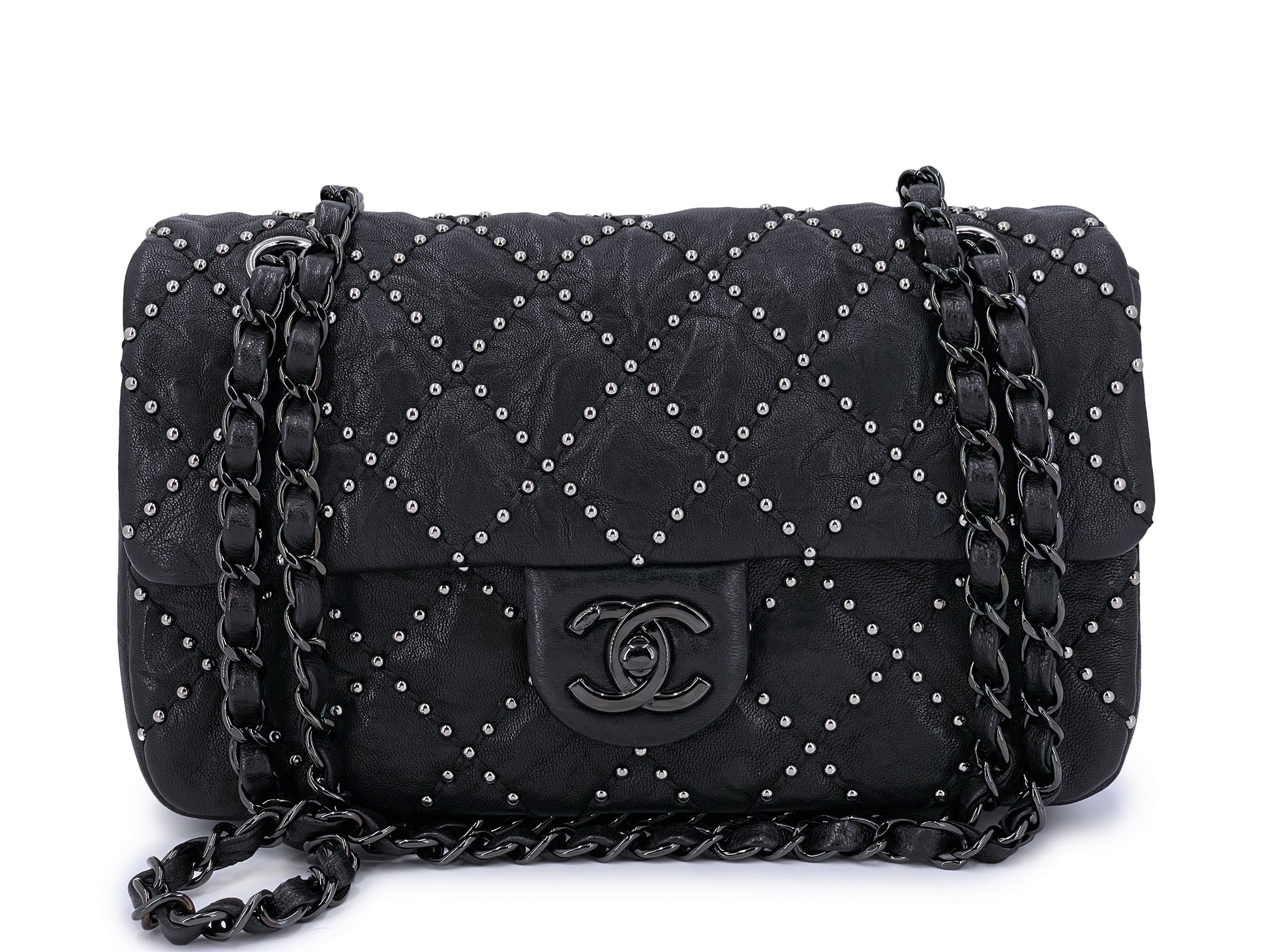 In thick, chewy textured calfskin studded with ruthenium beads and with "so black" metal woven chain and CC turnlock, this bag is simple yet statement at the same time.