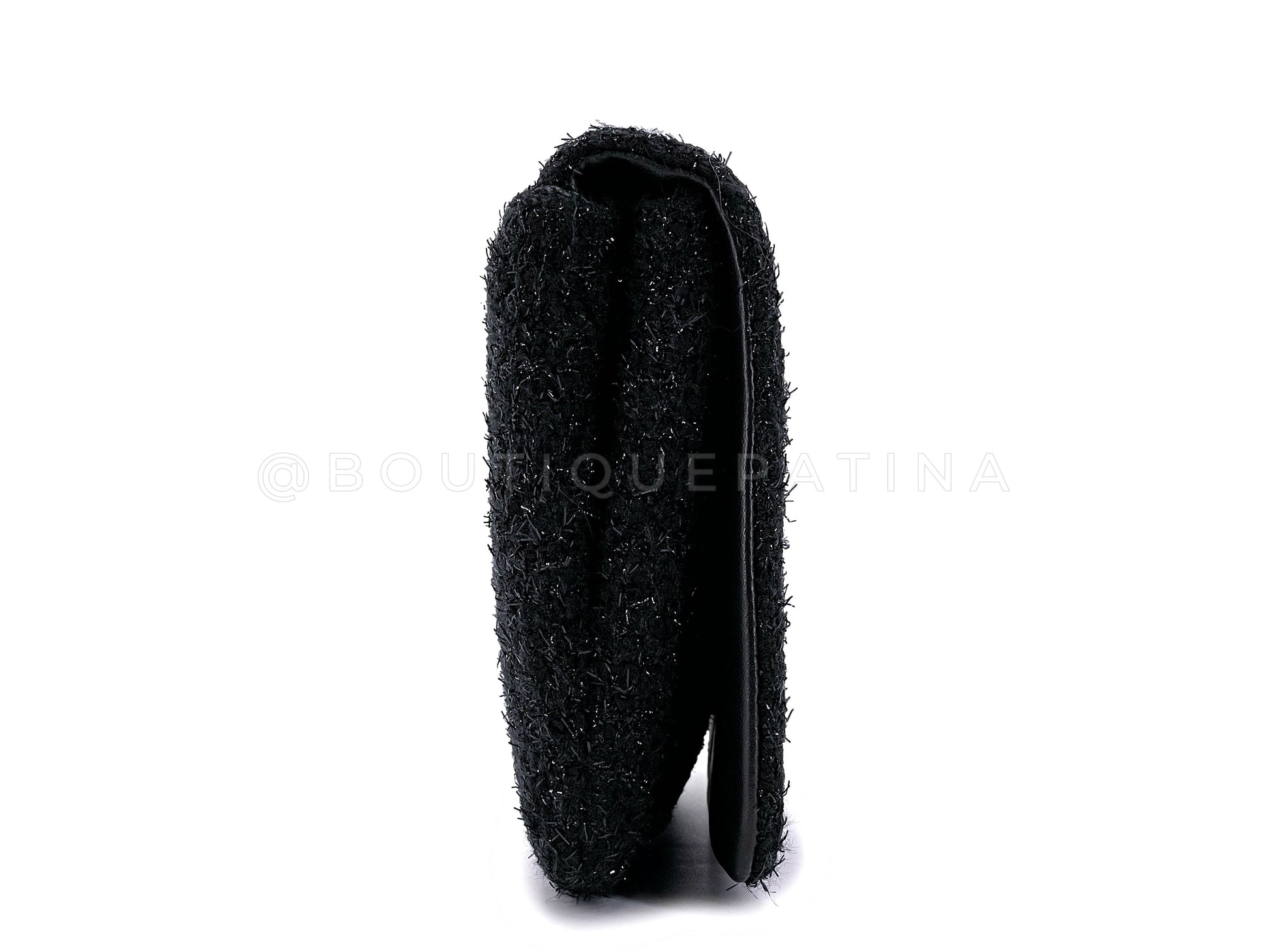 In Black fantasy wool tweed and gold hardware.