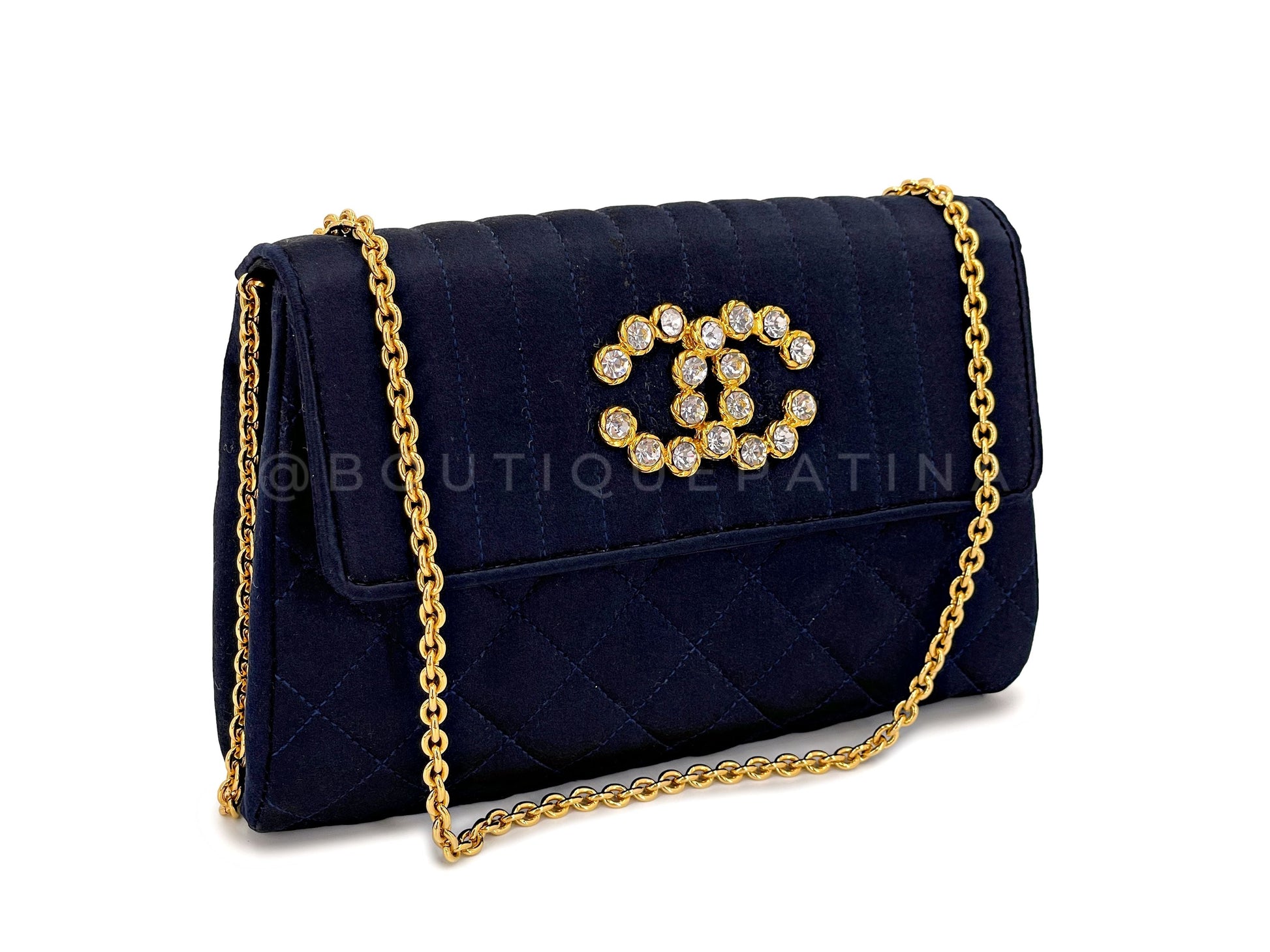 In navy blue satin and 24k gold plated hardware. Established 20 years ago, Boutique Patina has specialized in sourcing and curating the best condition preowned vintage Chanel leather treasures by searching closets around the world.