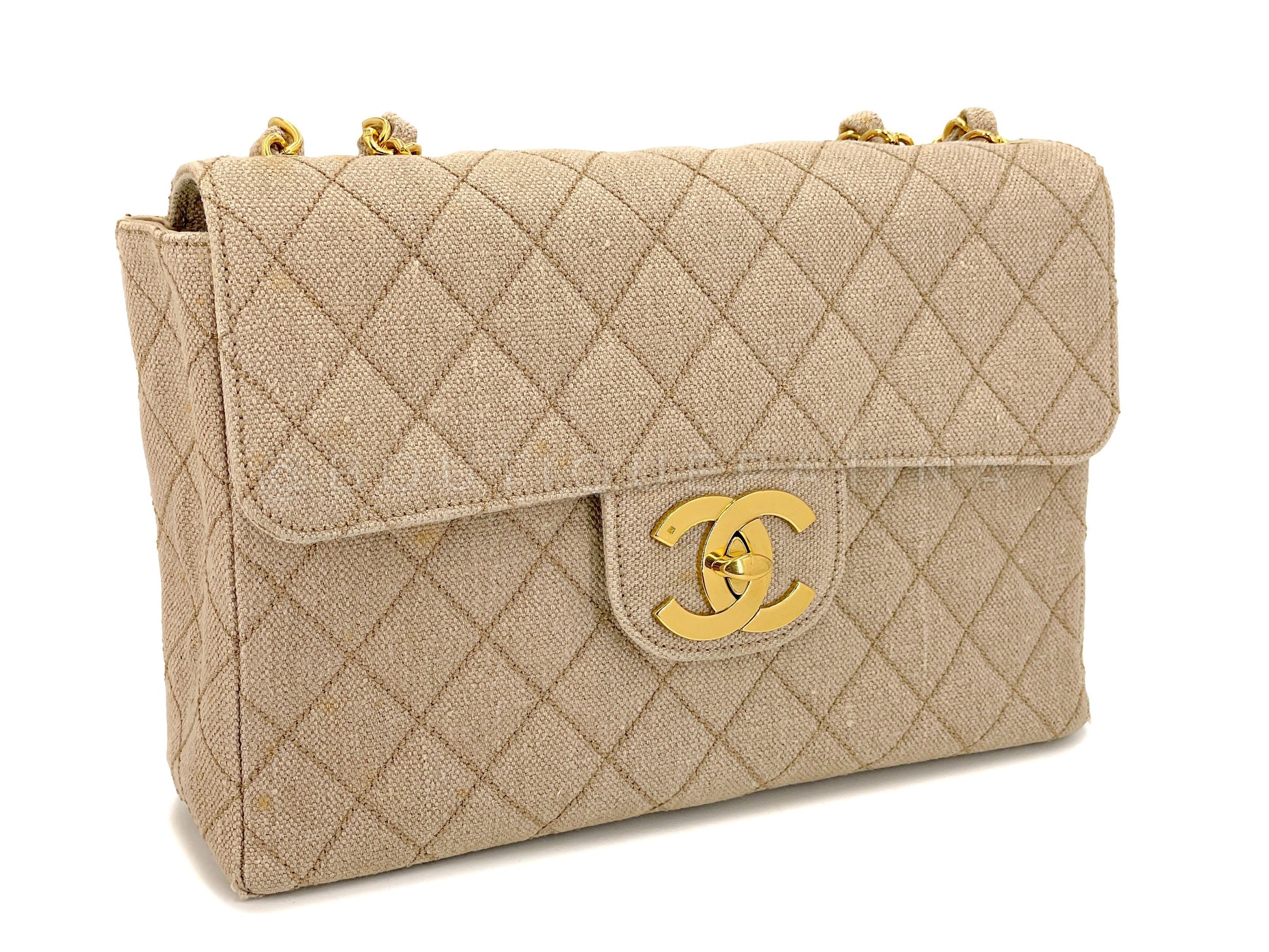 Rare Chanel 1994 Vintage Light Taupe Beige Linen Jumbo Classic Flap Bag 24k GHW