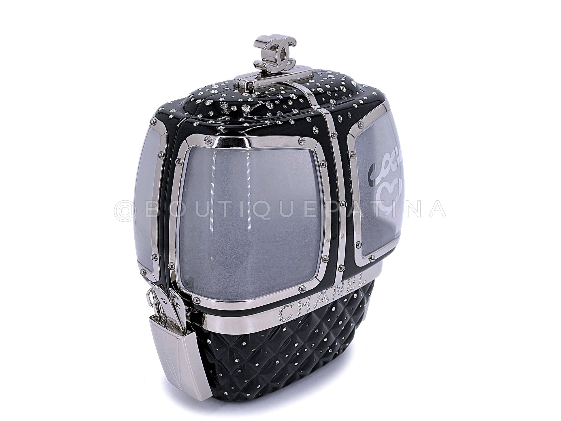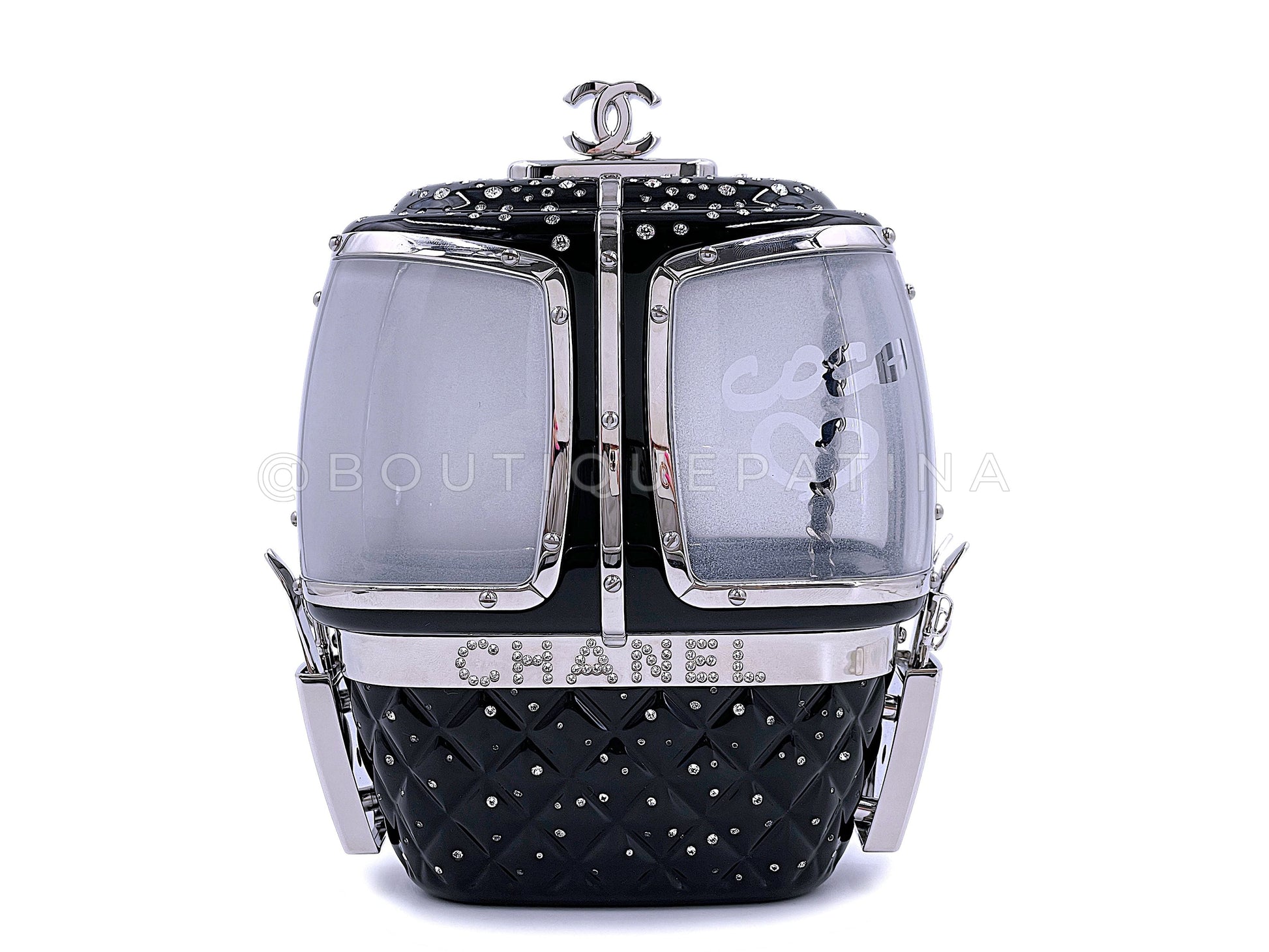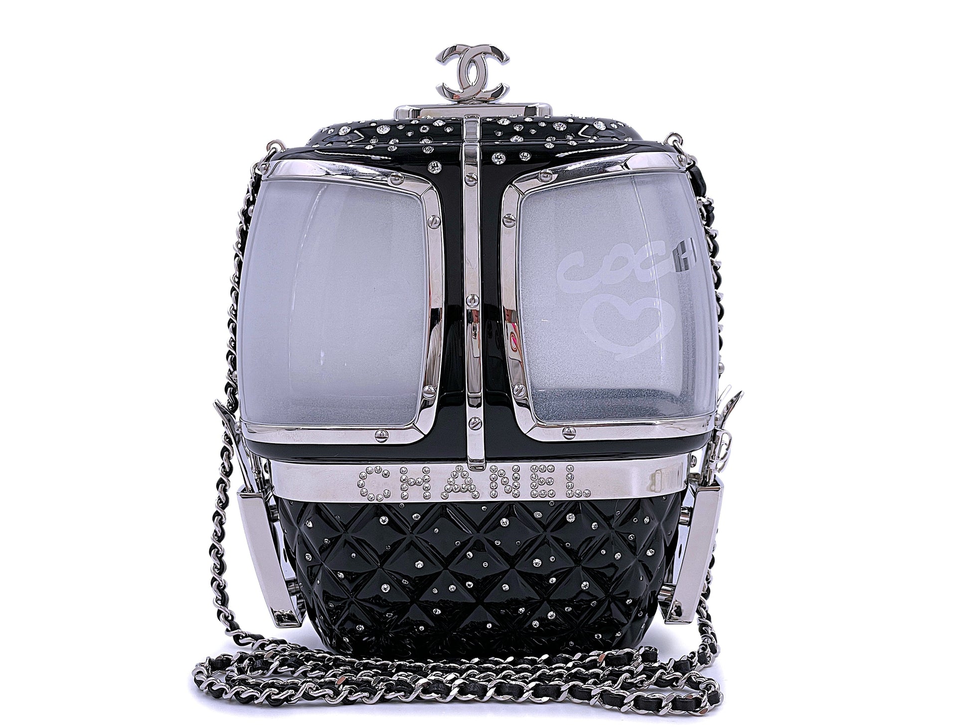In Black resin and silver hardware. "Frosted glass" panels with "CC" on one side and "Coco" on the other with a heart drawn in. Embedded with white Swarovski crystals and quilted shape panels, silver skis and poles on each side and a large interior lined partially in lambskin.