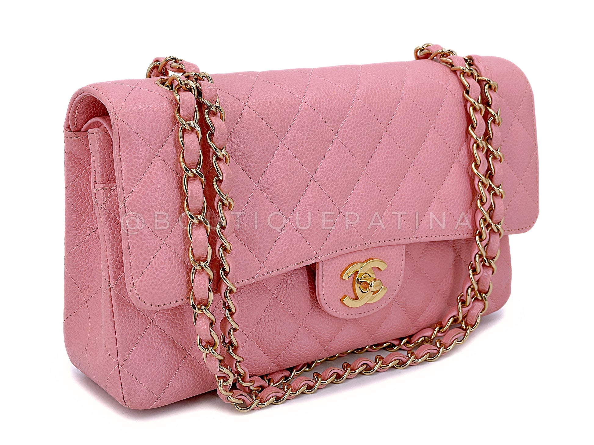 In pink caviar leather and 24k gold plated hardware. In caviar leather, the classic flap is durable with the pebbled grain nodes of calfskin leather. Established 19 years ago, Boutique Patina has specialized in sourcing and curating the best condition preowned vintage Chanel leather treasures by searching closets around the world.