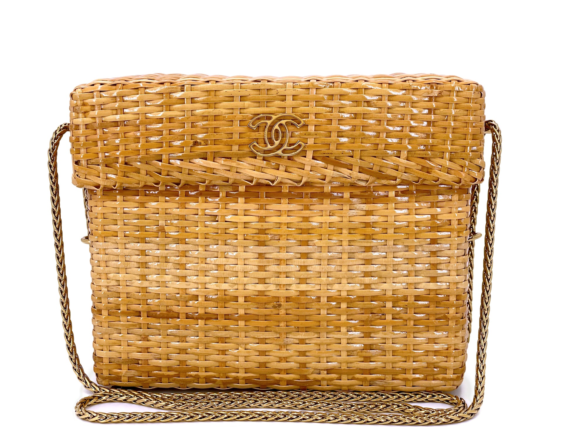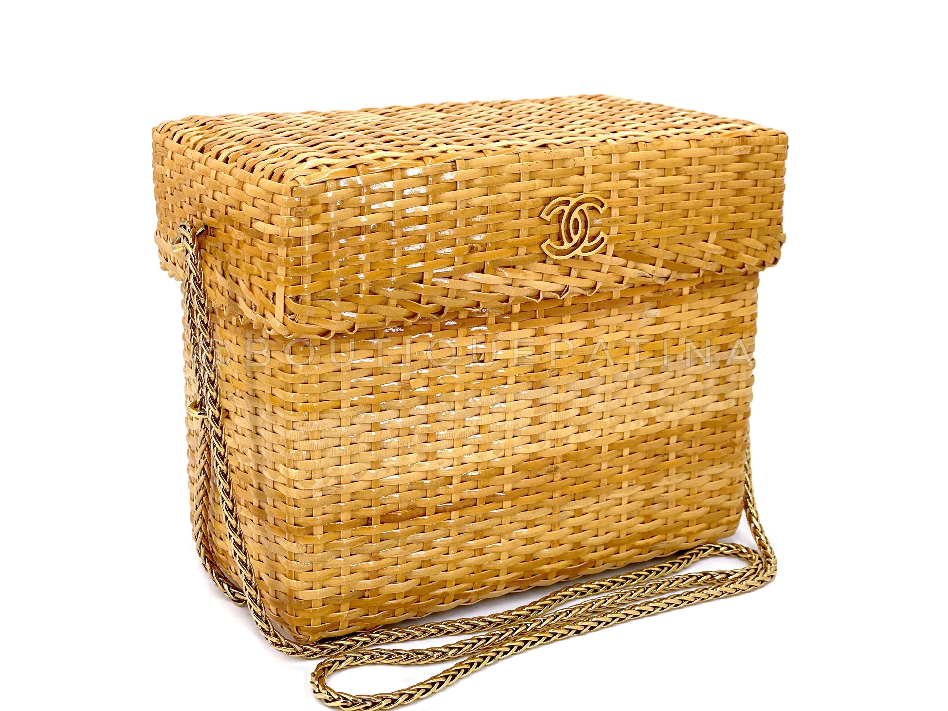 In a glazed honey-colored beige wicker rattan and 24k gold plated hardware. Established 20 years ago, Boutique Patina has specialized in sourcing and curating the best condition preowned vintage Chanel leather treasures by searching closets around the world.