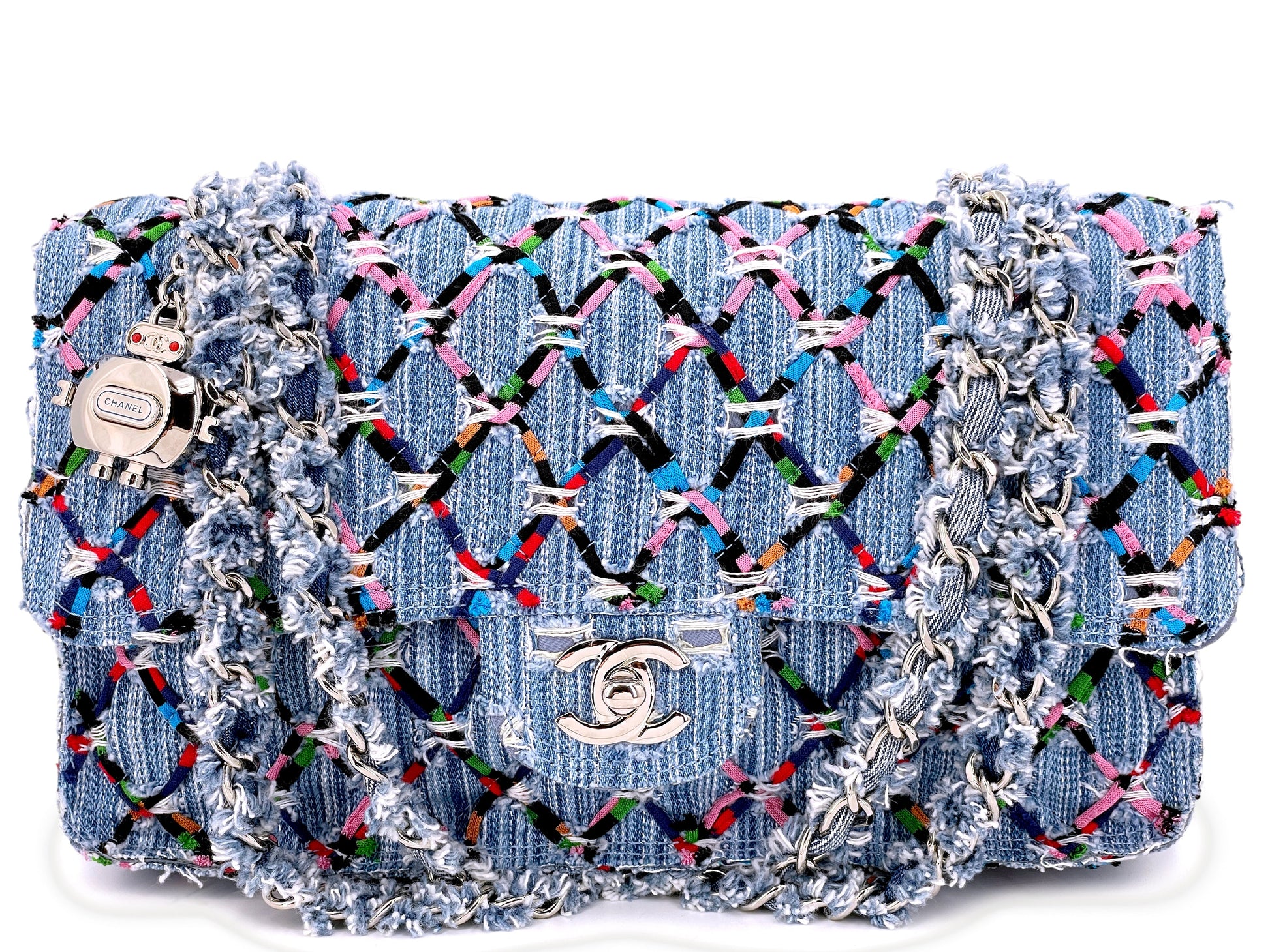 Chanel 17S Denim Rainbow Stitched Robot Charm Medium Flap Bag TFS