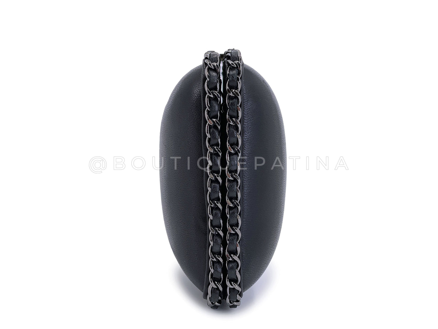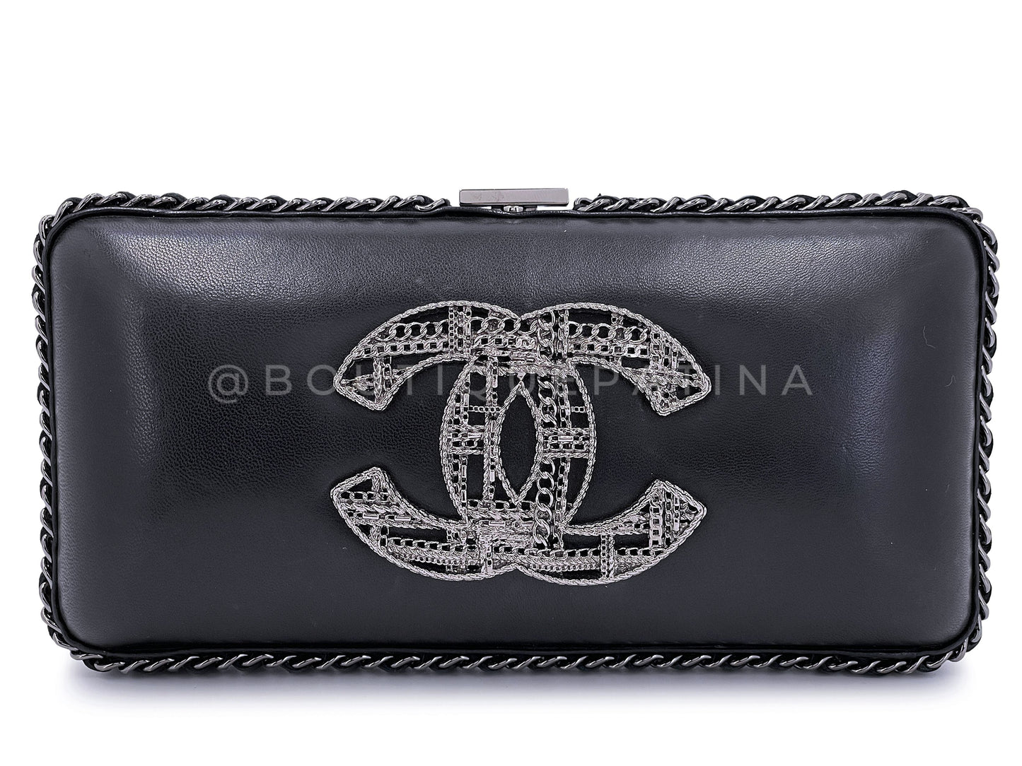 In Black lambskin leather and aged ruthenium hardware. The intricate oversized CC center imitates a tweed pattern, the same size as the oversized CC choker pendant from this same season, 2013 fall.