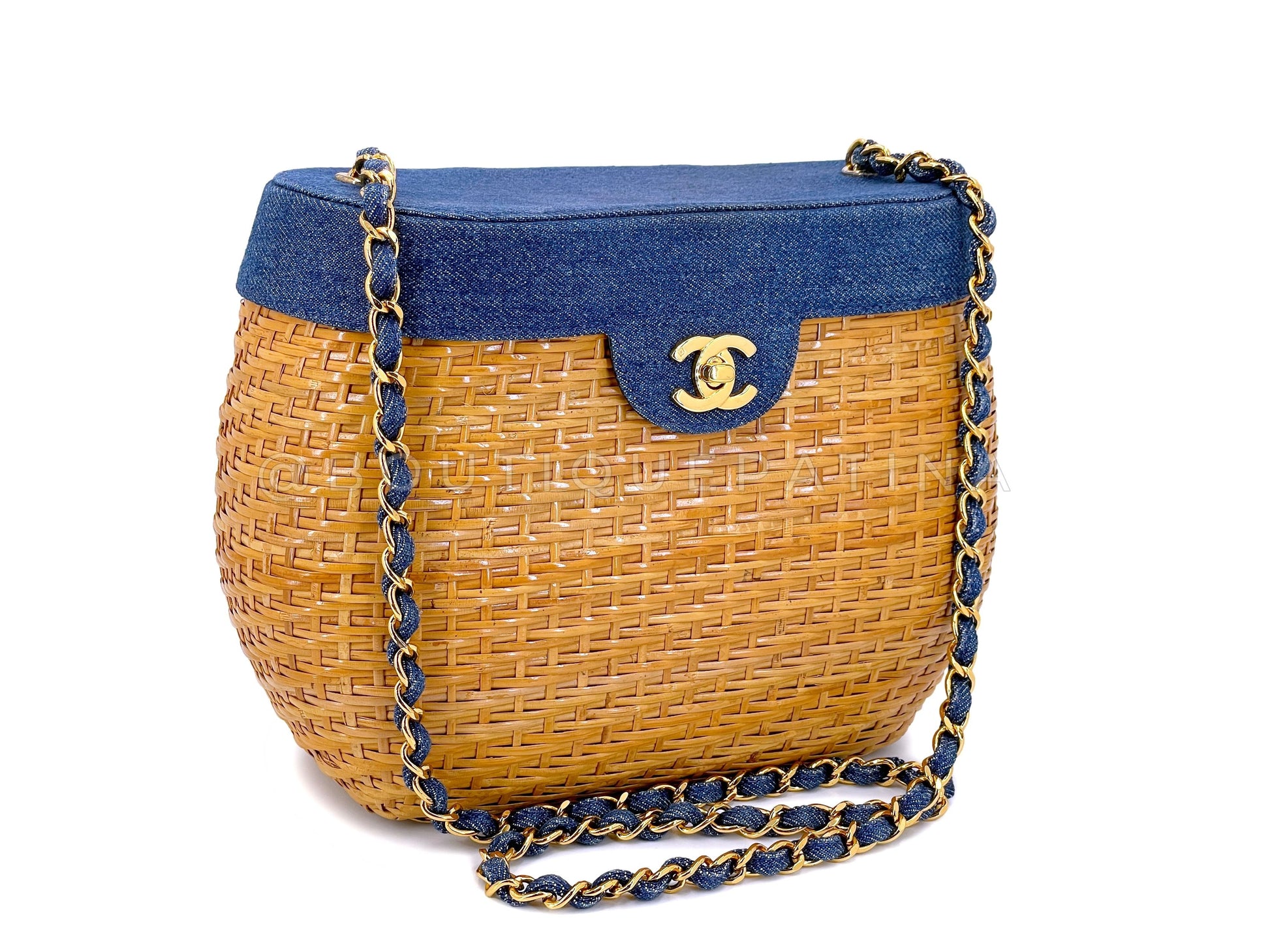In blue denim canvas, wicker rattan and 24k gold plated hardware. Established 20 years ago, Boutique Patina has specialized in sourcing and curating the best condition preowned vintage Chanel leather treasures by searching closets around the world.