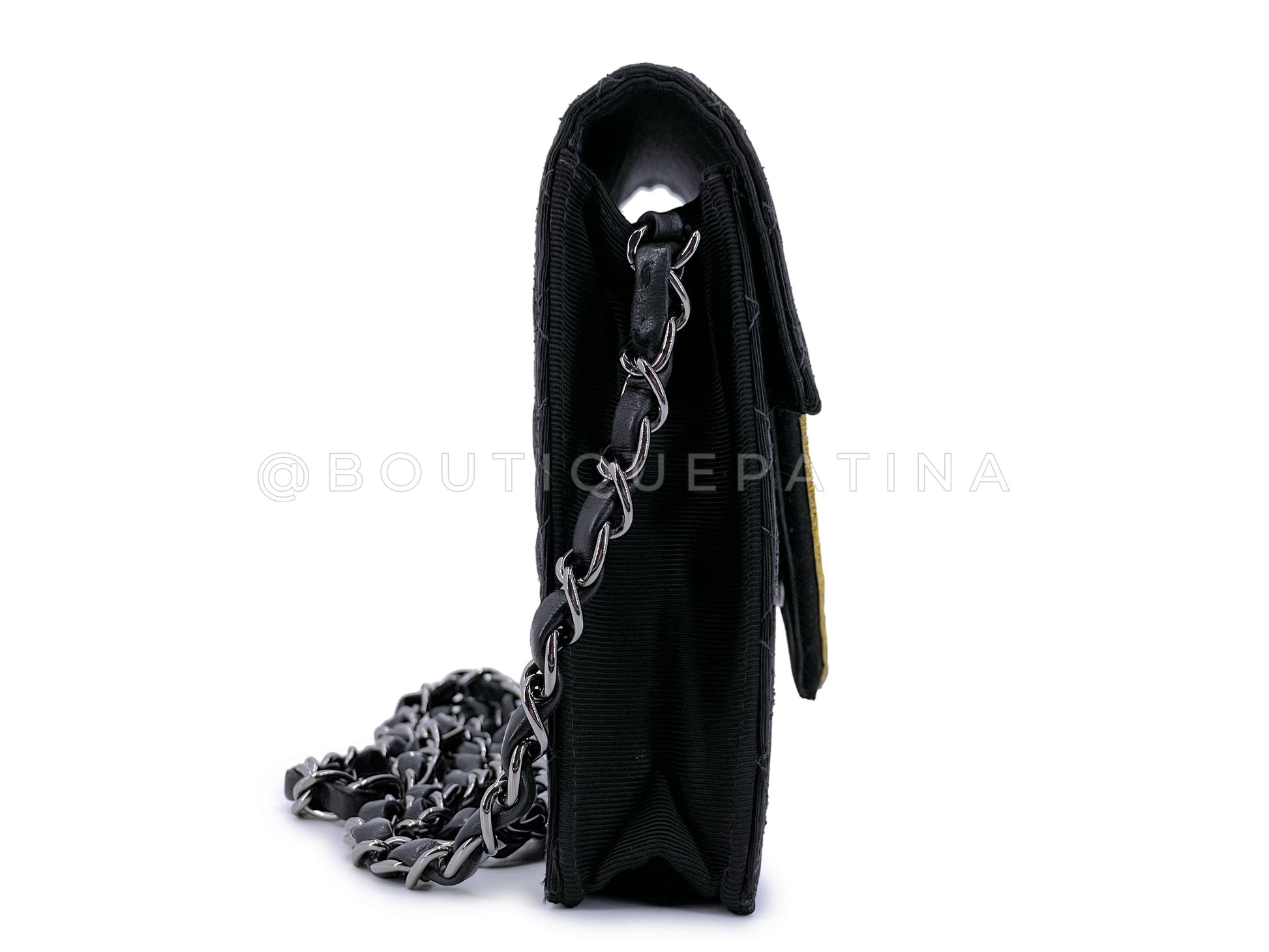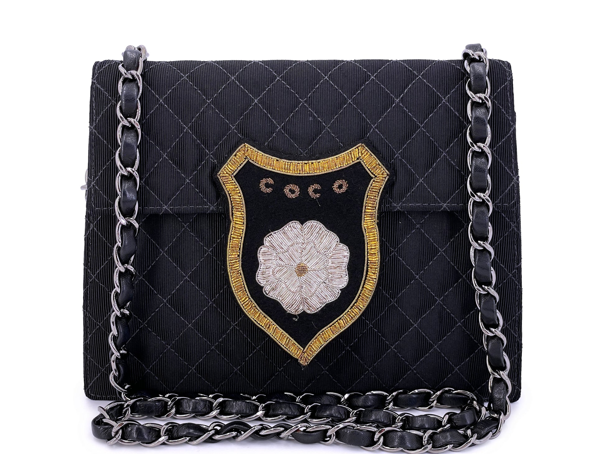In Black quilted grosgrain and silver hardware.