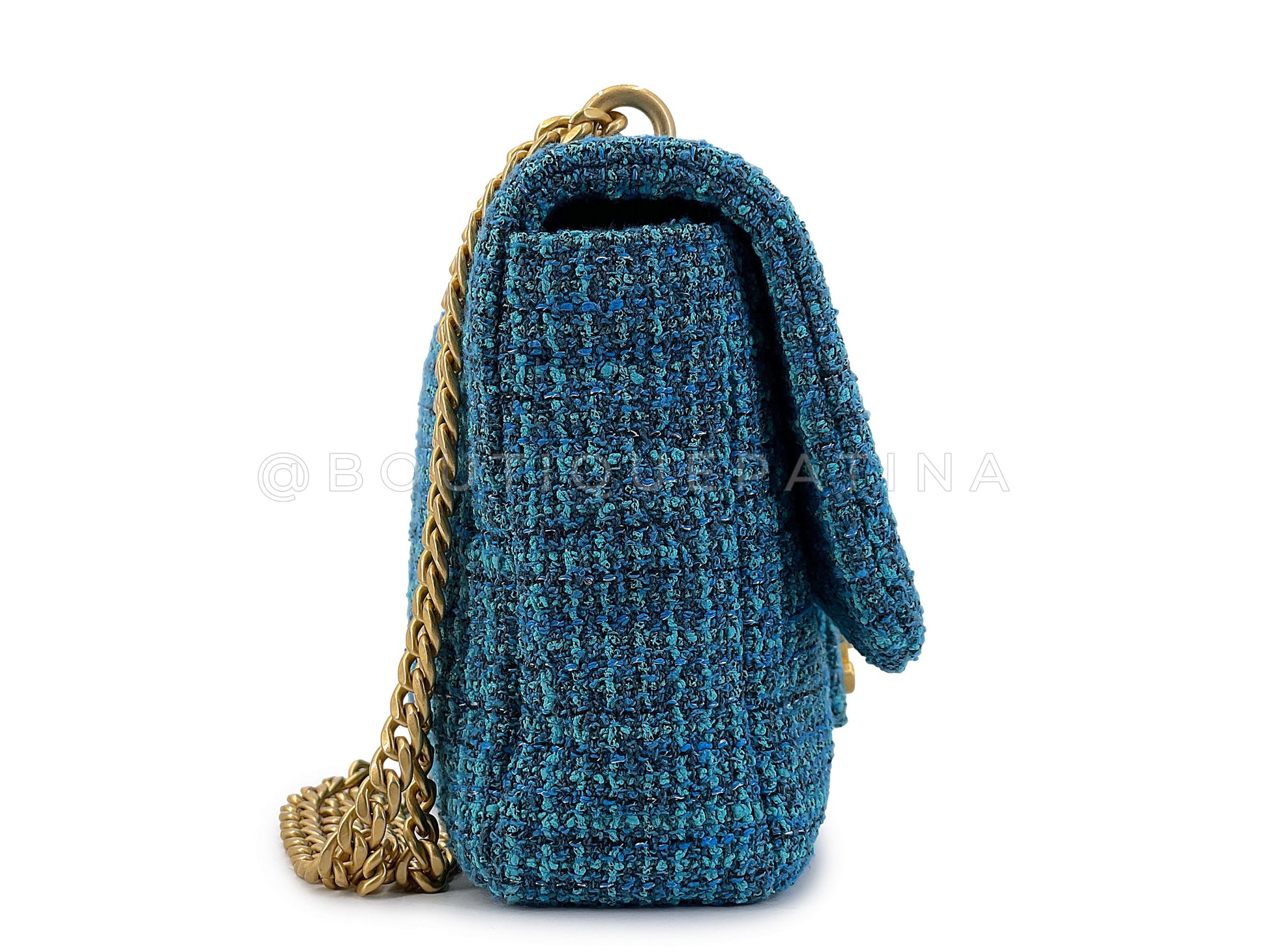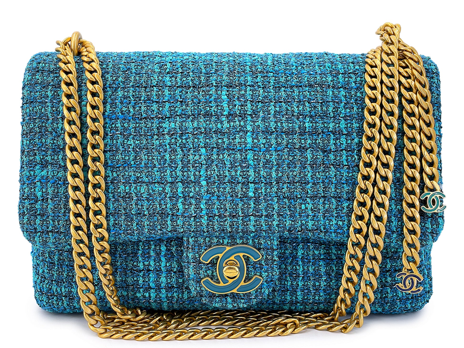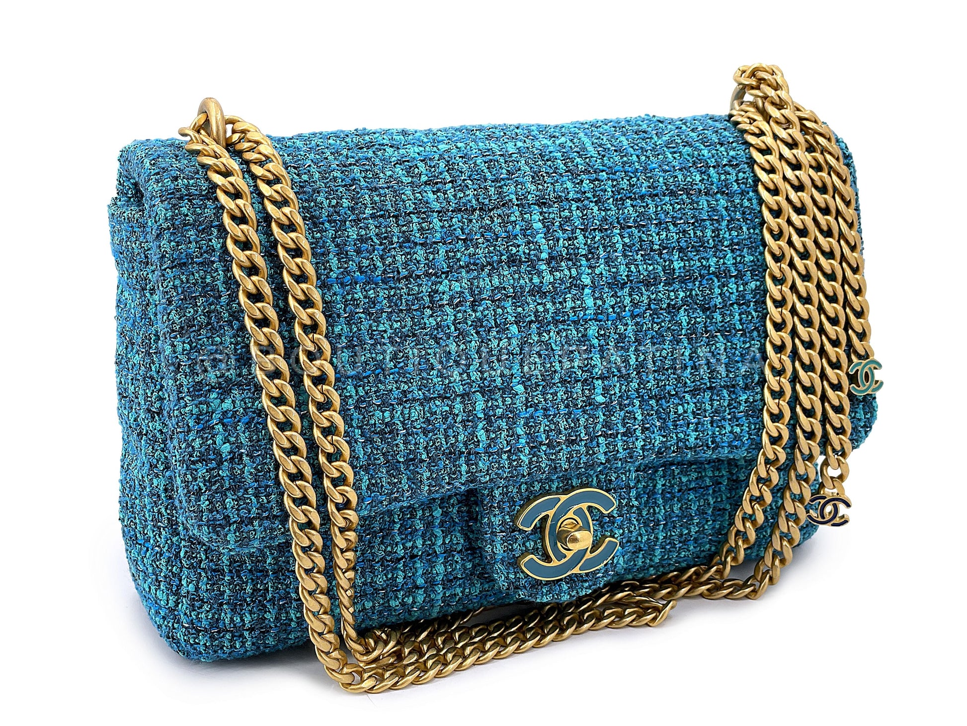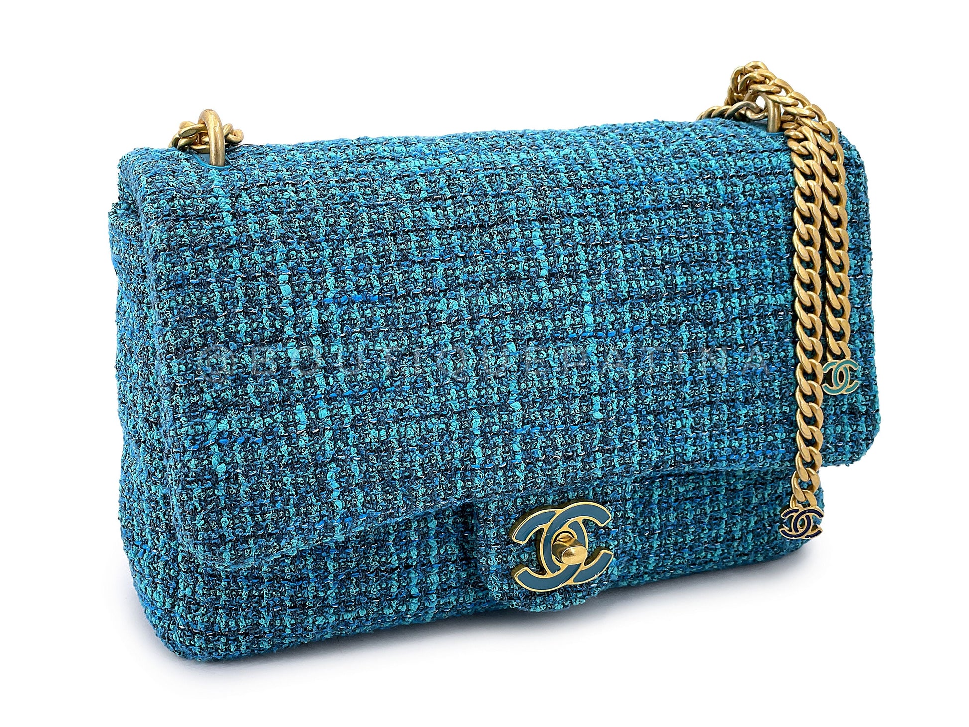 Chanel Rare Teal Blue Tweed Enamel CC Tassel Classic Flap Bag GHW