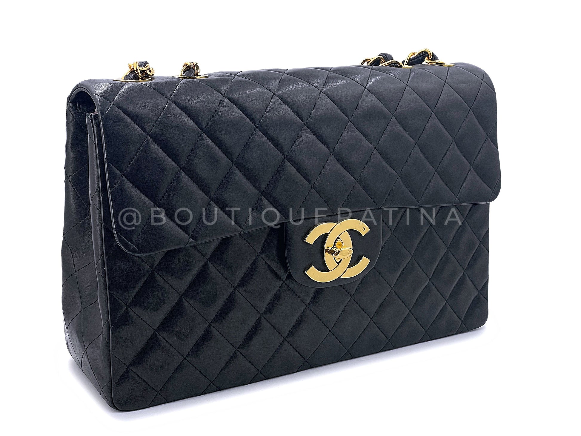 In Black lambskin leather and 24k gold plated hardware. Established 20 years ago, Boutique Patina has specialized in sourcing and curating the best condition preowned vintage Chanel leather treasures by searching closets around the world.