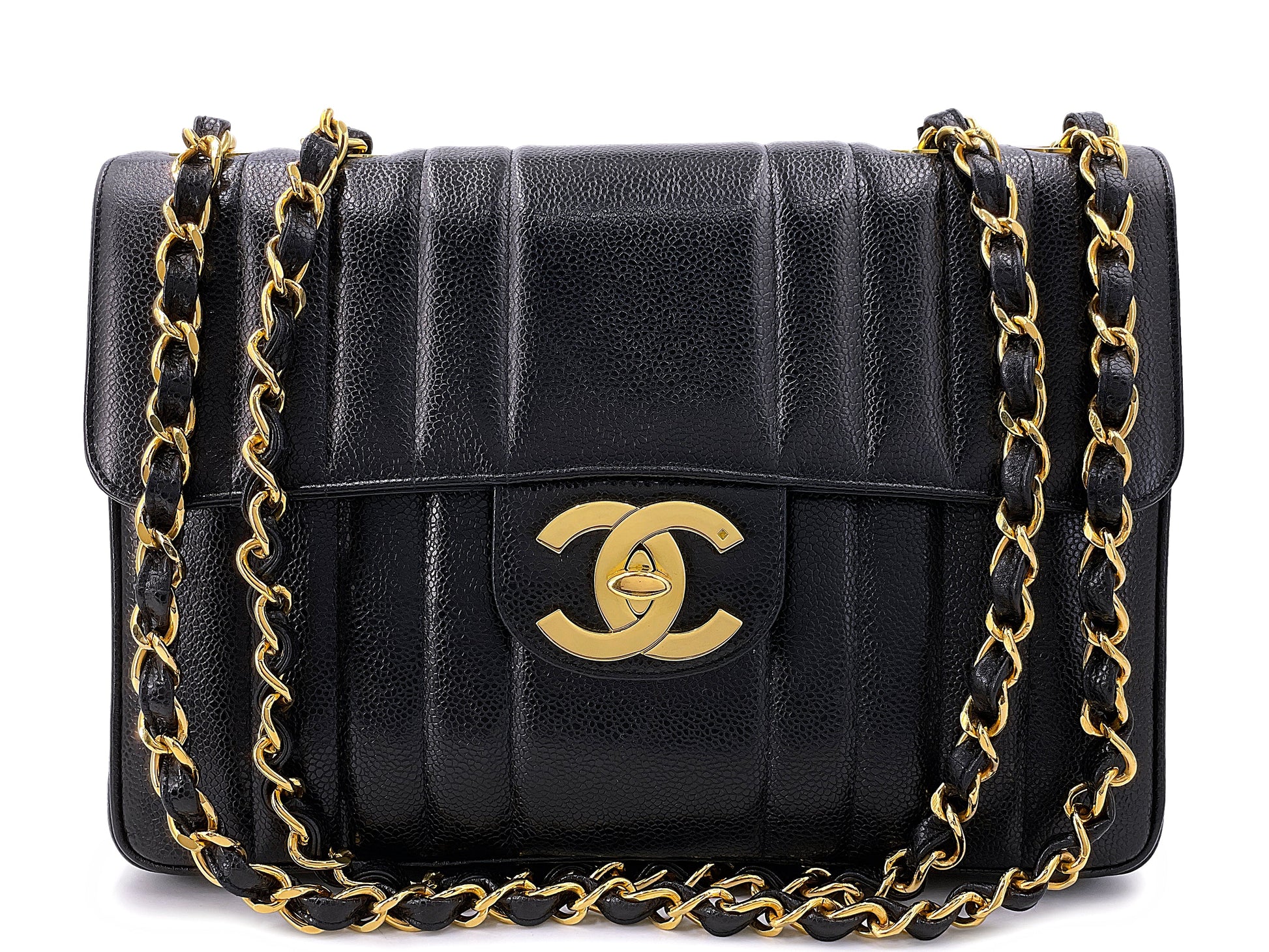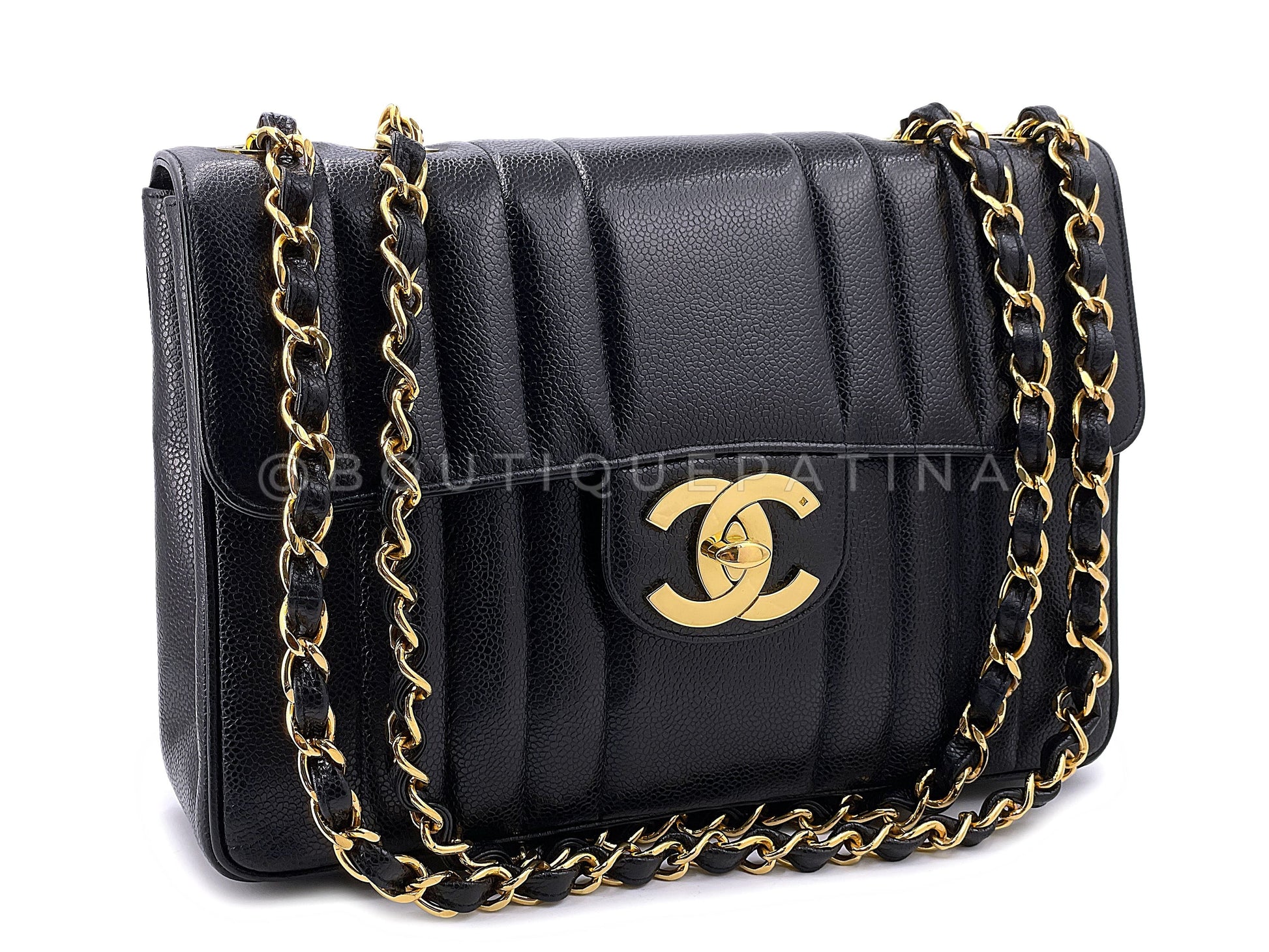 Large oversized CC and chunky double woven chain straps in 24k gold plated hardware. Elegant and unique vertical mademoiselle caviar quilting and spacious back pocket.