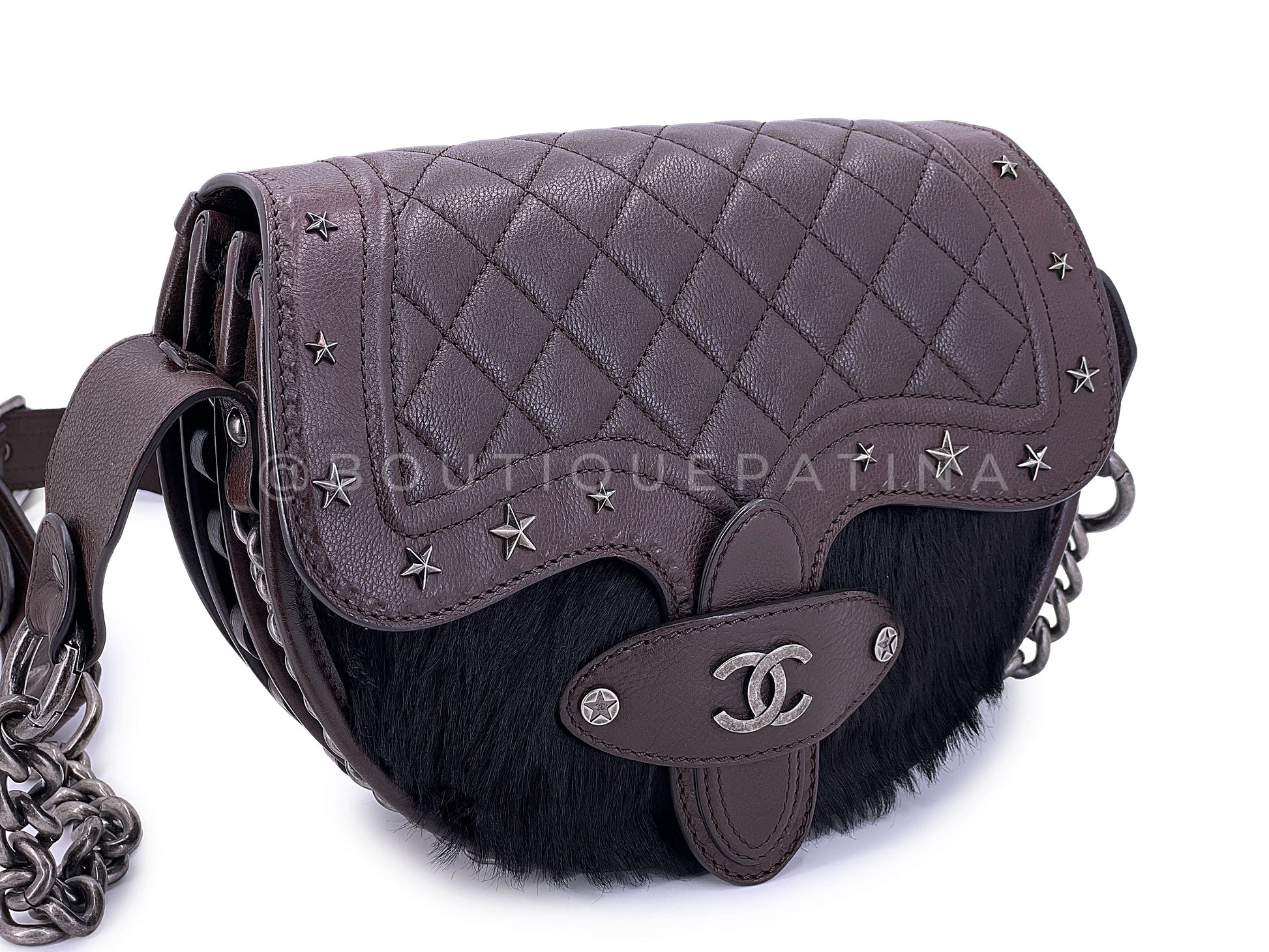 Made of brown grained quilted leather and black pony hair on front, the crossbody strap is adjustable and has decorative holes to hold bullets, as with the bottom and side frames of the bag. Studded with aged ruthenium stars.