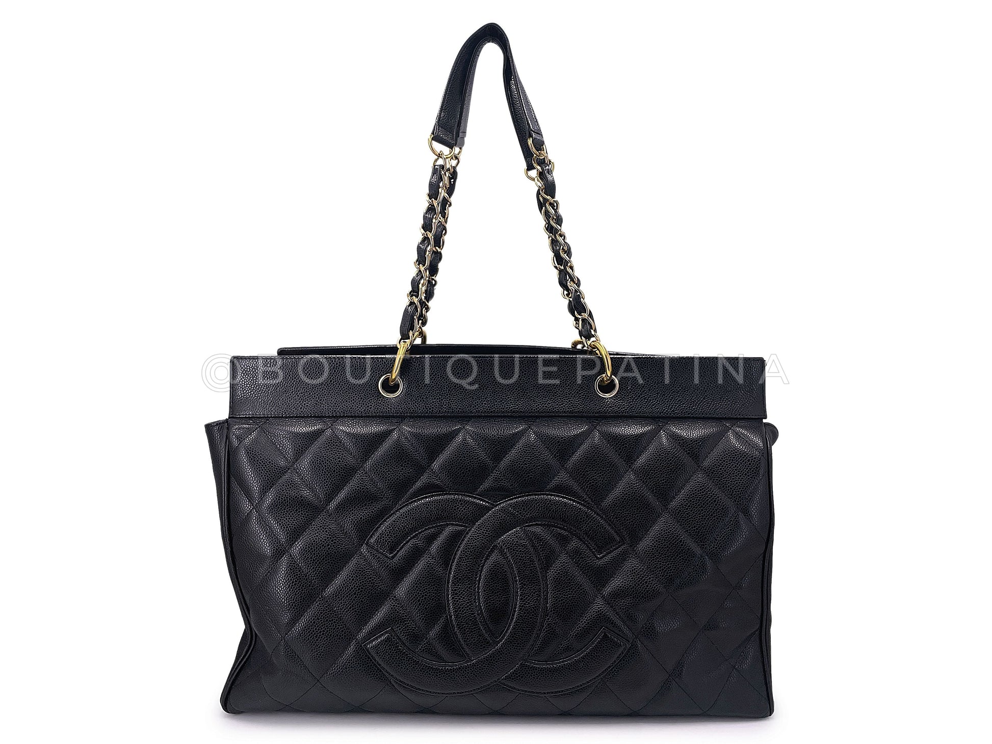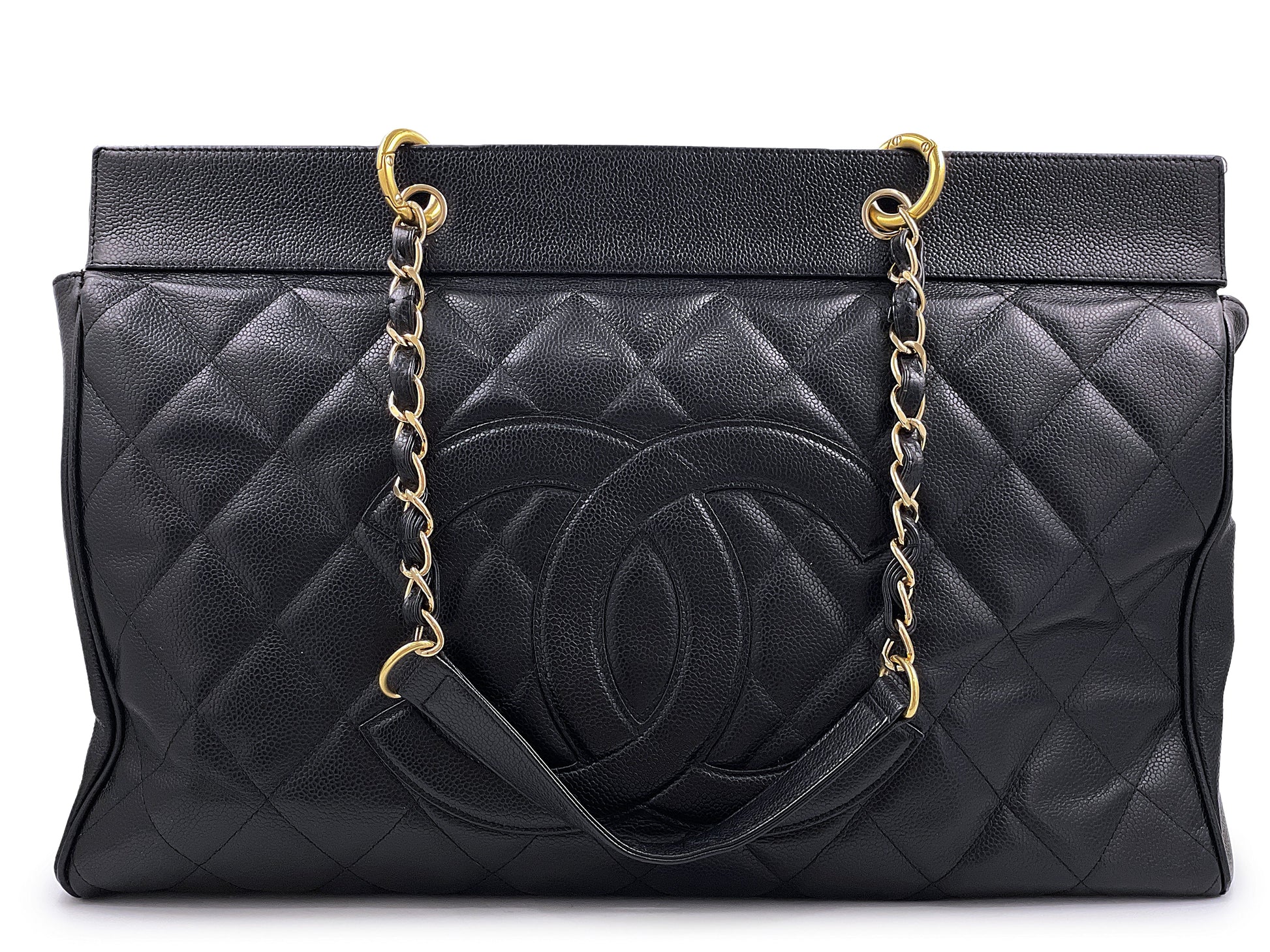 A classic vintage piece, this bag features a classic Chanel caviar leather quilted exterior with a giant signature "CC" logo stitched on front and two woven chain straps joined to the bag with the large rings now made famous by the GST/Grand Shopper Tote.