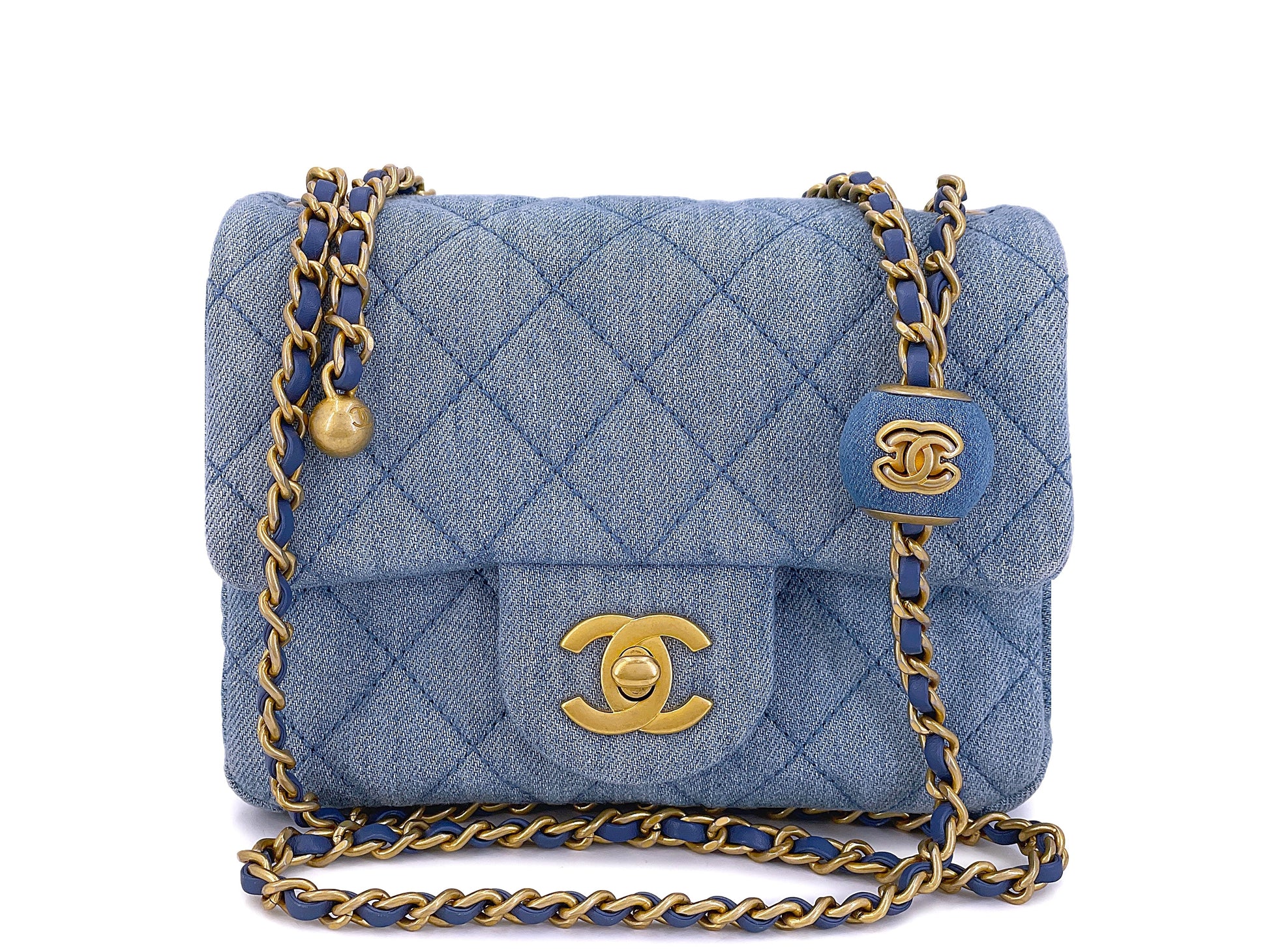 Chanel 22C Blue Denim Pearl Crush Square Mini Flap Bag GHW is whimsical in a bright blue denim and also the "pearl" ball wrapped in denim as well.
