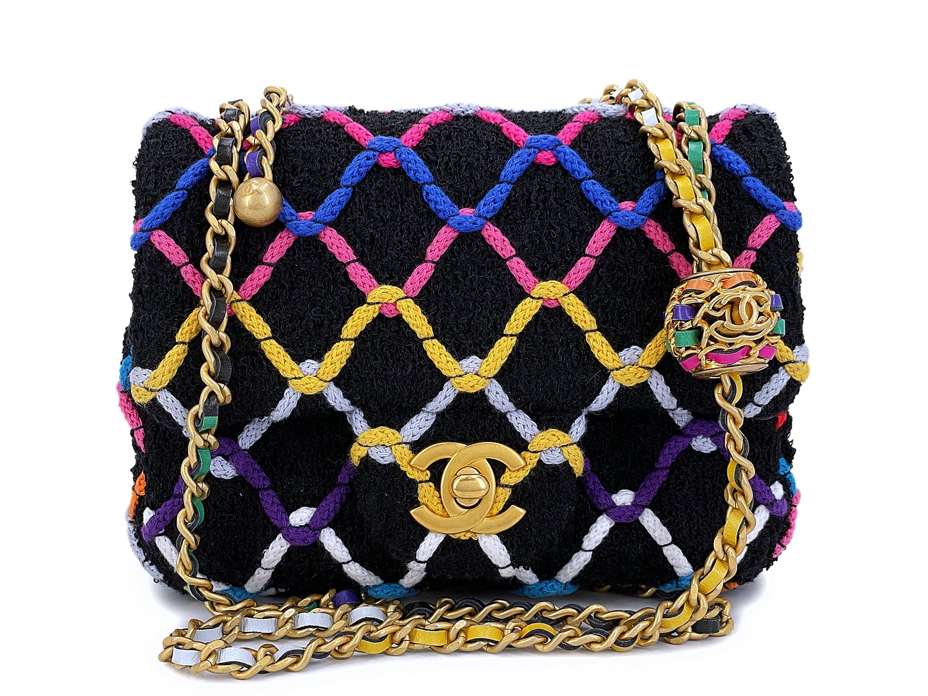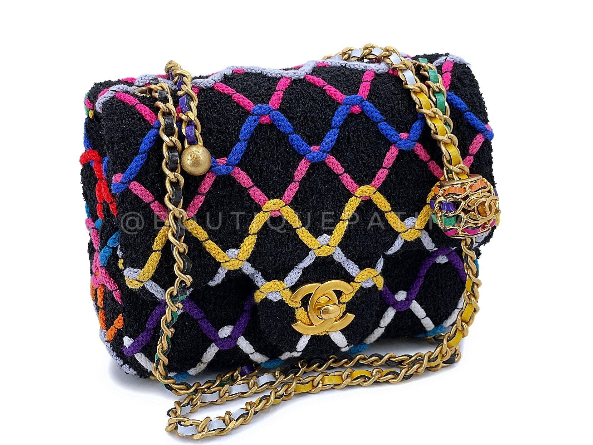 The Pearl Crush ligne with the adjustable etched ball charm on the chain strap has become very popular amongst Chanel enthusiasts for its ease of use but also for the versatility it brings to the bag - the chain can be adjusted to carry the bag as a waist bag or crossbody. Chanel 2022 Rainbow Multicolor Roped Square Mini Pearl Crush Flap Bag GHW is whimsical in a black textured wool with rainbow-hued "ropes" as quilts, a woven chain laced with rainbow hued leather and also the "pearl" ball wrapped in rainbow hued woven chains as well.