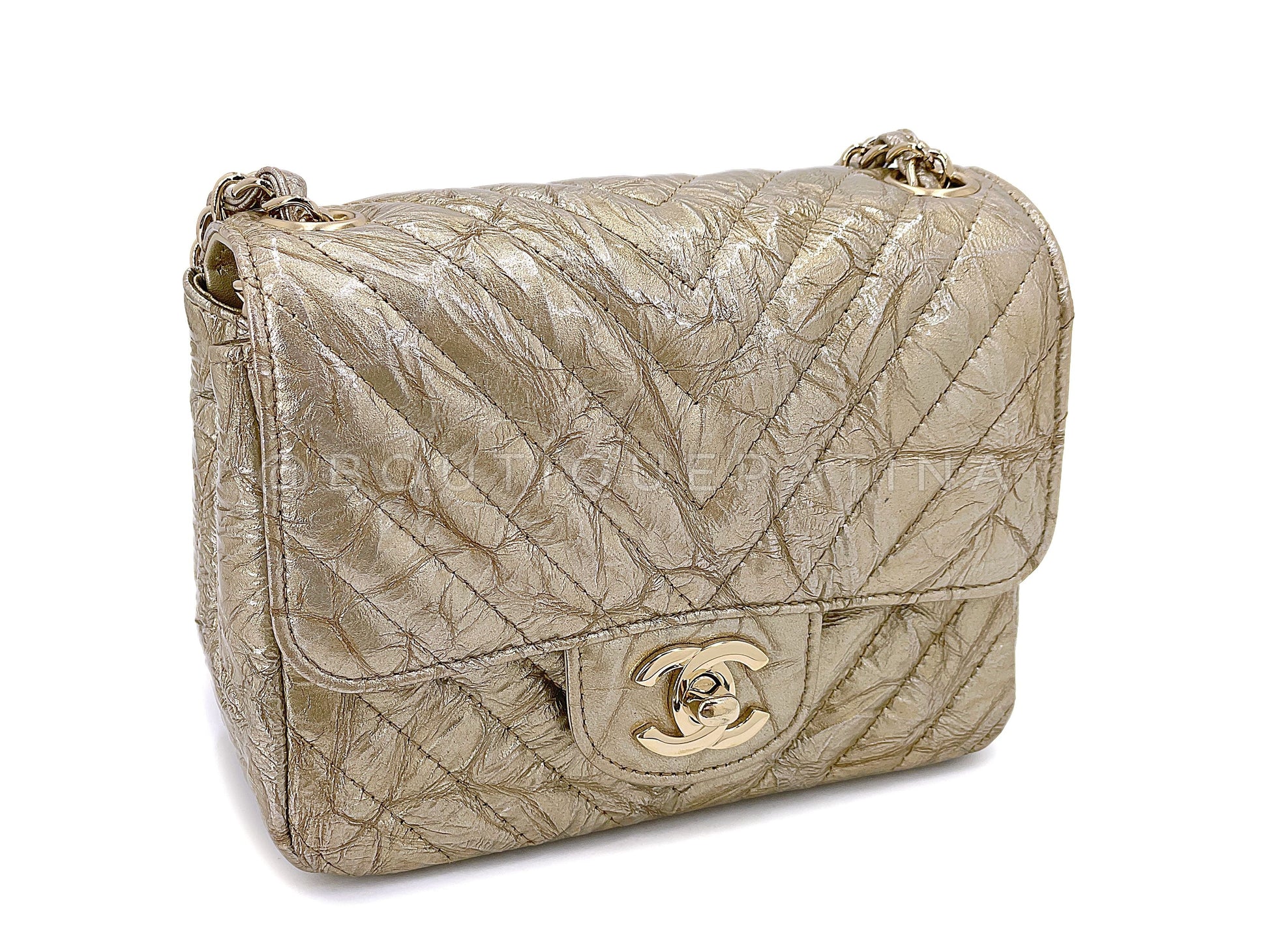 Chanel 18S Distressed Gold Crumpled Calf Patent Chevron Square Mini Flap Bag