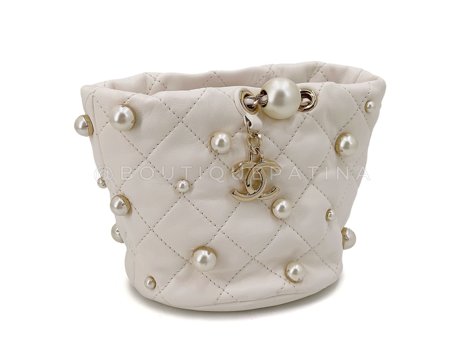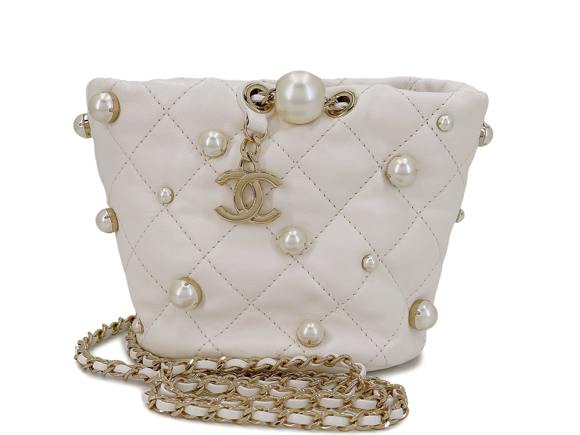 Chanel 21S White Cream About Pearls Bucket Bag Mini is a pillowy soft miniature bucket bag adorned with gold-pronged faux pearls and dangling CC charm hardware, with a woven crossbody strap.