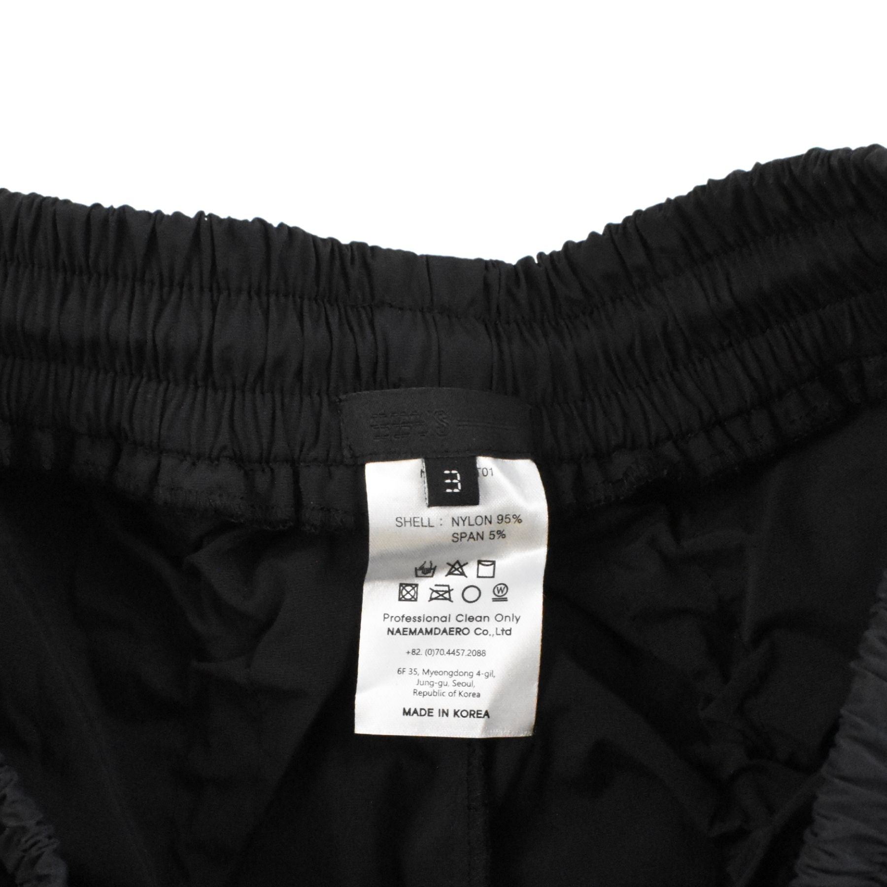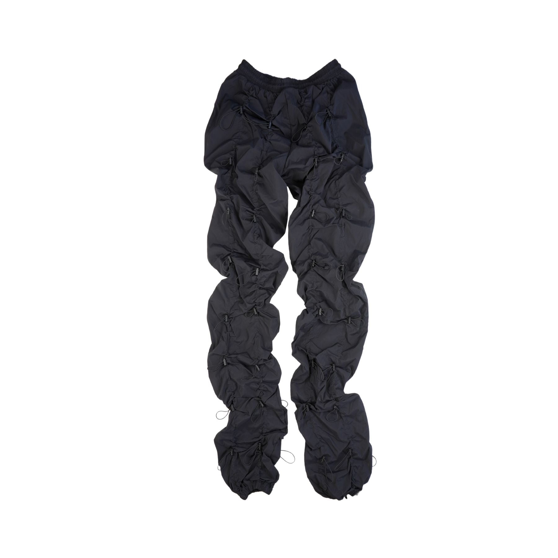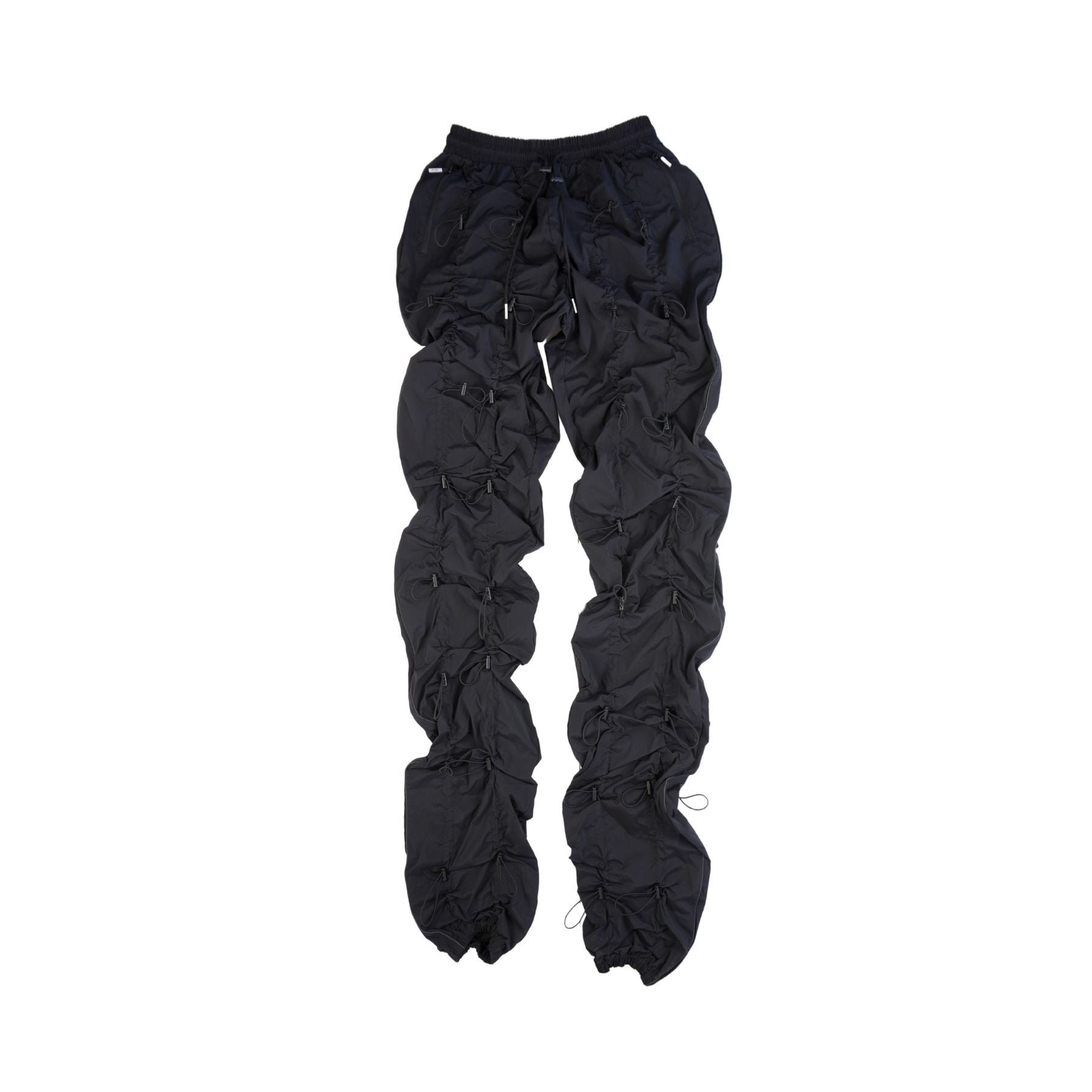 99% Bungee track pants in black nylon with a drawstring toggle detailing throughout and an elastic waistband.