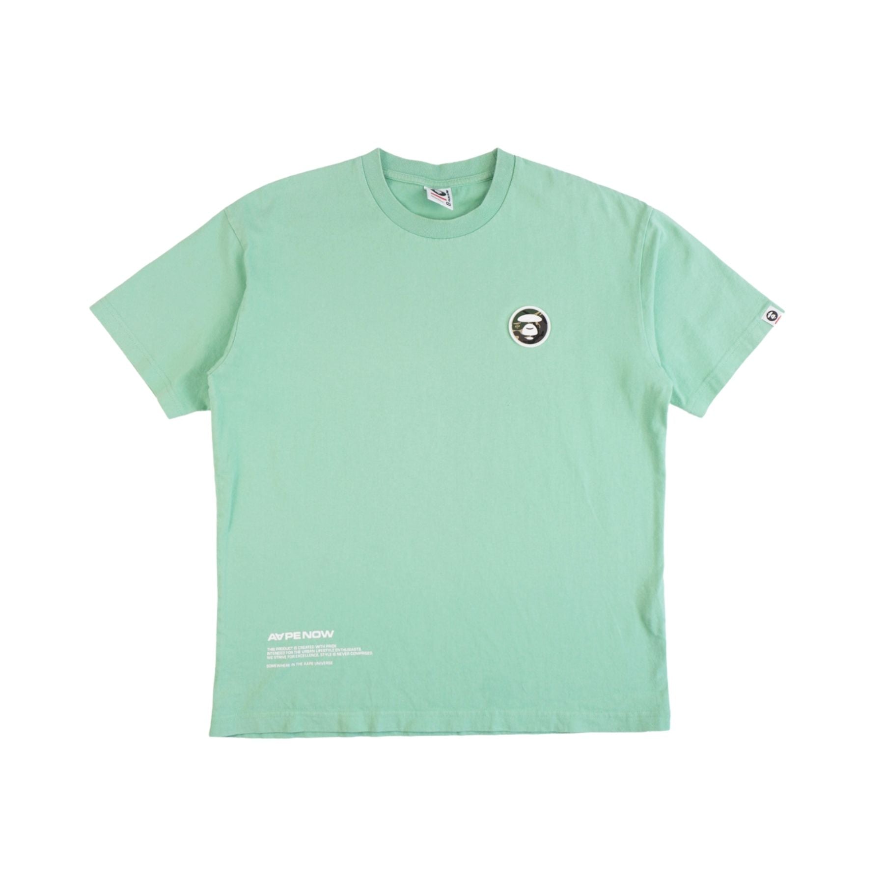 AAPE 'Badge' t-shirt in mint green cotton with a rubberized white and camo logo patch on the chest and a white text graphic on the front hem.