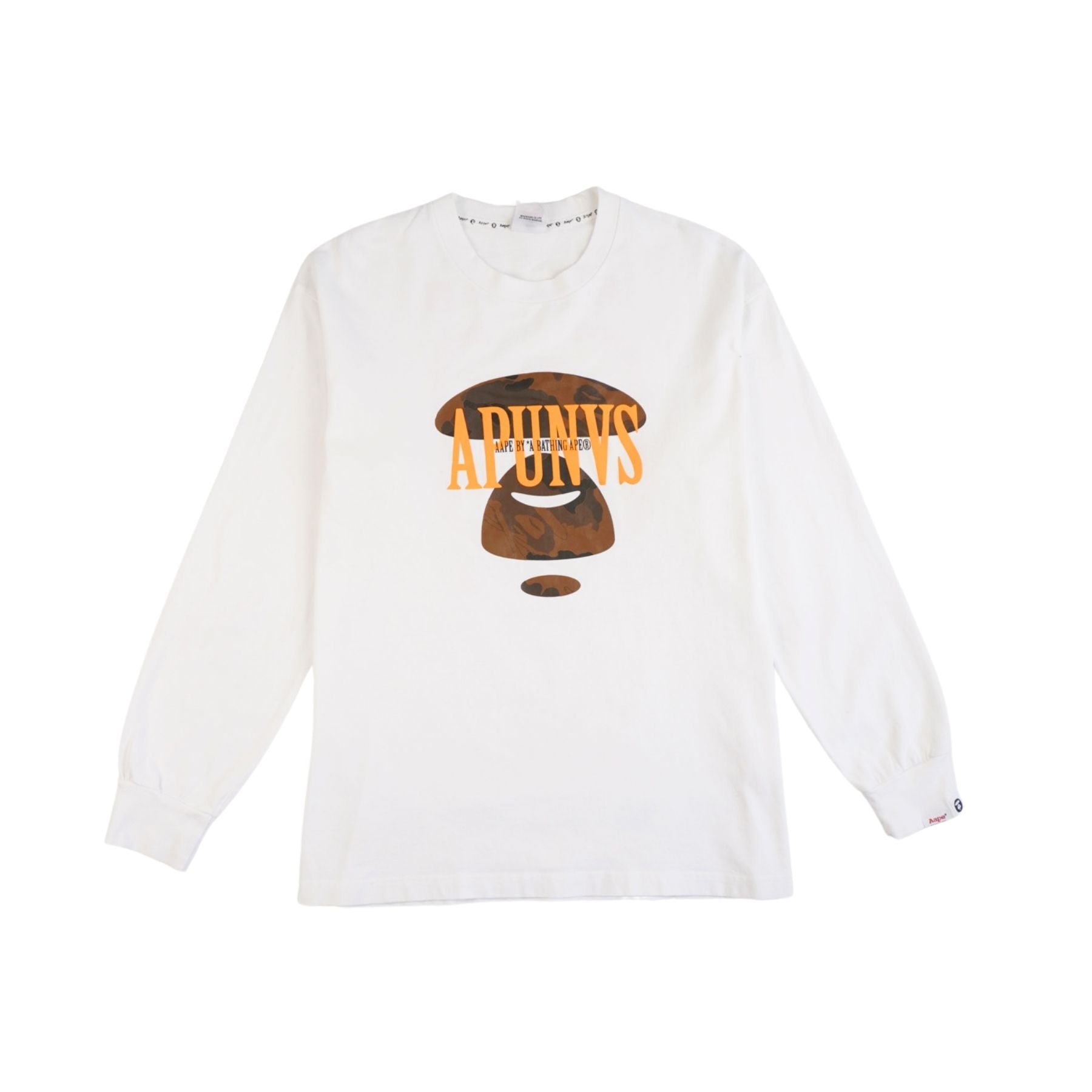 AAPE 'UNVS' long-sleeve t-shirt in white cotton with a brown camo ape face on the chest, orange logo text, and a large orange graphic on the back.