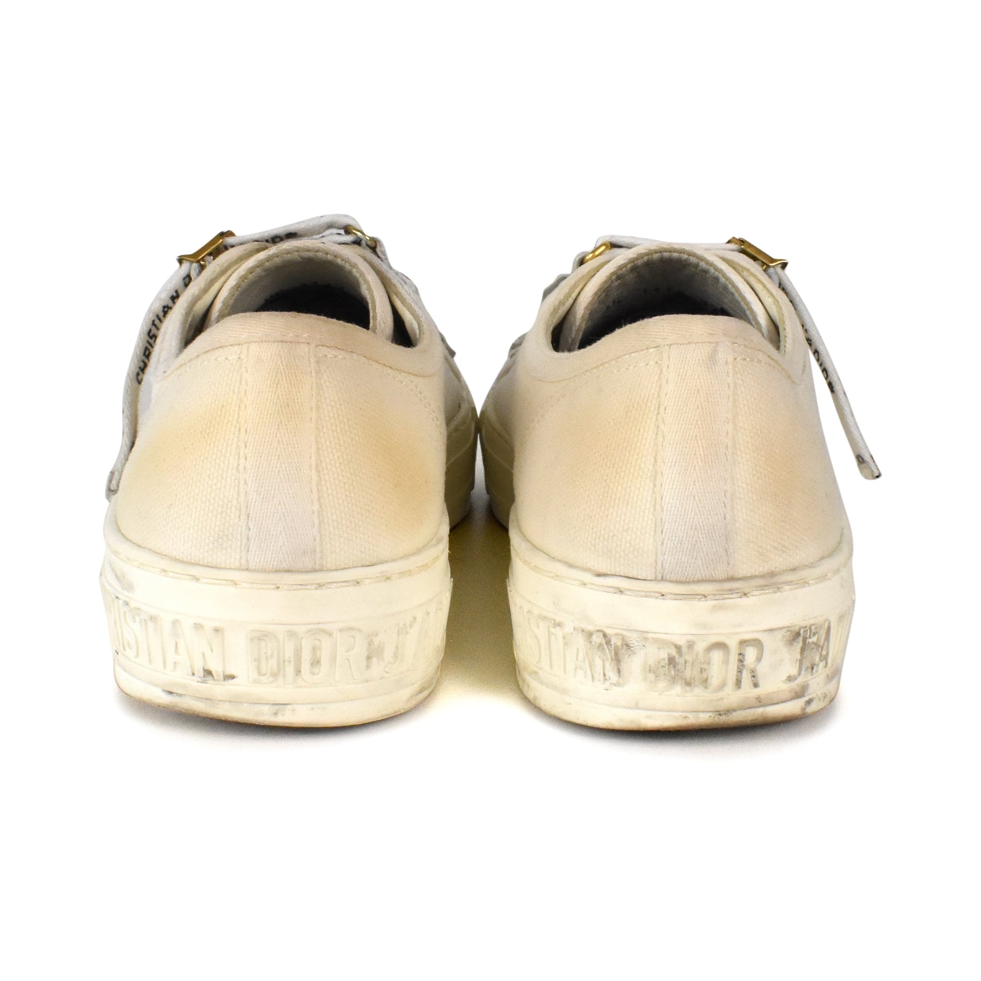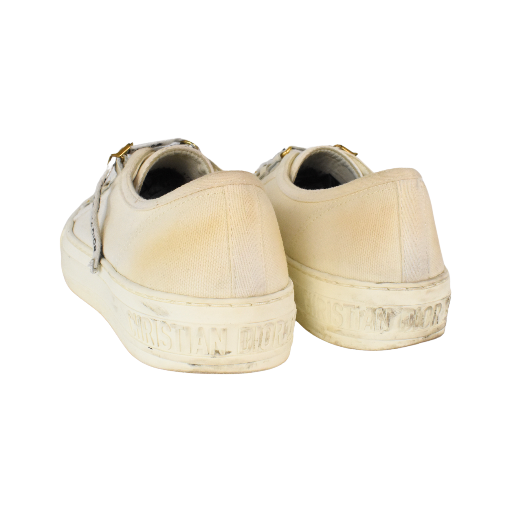 Christian Dior 'Walk N Dior' low-top sneakers in white canvas with white rubber sole and toe cap. Features leather eye-stays with gold hardware detailing, and white flat laces with black logo monogram. The laces can be adjusted with a buckle.