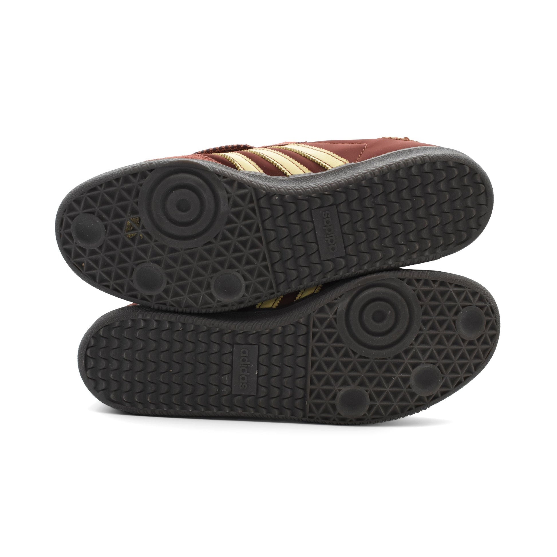 Adidas x Wales Bonner 'Samba' low-top sneakers in maroon red nylon with light maroon suede detailing. Features light yellow leather heel cap and stripes on the sides, blue satin inner lining, fold-over tongue, maroon flat laces, and black rubber sole.