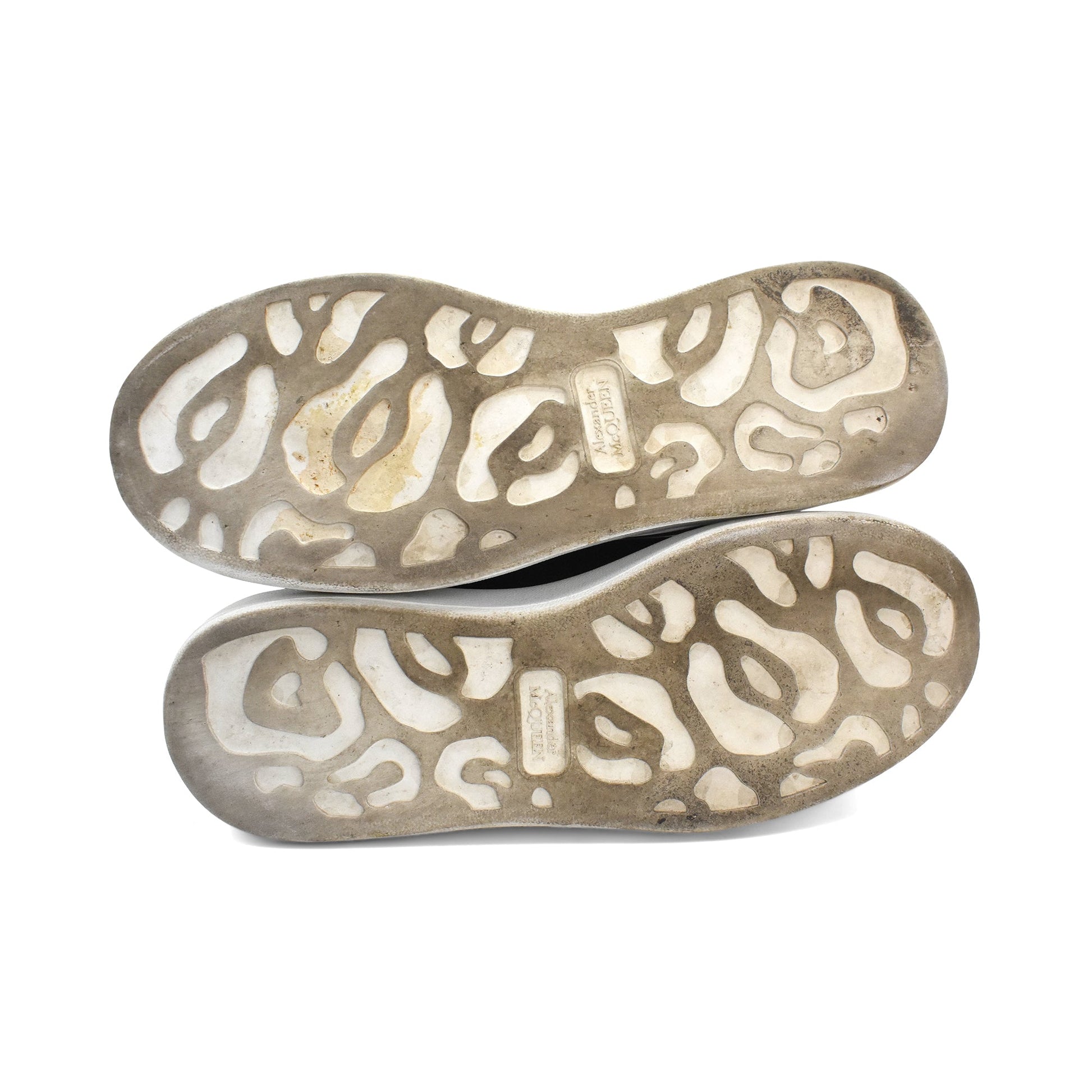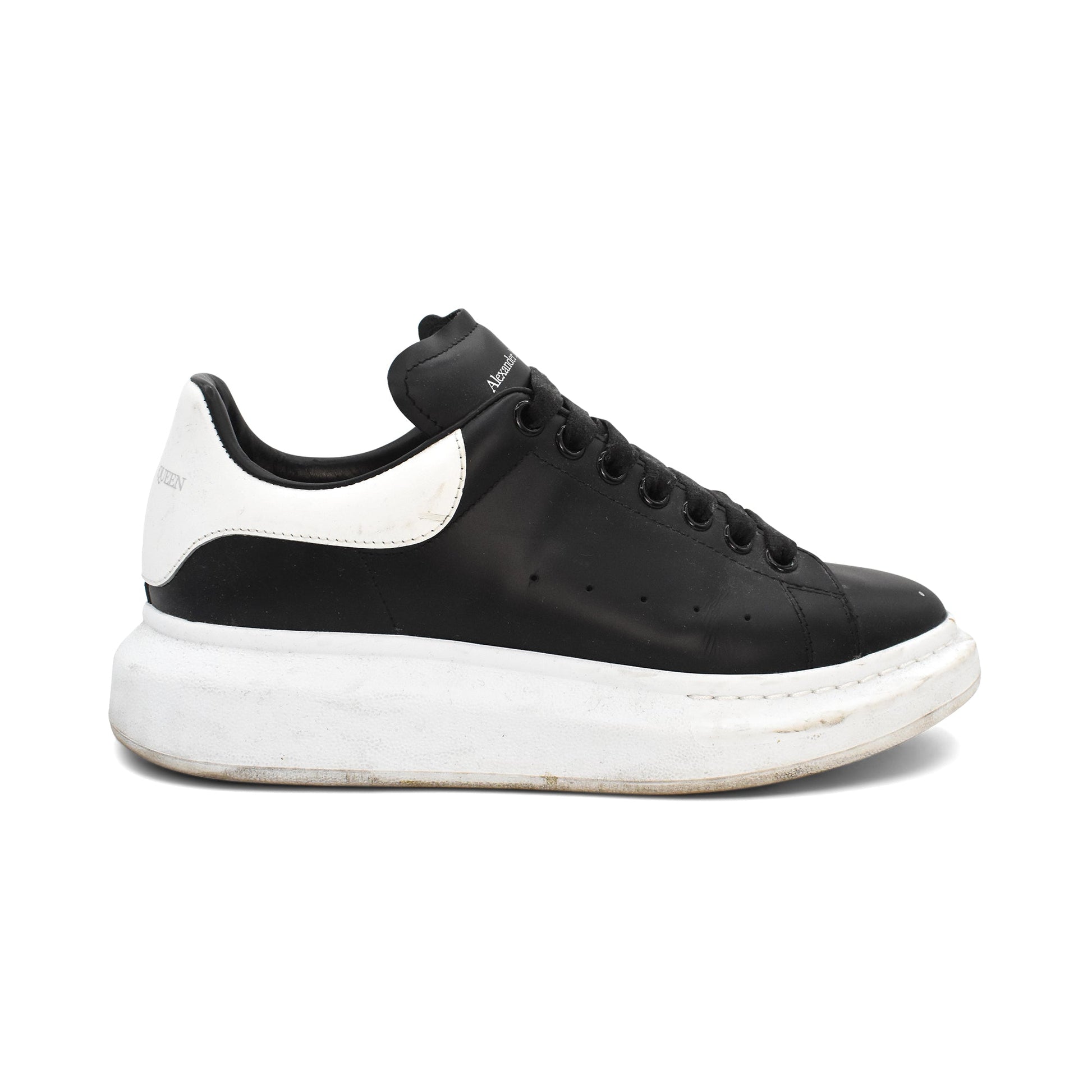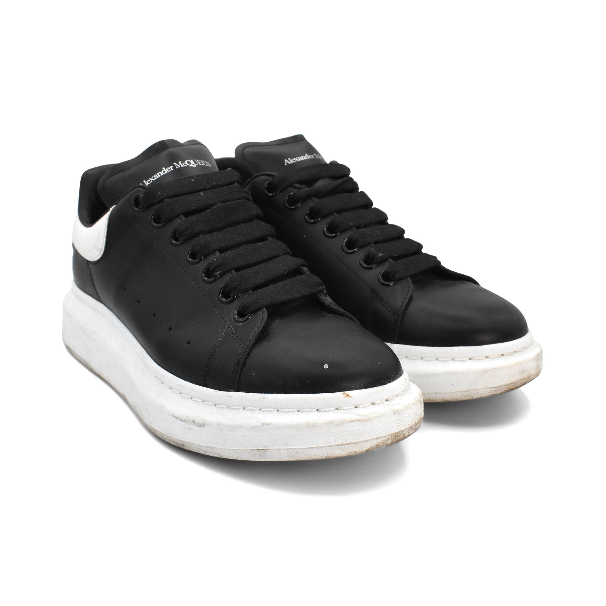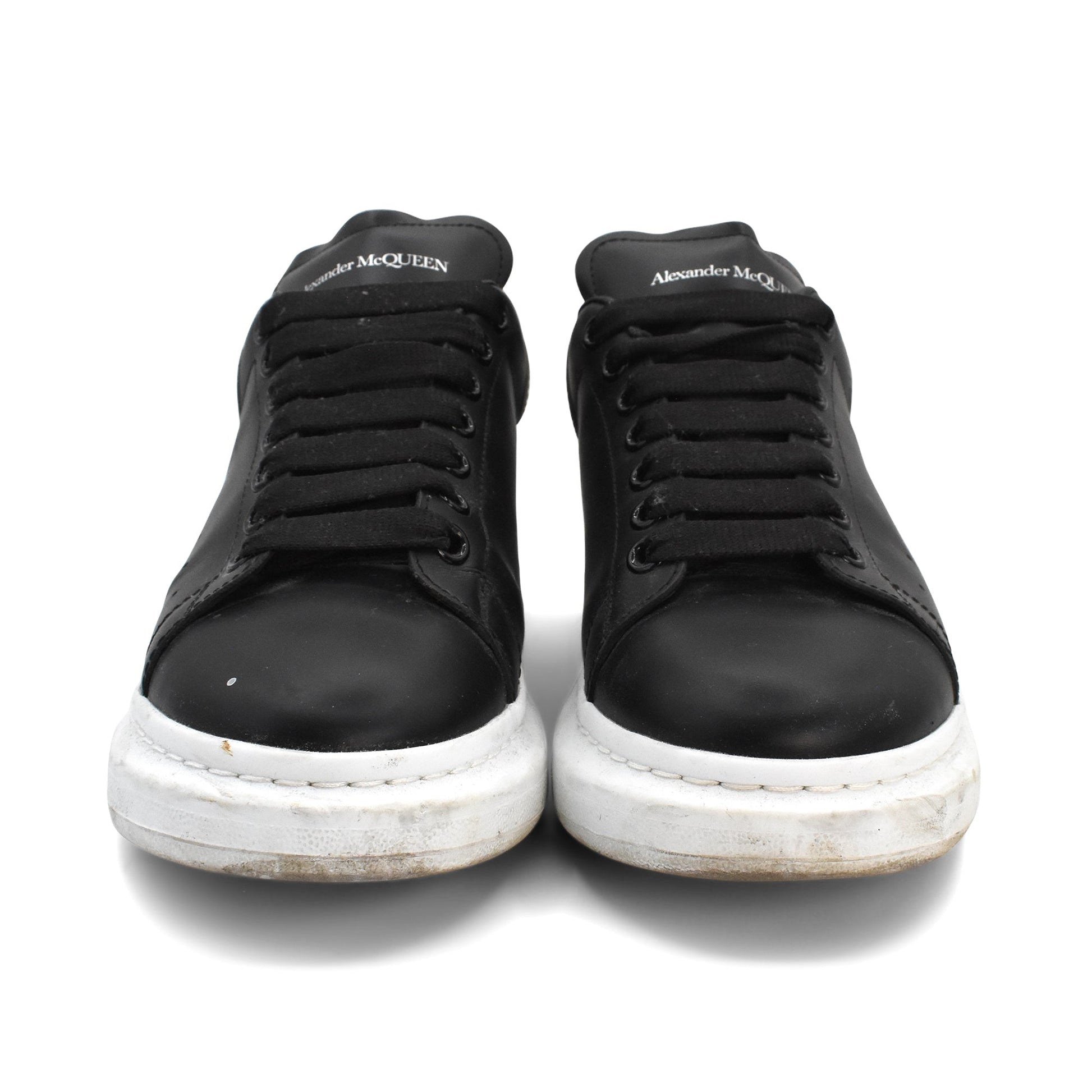Alexander McQueen chunky low-top sneakers in black leather with a white rubber sole and white leather heel cap. Features silver foil logo on the tongue and black flat laces.