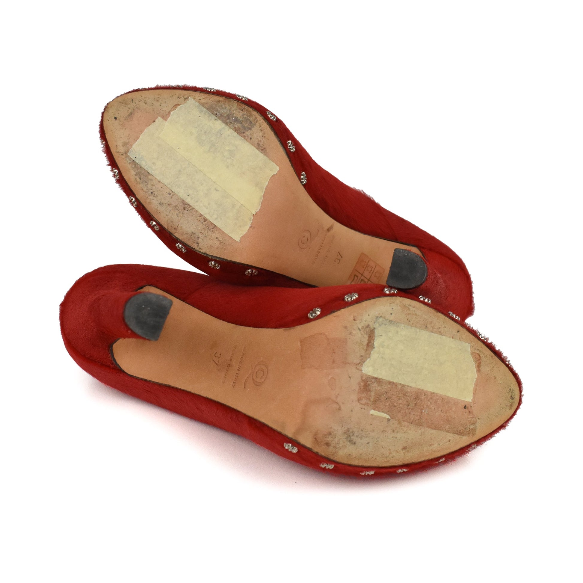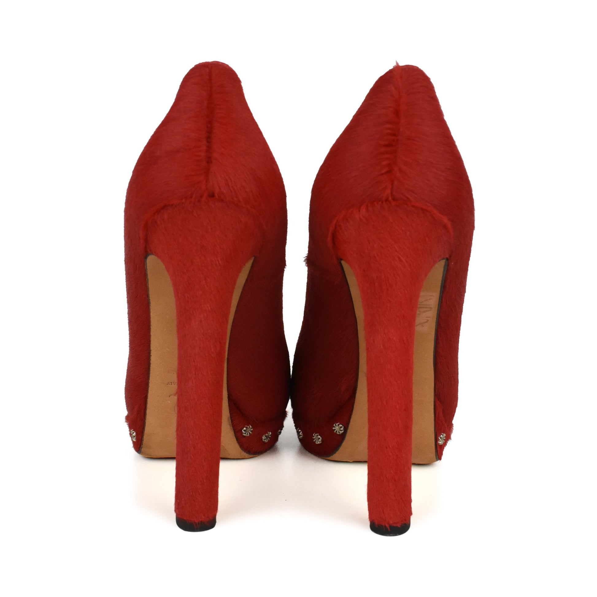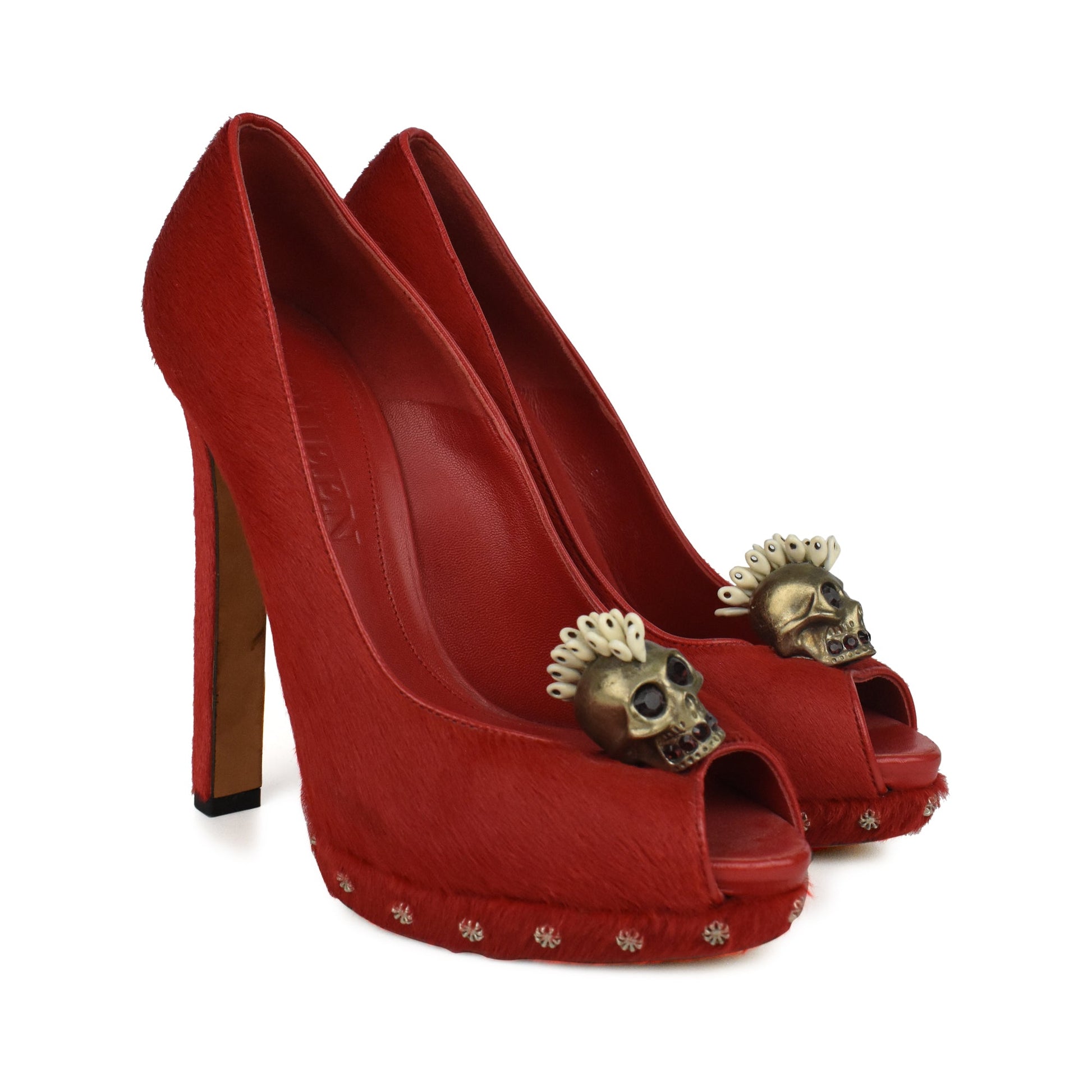 Alexander McQueen platform heels in red pony hair with leather trim, a metal mohawk skull embellishment, a peep-toe, and silver studding around the soles.