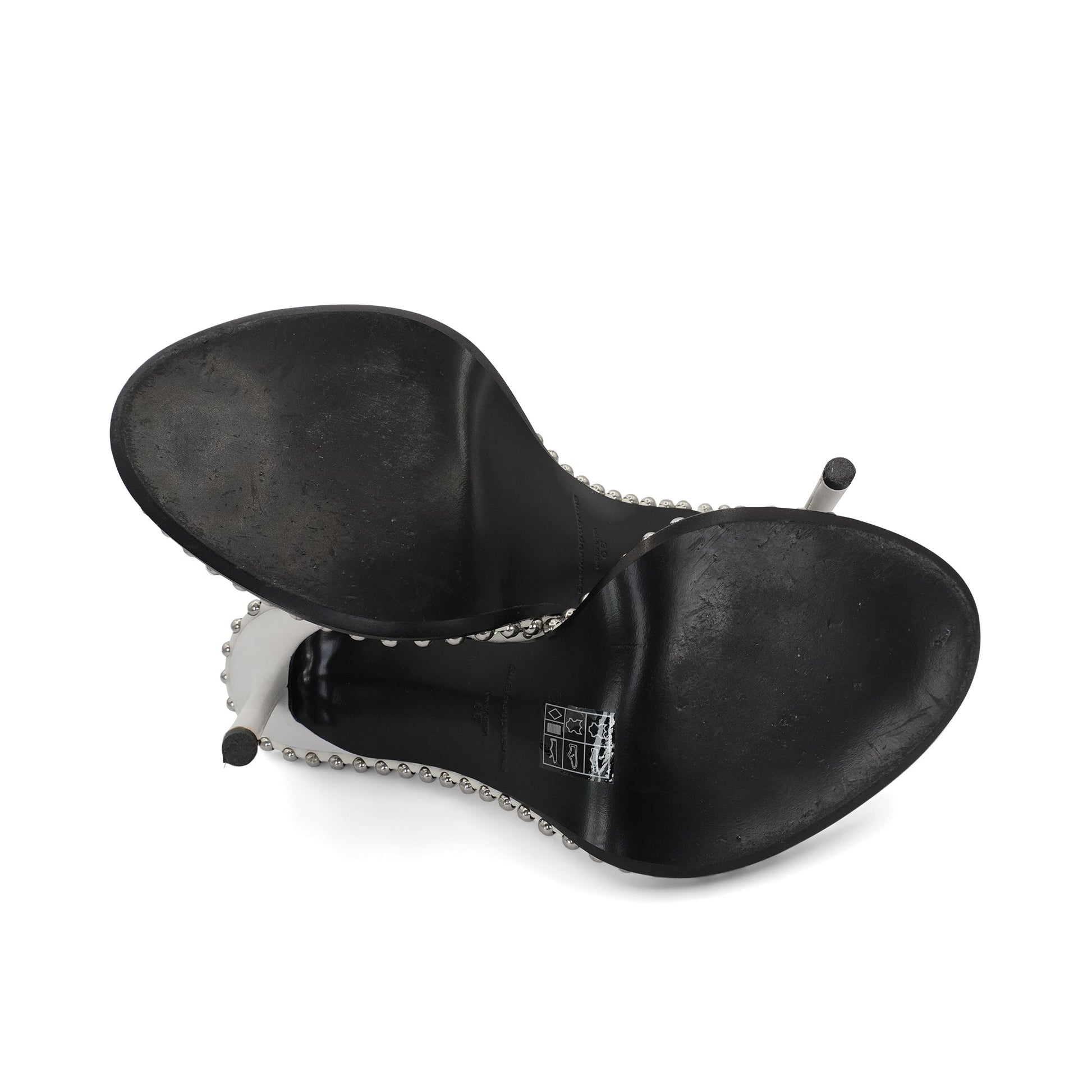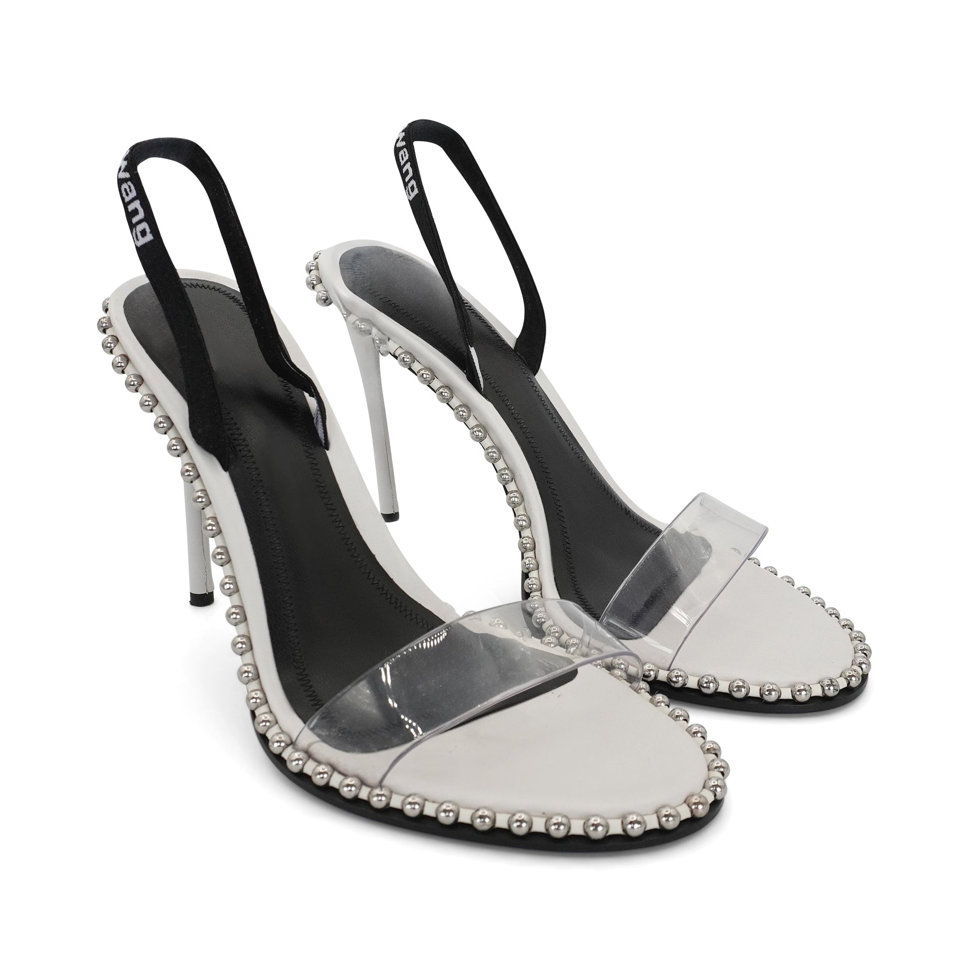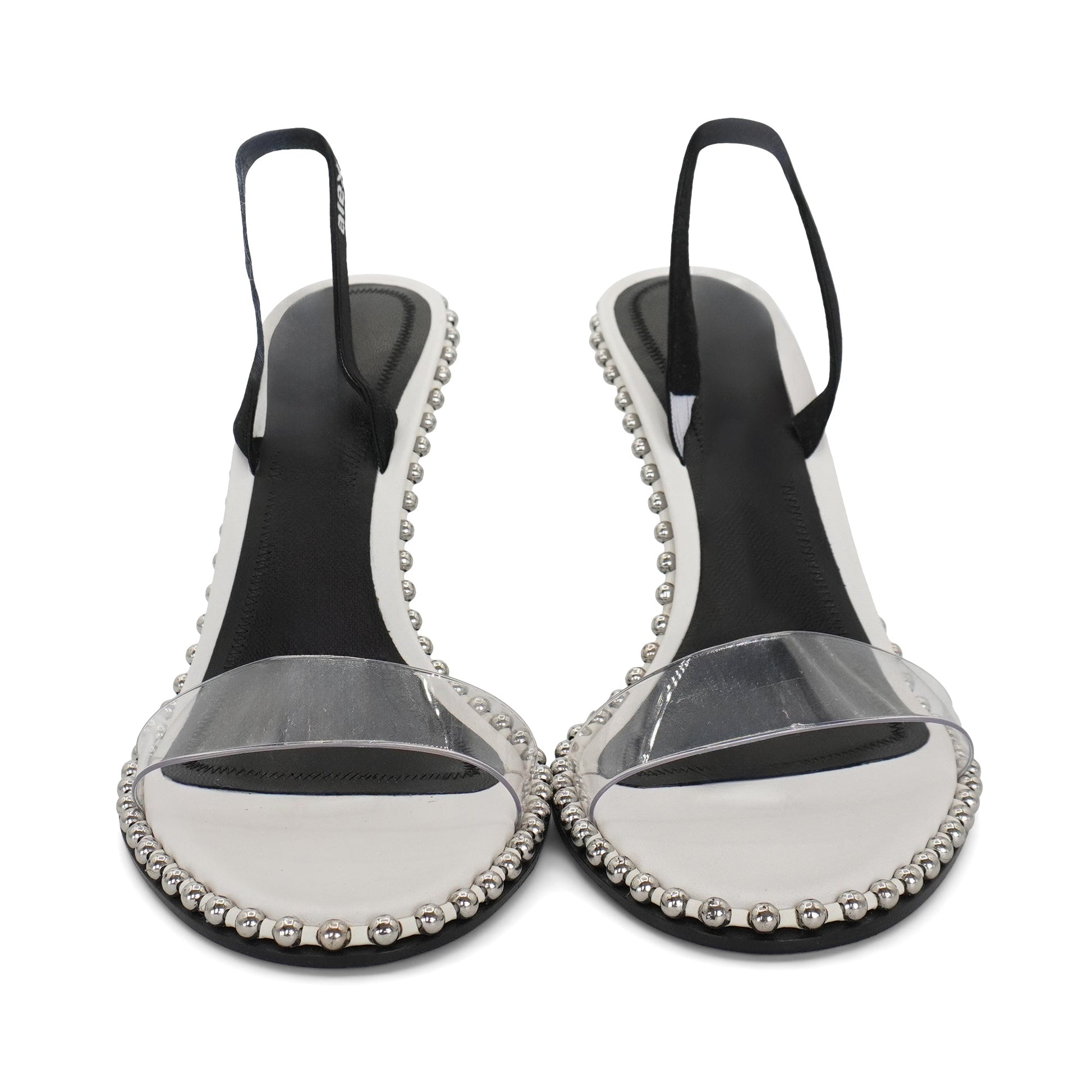 Alexander Wang 'Nova' slingback heeled sandals in white leather with silver ball chain trim, clear PVC toe strap, and black and white logo elastic slingback.